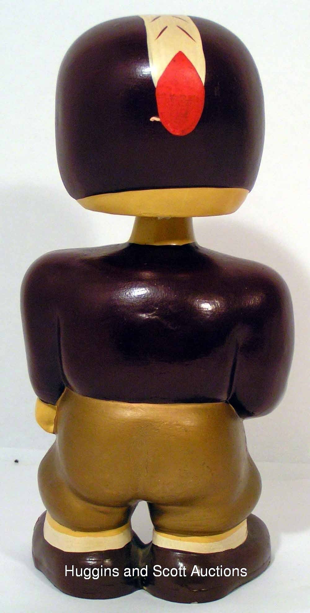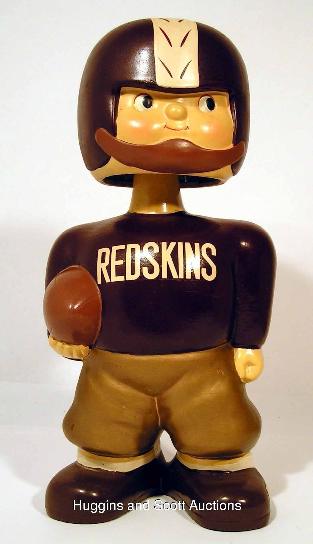 On very rare occasions in the sports memorabilia industry does the unquestioned signature piece in the industry come up for public auction. Remember the media circus surrounding the sale of the 1909-11 Honus Wagner T206 PSA 8, the premier baseball card in the hobby? Or the sale of Joe Jackson’s Black Betsy? Believe the hype, for this is a singular opportunity to own the “The Holy Grail of Bobbing Heads,” the original 15-inch Washington Redskins jumbo-sized promotional bobbing head doll. Over the past decade, as bobbing head dolls have gained in popularity, a handful of these oversized dolls have begun to surface. To date, this is the only Redskins promo to surface, a fantastic one-of-a-kind. These rare large bobbing heads are sometimes referred to as “airport displays dolls” and they are truly the toughest of all nodders to obtain in any condition. The normal-sized Washington Redskins dolls are among the most sought after dolls in the football bobbing head doll industry. This is the only known Jumbo Redskins doll that has been offered for public auction and it is a true gem!! The monster sized, papier-mache doll exhibits no cracks, no chips, no dents or other visible flaws. The pristine original paint still exhibits the glow and polish as it had in 1961. In shades of maroon and gold, with the sparse white and yellow trimmed attributes, this piece is absolutely breathtaking. Imagine owning the finest Babe Ruth autographed baseball, or the best 1952 Topps Mickey Mantle, the million dollar T206 Wagner; now imagine that it is MINT. As stated in Tim Hunter’s “Bobbing Head Dolls” price guide, this doll is the only known ‘Skins promo doll in the hobby and was located many years ago at the Washington National Airport (now Reagan Airport). This auction house sold this beauty before and with vigorous majesty, we will sell it again. With our hobby being almost as much ego as it is substance, we can proudly provide the sounding board for the eventual winner that this is the paramount object to behold. This doll was on display at this years National Convention, in Chicago, and drew “Mona Lisa” like raves from all who laid eyes on the crown jewel. Regardless of what this sells for, 5 or even 6 figures, how can you put a price on such exquisite beauty? We are about to find out.
