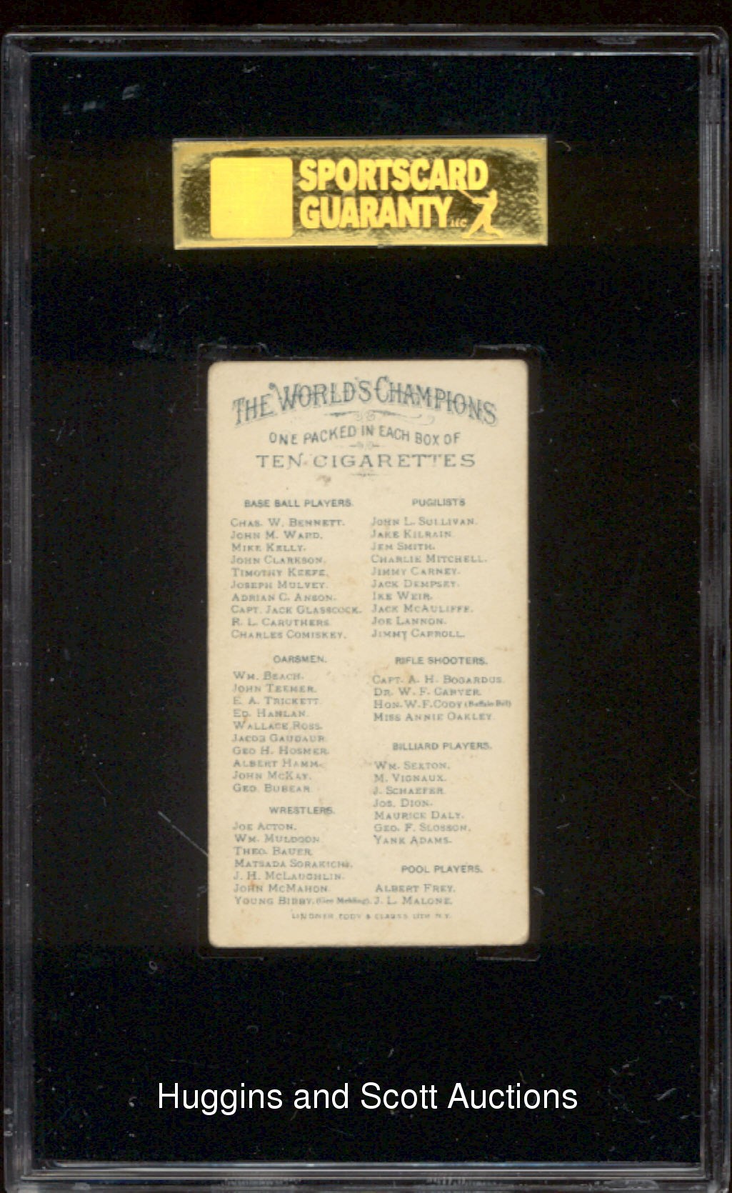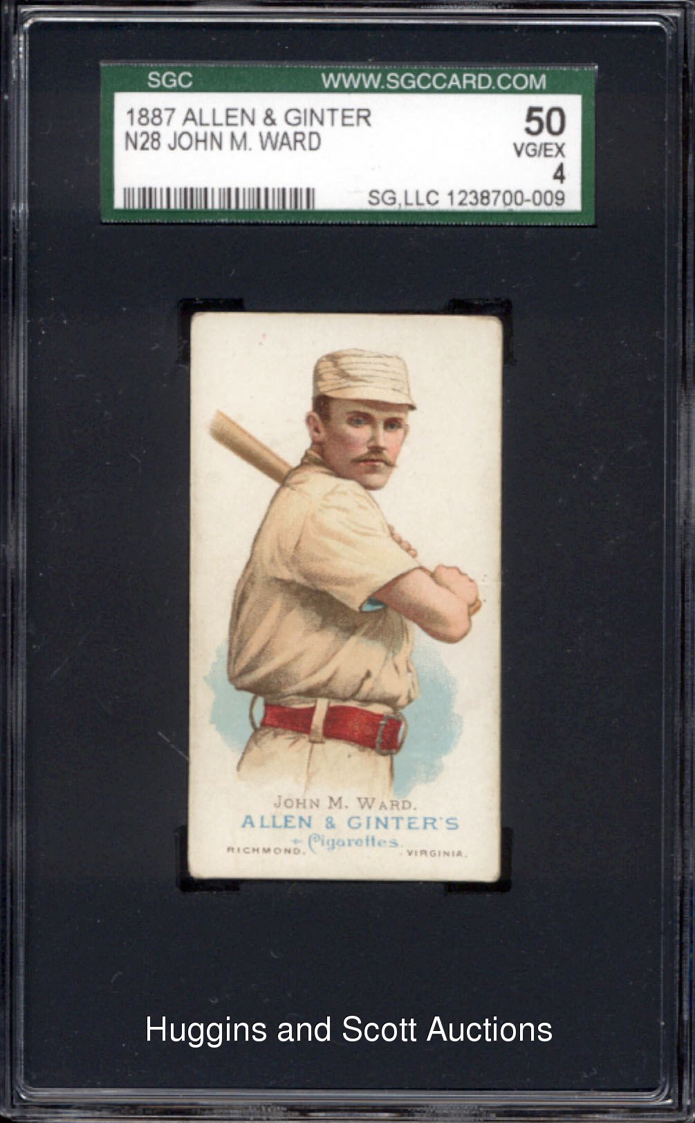 Graded VG-EX 50 by SGC. John Montgomery Ward was a rarity in 19th Century baseball; he was a college-educated man that chose baseball over business. His distinct nature and leadership brought about the first players’ revolt during the 1890s as he started the Players’ League to get the players a larger share of the gate receipts. Little kept Ward from greatness, as he was a Hall of Famer both on and off the field. The offered 1887 Allen & Ginter N28 John M. Ward (SGC 50) features a clean face and sharp reverse while it exhibits only light corner wear.