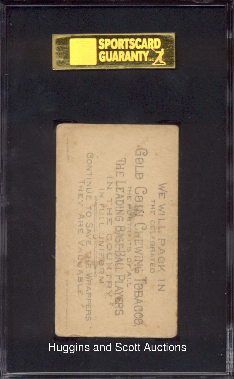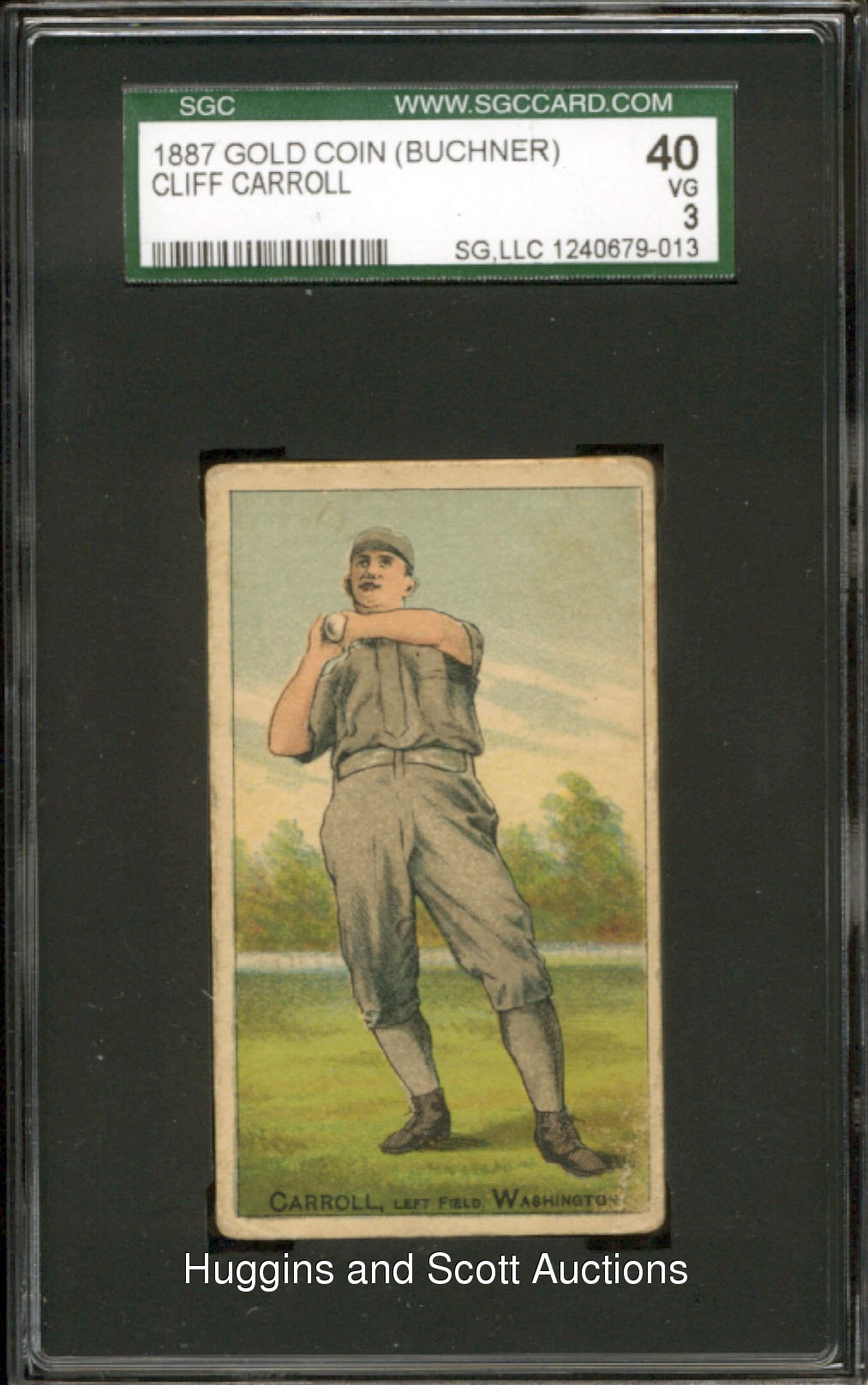 Now 119 years old, this 1887 card of former Washington leftfielder, Cliff Carroll has been graded an SGC 40 VG 3. Carroll actually has found himself in the baseball record books - he led the National League in singles and at bats in 1890. Originally packed in Gold Coin Chewing Tobacco, these are rare in grades much higher. We should all look this good approaching our 120th birthday!
