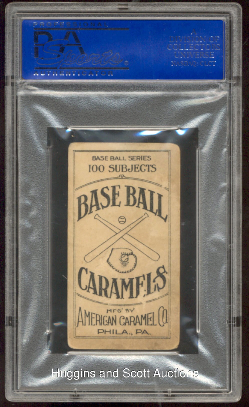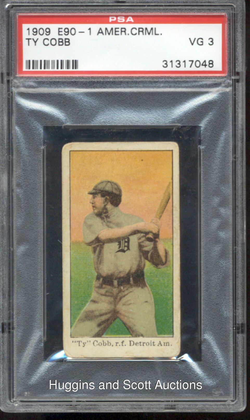 Graded PSA 3 VG. Ty Cobb was the most ferocious player to ever lace up freshly sharpened spikes and definitely worth the price of admission. More feared than admired in his era, Cobb is now one of the most sought after cards among vintage card collectors. The offered relic is a stellar example of the American Caramel series and depicts Cobb in a batting pose. The card is sharp with light wear on the edges and corner, near perfect centering and good color. There is security in knowing that this wonderful 95-year-old card has remained unaltered and in beautiful (VG) condition.