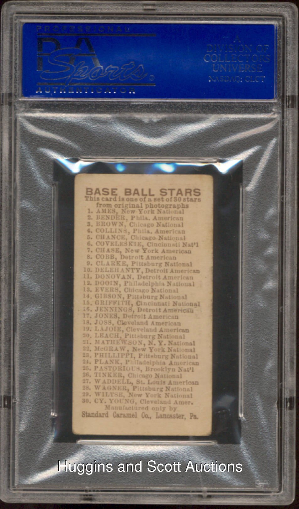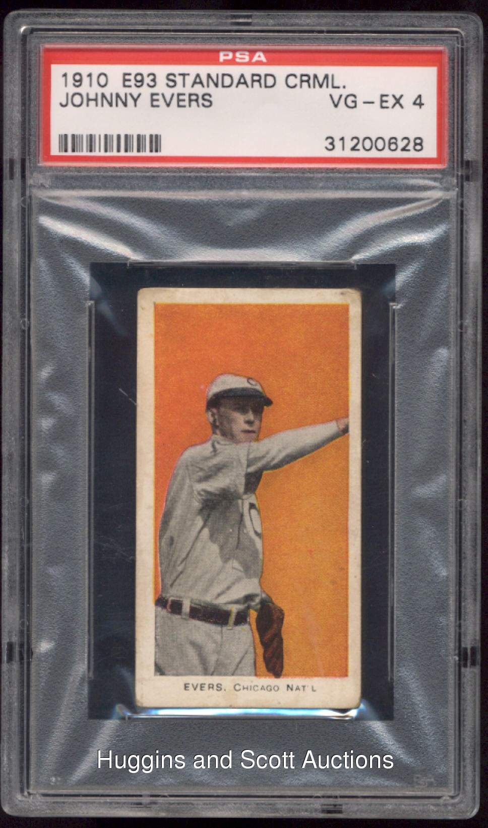 Graded PSA VG-EX 4. The rise to prominence of the E-series candy cards is the worst kept secret in the hobby. For many years, the Standard Caramel cards have been overlooked in lieu of the T206 issues of the same era, now it is the candy cards turn. The offered Johnny Evers example is fantastic, well centered, clean and exhibits fine color contrast. Evers is in the throwing pose and the reverse is as sharp as the front. Just beautiful!