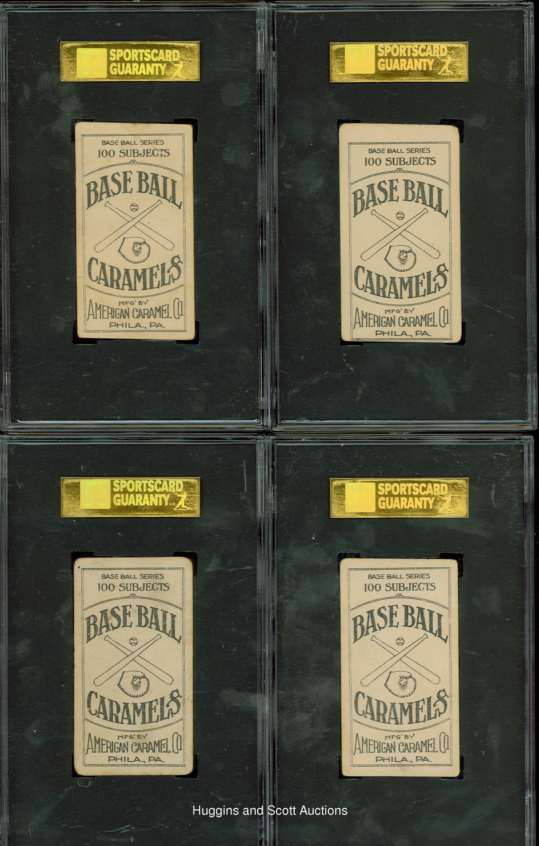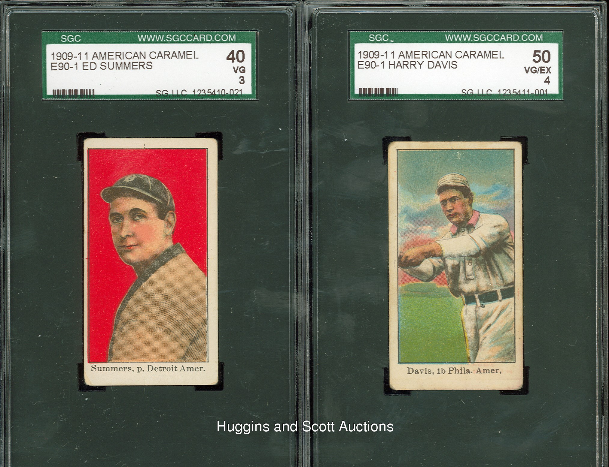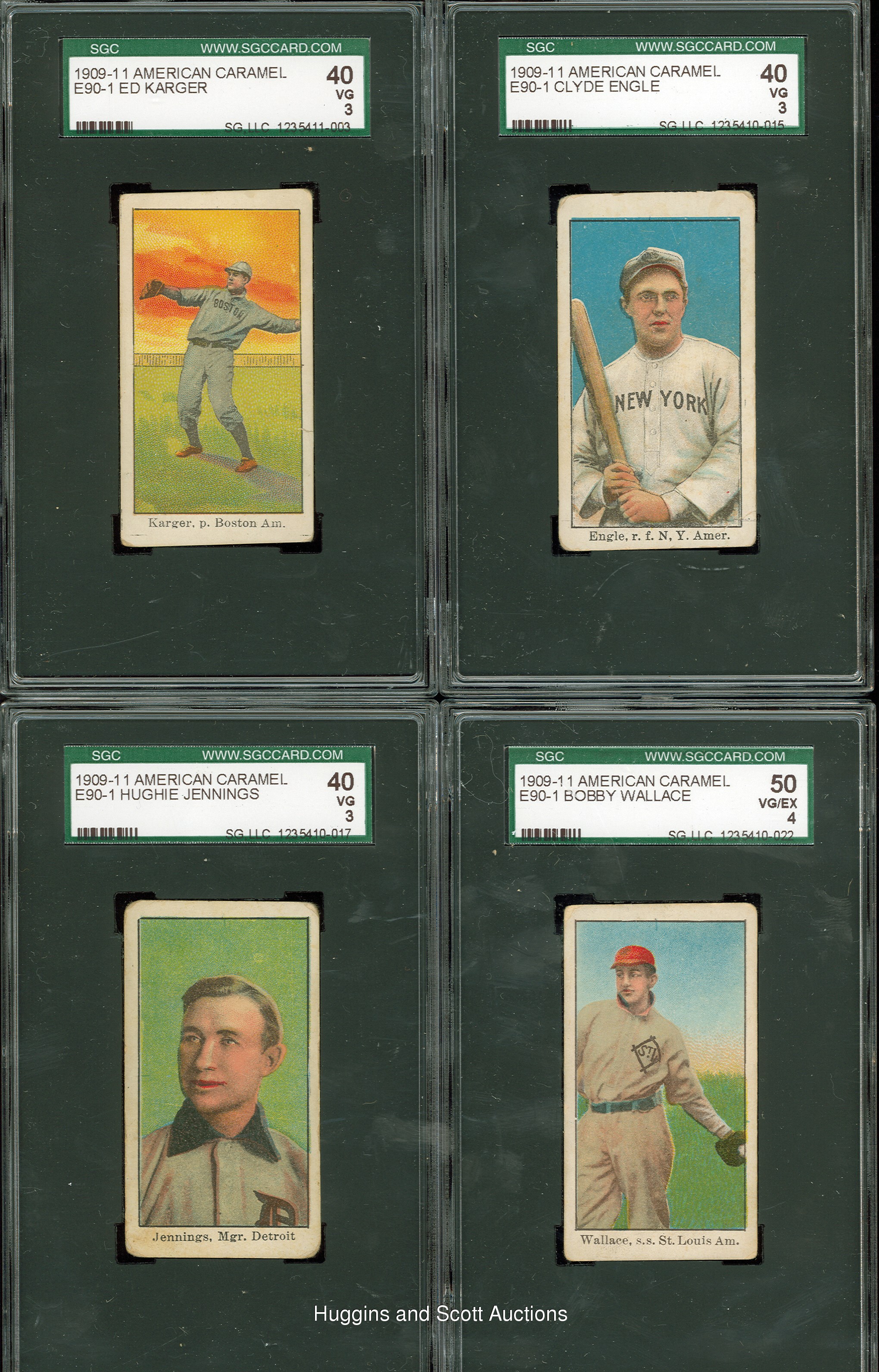 This is a fine collection of six tough 1909-11 E90-1 American Caramel cards with two HOFers and one of the tougher singles in Ed Karger. The collection has all been graded by SGC and comprises: Bobby Wallace (SGC 50), Harry Davis (SGC 50), Hughie Jennings (SGC 40), Clyde Engle (SGC 40), Ed Karger (SGC 40) and Ed Summers (SGC 40).