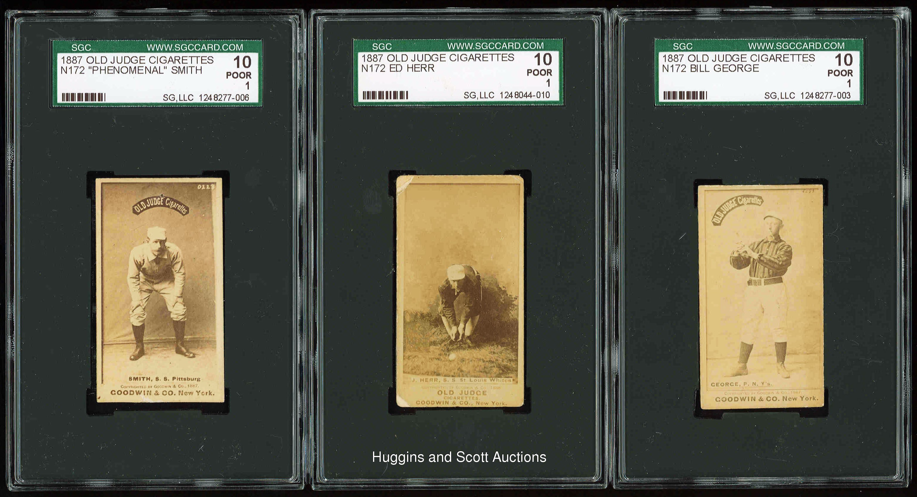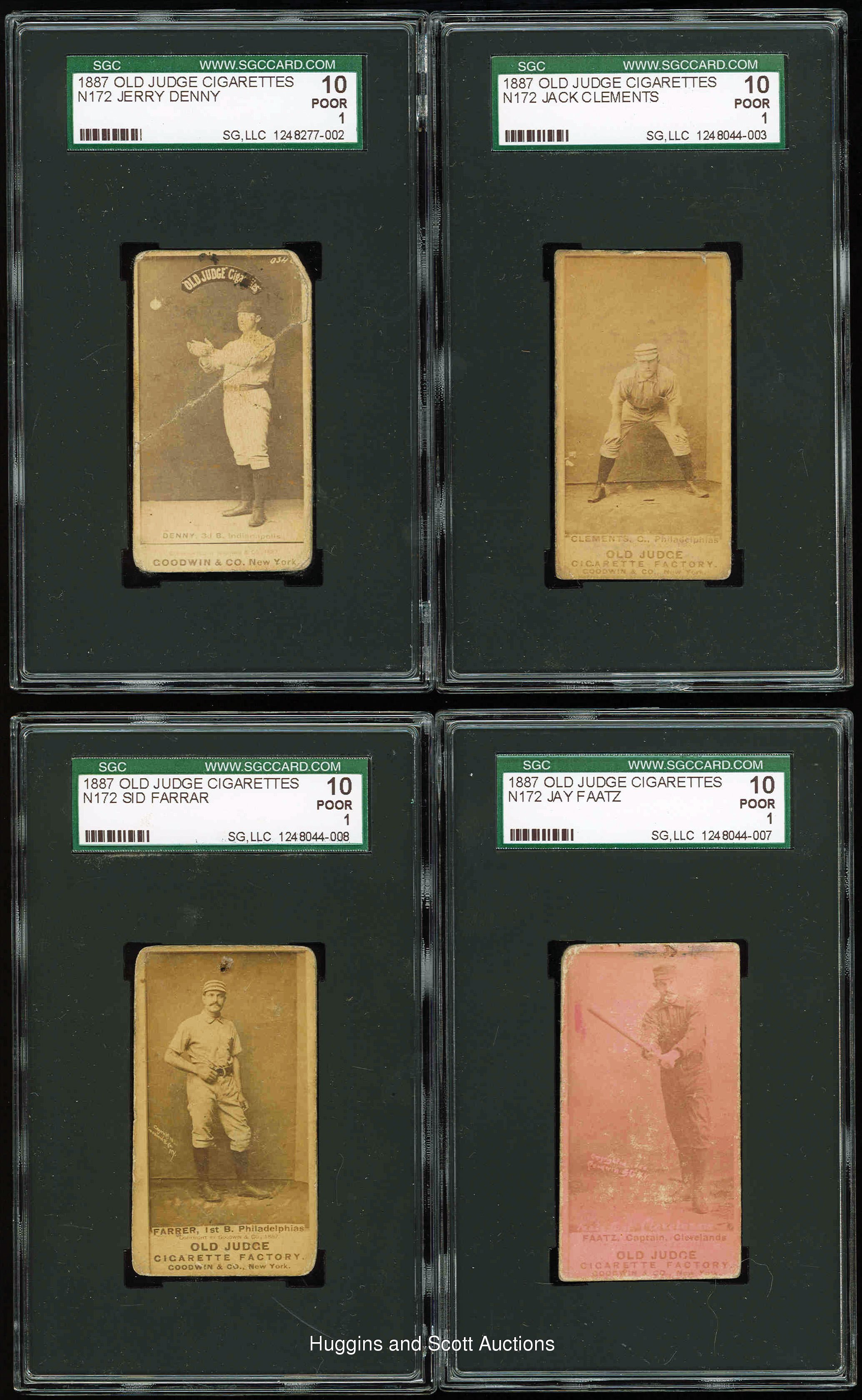 THIS LOT HAS BEEN MODIFIED FROM THE PRINT CATALOG Presented are seven 1887 N172 Old Judge singles that were each graded SGC 10 by the third party service. Each card presents some back damage or writing, placing the card in the SGC 10 range. Included are Jack Clements, Jerry Denny, Jay Faatz, Sid Farrar, Bill George, Ed Herr and POP Smith. This collection is quite possibility the most attractive group of SGC 10s on the market.The labeled "Phenomenal" Smith card is mislabeled by SGC - the card is actually of "Pop" Smith.