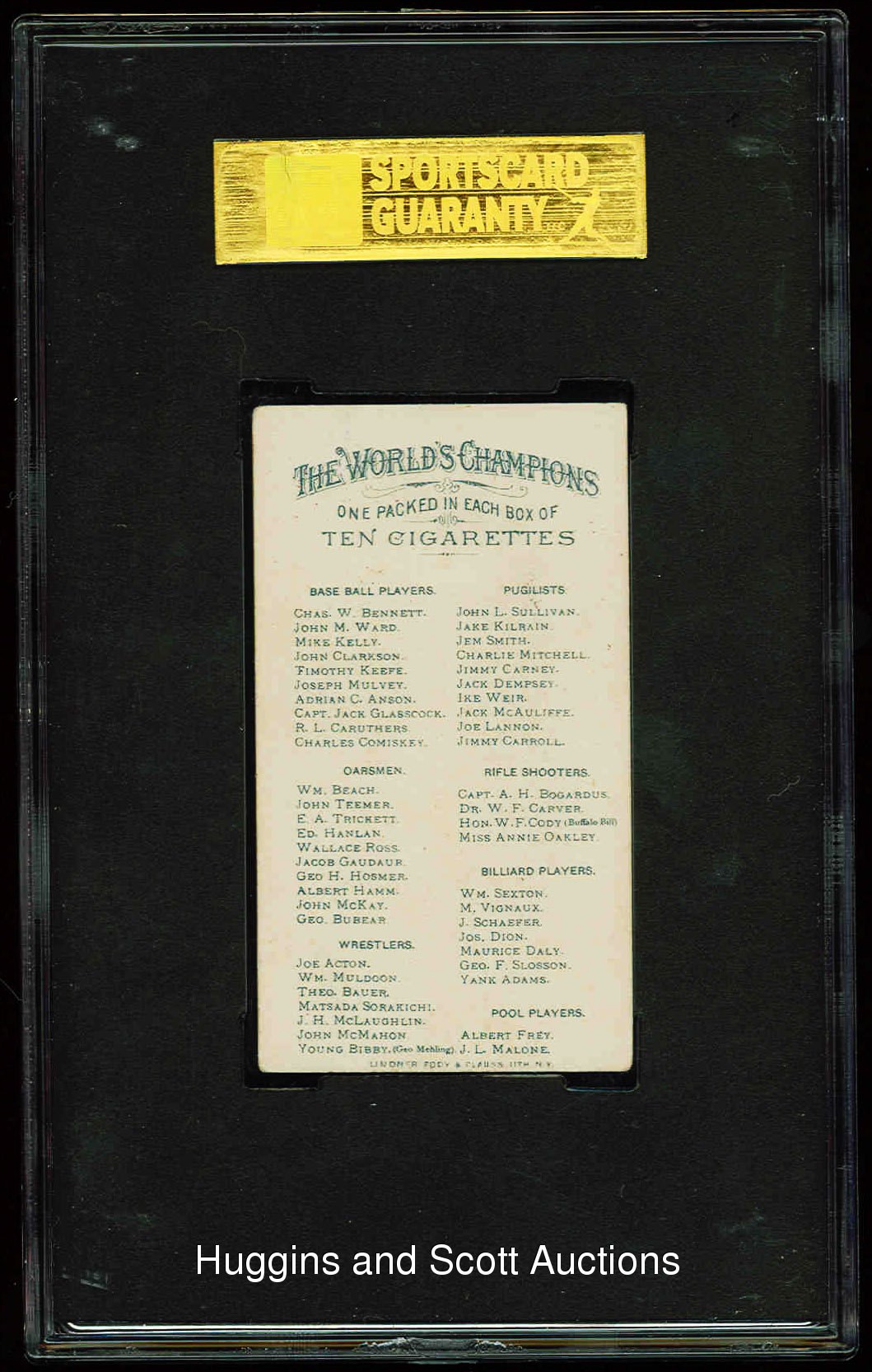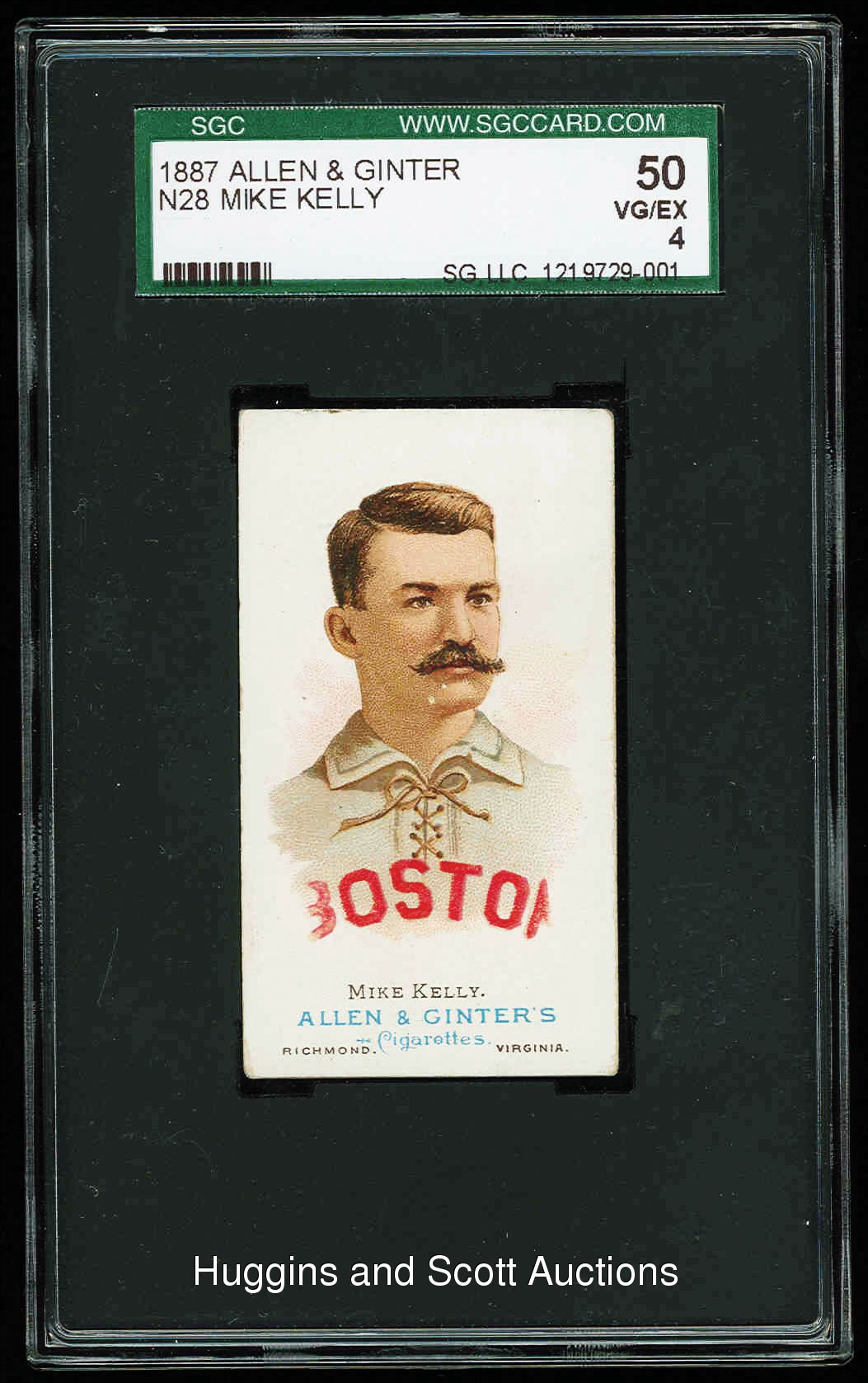 Featured is an 1887 Allen & Ginter N28 of Mike "King" Kelly. Appropriated deemed a "50" by SGC, this preeminent card depicts "$10,000" Kelly at his finest. With a crystal clear back and a spot of paper loss on the front, this vibrant keepsake contains an immense image of the Boston slugger. A quintessential Kelly piece, this Nineteenth Century relic is equally impressive as it is scarce.