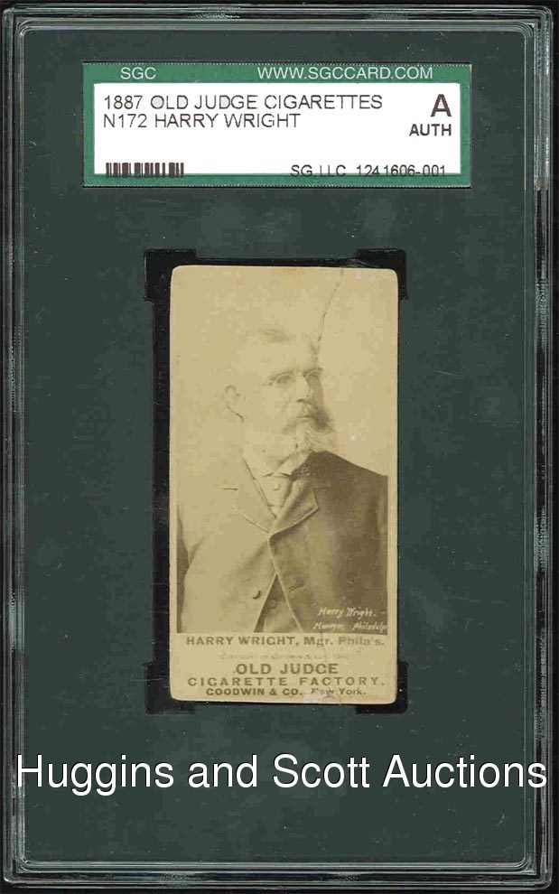 As one of the most influential figures in baseball history, Harry Wright steered the game from a local interest to the national spotlight as the manager of the famous 1869 Cincinnati Red Stockings. Wright organized his team and was the first to pay players for their services. Henry Chadwick went so far as to call Wright the “father of baseball”. This example of the very popular 1887 Old Judge N172 Harry Wright shows the great man as the manager of the Philadelphia club and has been graded authentic by SGC. The card is quite clean and crease free but has been slightly altered at the corners.