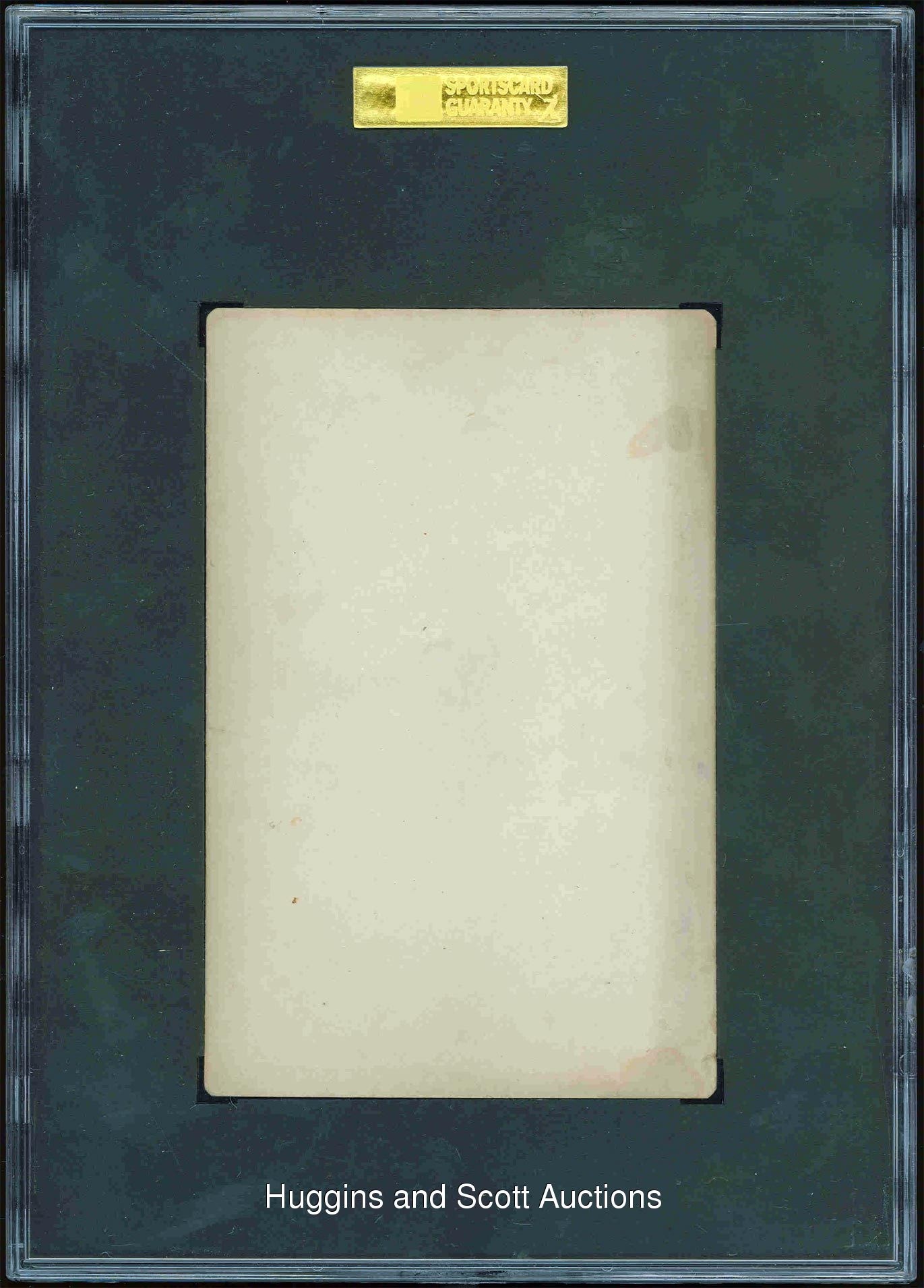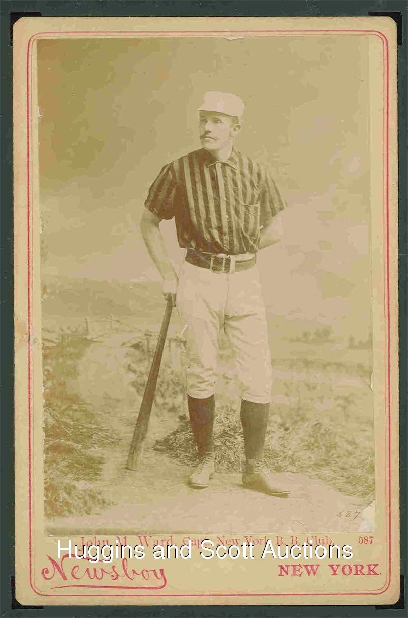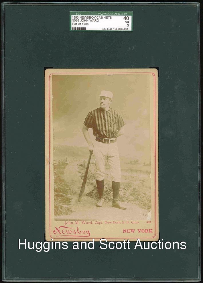 More stunning than any modern card could ever aspire to be, this 1895 Newsboy Cabinets John Montgomery Ward card displays an engrossing image of the leader of the player’s league. To be precise, cabinets are photographs mounted on heavy cardboard stock and known as such supposedly because they were often displayed in cabinets. A cabinet photograph is smaller than an imperial photograph but larger than a carte de visite. These popular 1895 Newsboy cabinets were given away as premiums when making a purchase of plug tobacco products produced by the National Tobacco Works of New York. The American Tobacco Company later acquired this firm. The complete Newsboy series contained over (500) different subjects including actresses, politicians and celebrities of the era, but the fourteen baseball subjects are the most highly prized in the entire set. Offered is a very attractive 1895 N566 Newsboy Cabinet #587 John M. Ward (bat at side) that has been graded 40 VG 3 by SGC. The card presents considerably sharper than the technical grade would suggest. There is a small crease on the lower left corner in the heavy backing and several small chips along the outermost edges of the silver oxide image. Both the photo and cardboard backing are numbered (#587), and the reverse is very clean. The actual image is in fabulous condition with a crystal clear image of the Hall of Famer leaning on his baseball bat. An artifact of this magnitude falls into many collecting genres and is highly coveted.