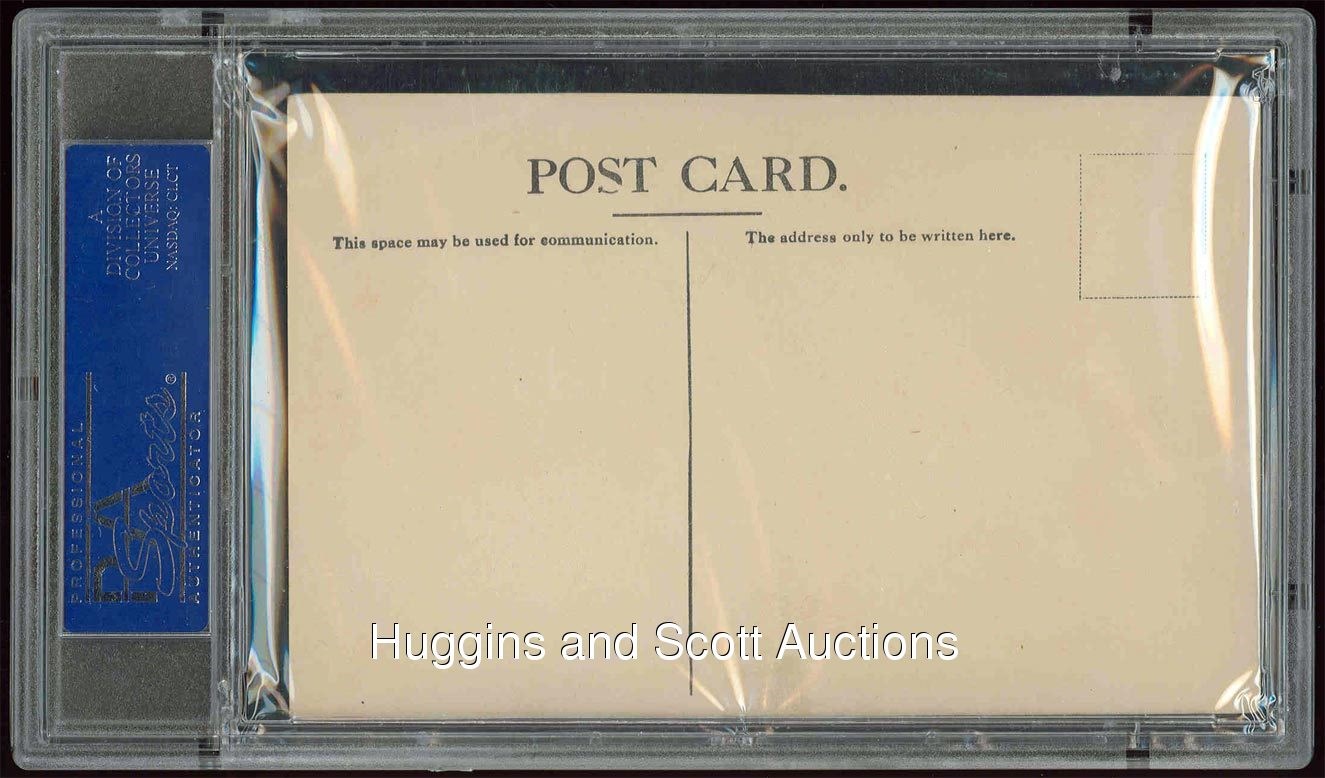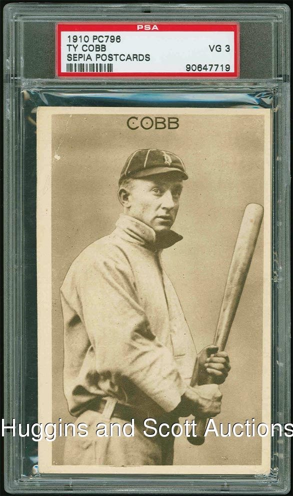 Offered is a very attractive 1910 PC796 sepia postcard featuring the image of Detroit Tiger great Ty Cobb. The postcard presents much better than the actual grade, as the surface is clean and the reverse is blemish free, but the technical grade is a PSA 3 due to a crease in the upper left corner. Early baseball postcards are coveted, and this Cobb with bat off shoulder relic is an excellent exemplar.