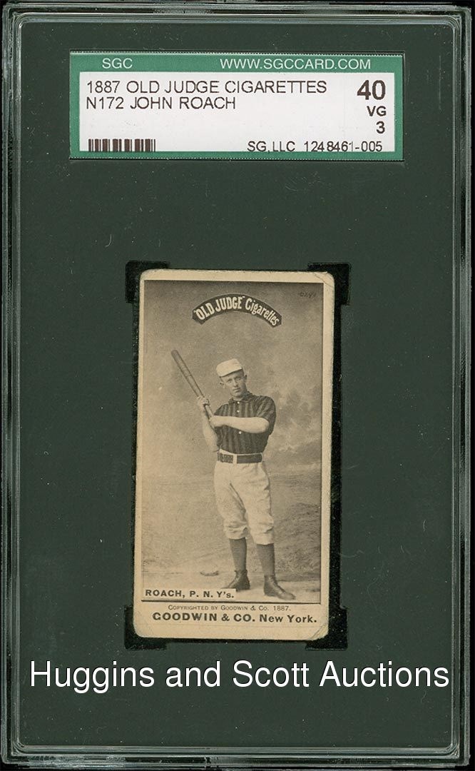 Although he pitched in only one career game, New York hurler John Roach is immortalized on the offered 1887 N172 Old Judge example. This crease-free beauty has been graded a 40 VG by SGC and appears quite nicely for the technical grade. Detracted only by moderate corner wear, this nineteenth-century player is an intriguing addition to any “N” gathering.