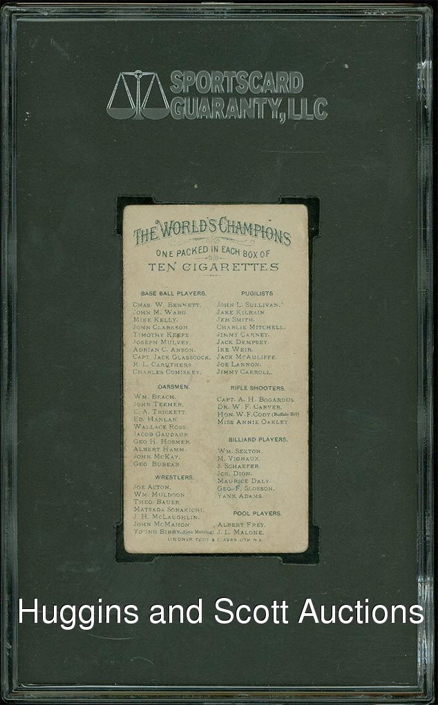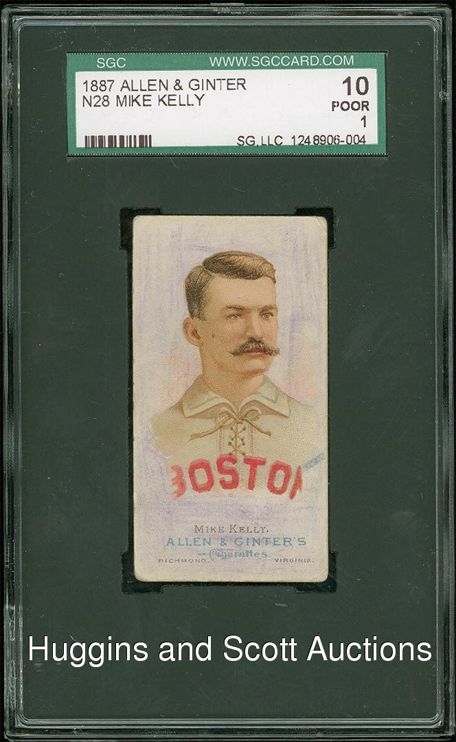 Offered is an 1887 N28 Allen and Ginter Mike “King” Kelly that has been graded “10” by SGC. An overzealous child with a purple crayon made “10,000 Dollar Kelly” look like a million bucks on this card that has been degraded with coloring around Kelly’s portrait. This card was part of a nineteenth-century set that included a variety of athlete portraits packed into boxes of cigarettes. The reverse is clean, and the edges and corners show slight to moderate wear that is typical of cards from this era. This chance to own a piece of “The King” should not be passed up by any vintage collector.