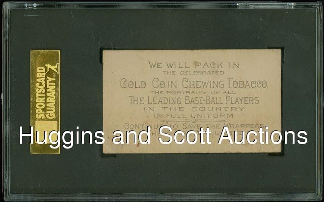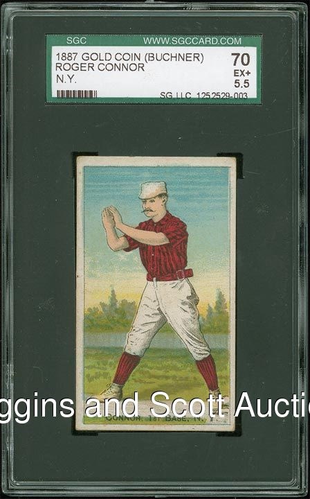 Offered is a very sharp 1887 Buchner Gold Coin Chewing Tobacco card of Hall of Famer Roger Connor. It is widely accepted that Connor was the game’s best power hitter until a bar keeper’s son from Baltimore began belting balls out of ball yards. The card features a drawn image of this 19th Century slugger in a fielding position with his hands cupped. The back of the card displays mild toning consistent with the card position against the acidic tobacco. This 120-year-old card has been deemed a SGC 70 EX+ 5.5 by the trusted third party grading service. According to the latest combined SGC and PSA population reports, this card has one SGC equal and none better.