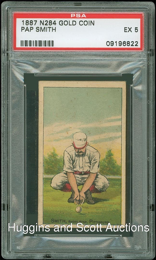 Presented is an 1887 N284 Buchner Gold Coin card of Pap Smith that is graded a PSA 5. This attractive card is the highest graded example in the PSA population report for Smith. The card is well centered and has a very clean reverse.