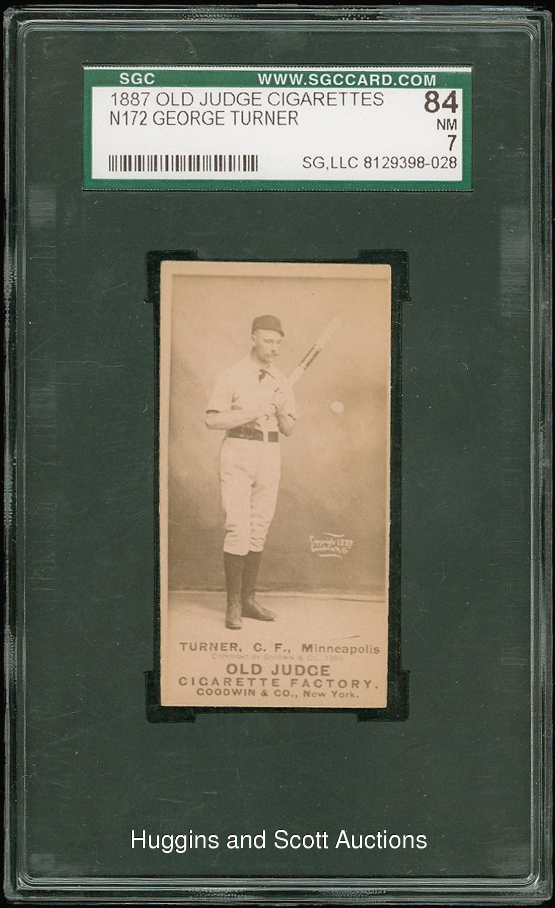 Offered is a 1887 N172 Old Judge George Turner graded (84 NM 7) by SGC. This exemplar is the highest Turner evaluated by the third-party grading service. The card has amazing corners and edges and a clarity not often seen in these 19th-century relics. The centering is the biggest issue but does not deter from the overall beauty of this card.