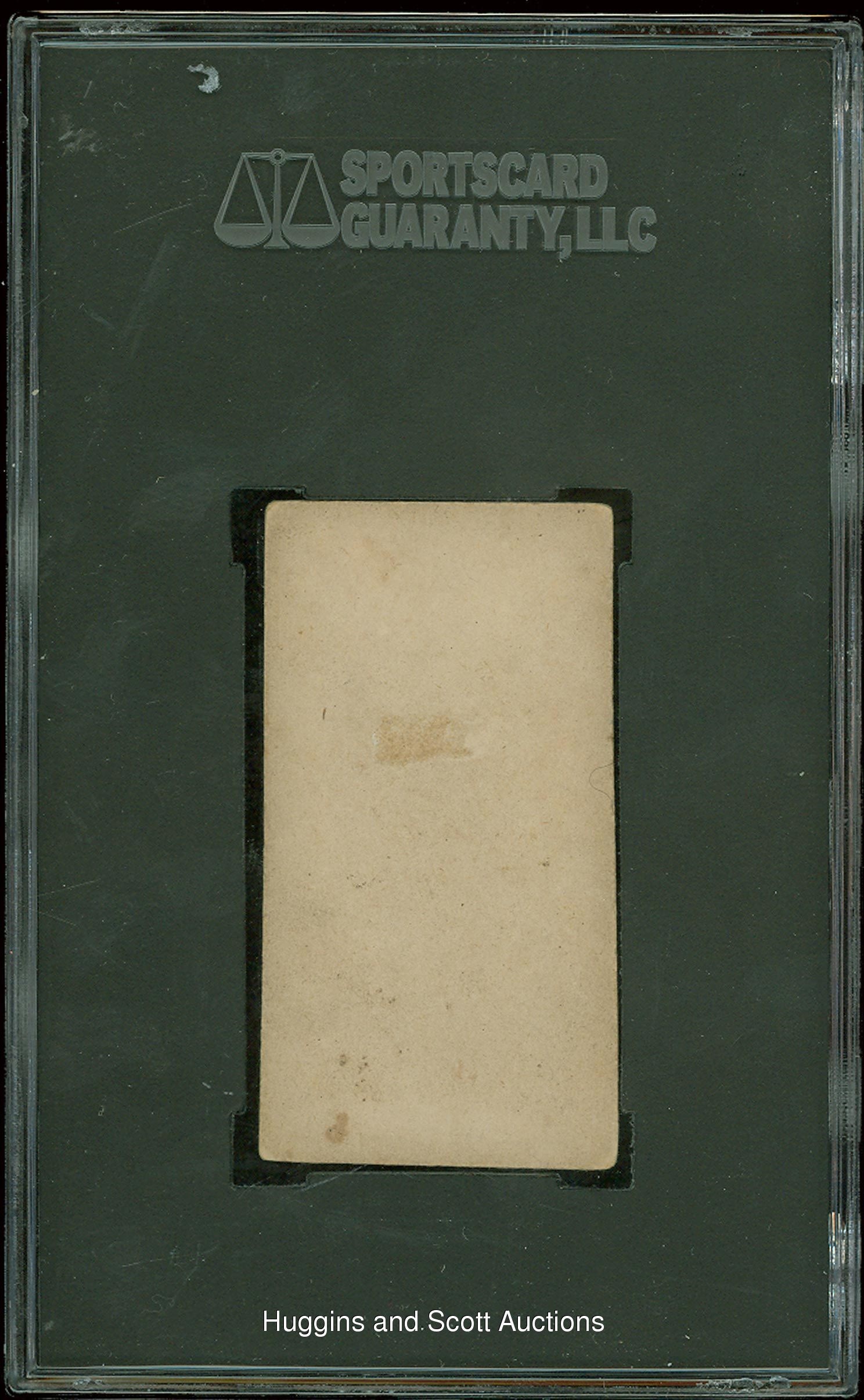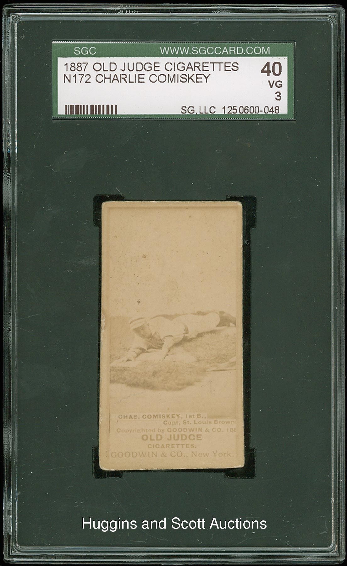 Graded 40 VG 3 by SGC, the hard-to-find Charles Comiskey card from the 1887 Old Judge N172 series features the HOFer sliding and has an overall clean presentation.
