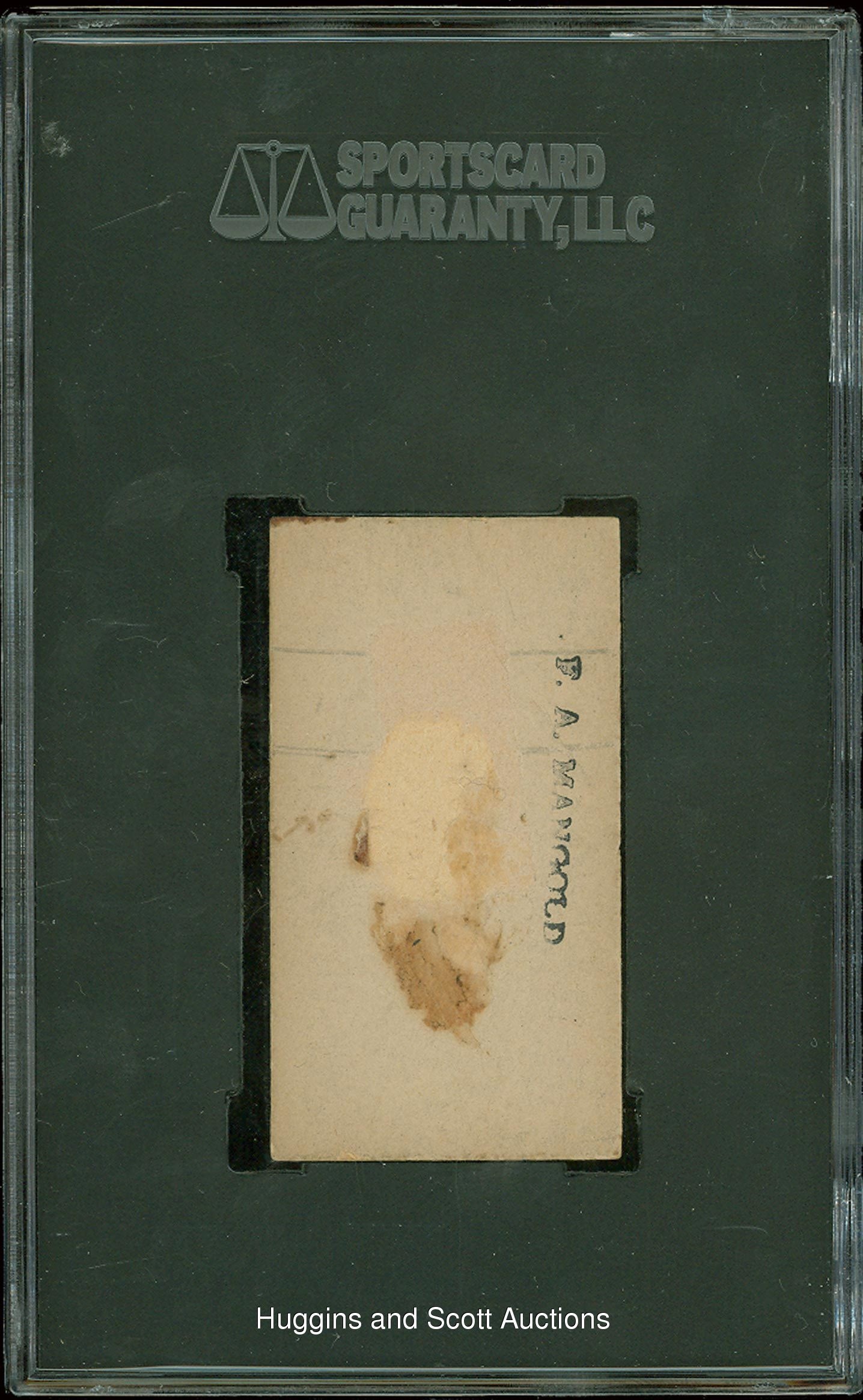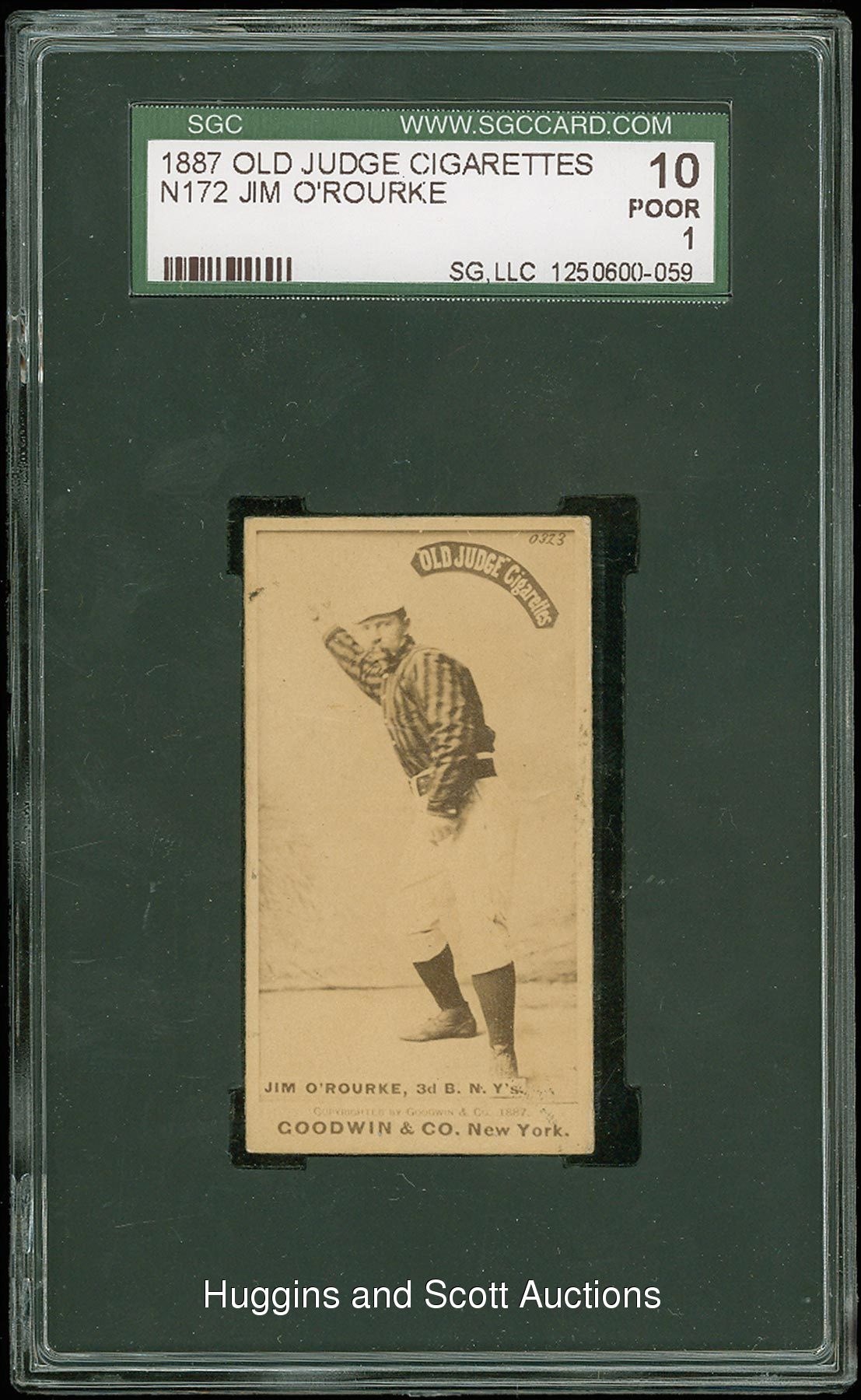 Graded 10 Poor 1 by SGC, this Jim O'Rourke is one of the nicest SGC 10 1887 Old Judge cards on the market. The card has a wonderful obverse, while the reverse shows paper loss and an ink stamp. The card displays considerably better than the technical grade suggests.
