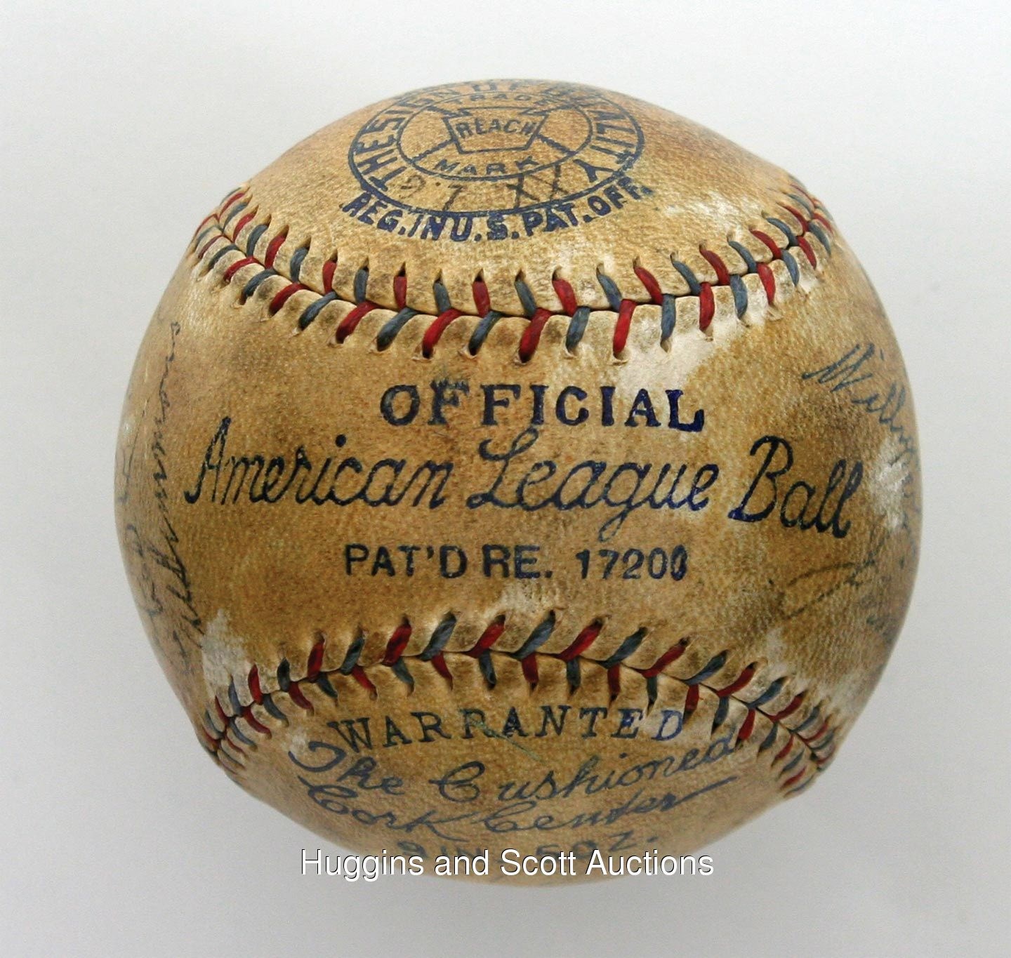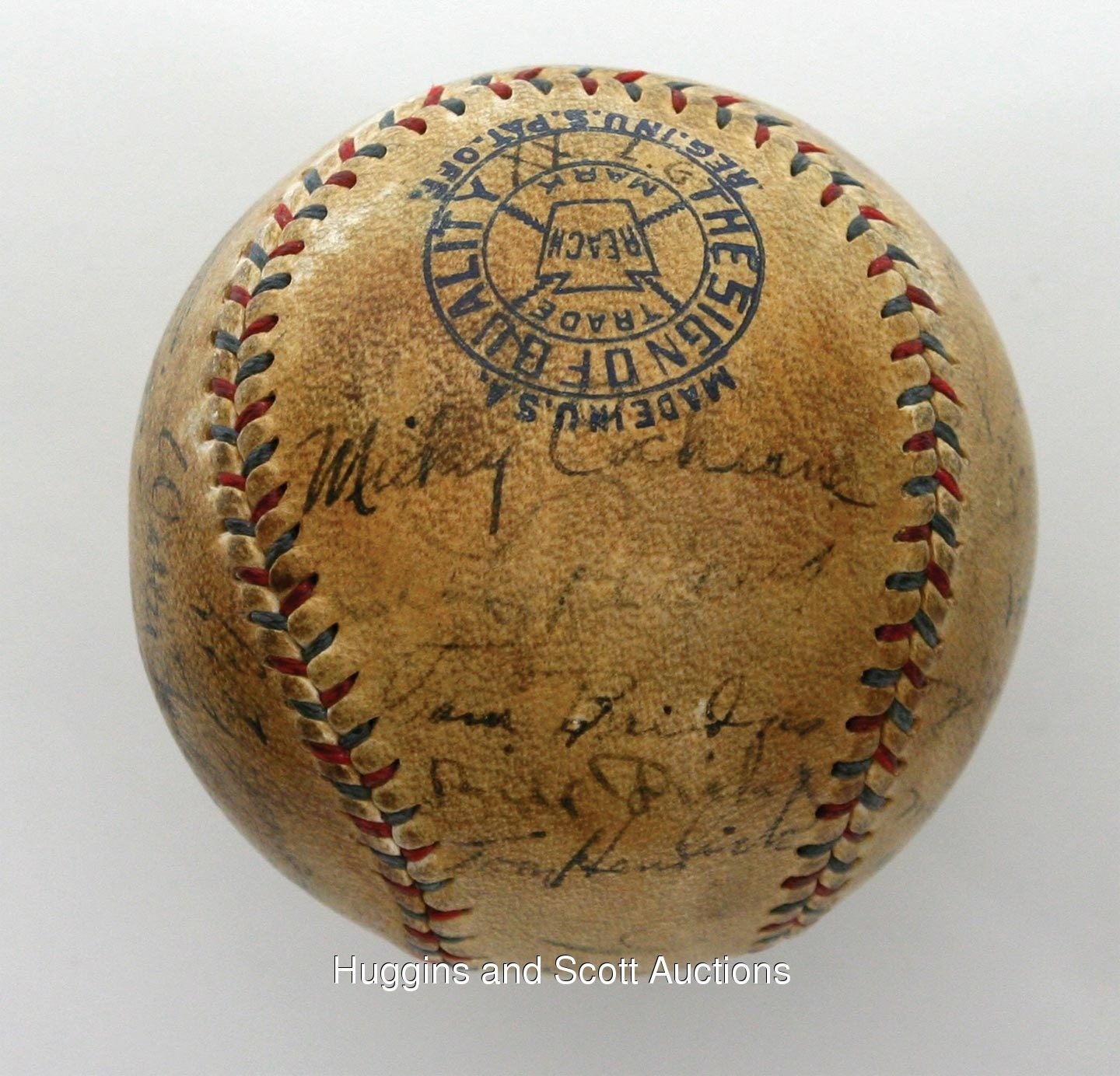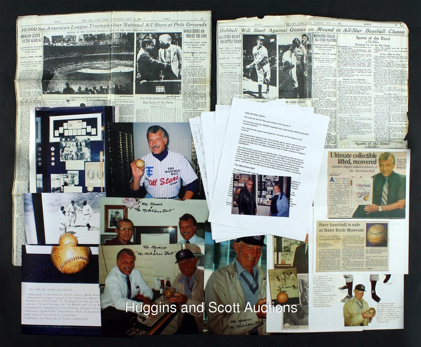 The story begins in a majestic old ballpark that was pressed hard against Coogan's Bluff in the Manhattan section in New York City. Little had anyone realized at the time that this 9-inch, 5-ounce sphere would become one of the most prized and best documented baseballs of its kind, a 1934 All-Star game-used ball known simply as the 'Matchless Ball'. The greatest players in baseball assembled at the Polo Grounds on that hot July afternoon to do battle in front of 48,000 adoring fans. The ball is an Official American League Harridge baseball with red and blue stitching. REACH produced these baseballs with the combination of the 'William Harridge' stamped signature along with 'President, American League' for only a short period of time, 1931-1934. The ball has yellowed over the past 74 years and shows solid game usage with obvious bat marks and evidence of the mud that was rubbed into every ball before the start of a game. Although it may never be proven, this very well may have been the ball hit for a home-run by either Frankie Frisch or Joe Medwick, since very few balls were actually used in games those days, and most were retrieved when hit out of the parks.The “Matchless Ball” features a total of twenty signatures, nineteen of whom played in the game, as well as the initials of Lou Gehrig and Jimmie Foxx. The sweet spot is graced with the signature of Babe Ruth (d.1948, “4-5”) who was playing in his second and last All-Star game. The remaining panels include North Panel: Jimmie Foxx (d.1967, “4”), Jack Russell (d.1990, “4”), Heinie Manush (d.1971, “3”), Mel Harder (d.2002, “4”), Sam West (d.1985, "3"), Charlie Ruffing (d.1986, “4”), Al Simmons (d.1956, “5”); South Panel: Lefty Gomez (d.1989, “5”), Walter Johnson (coach, d.1946, “5”), Ben Chapman (d.1993, “3-4”), Jimmy Dykes (d.1976, “3”); East Panel: Joe Cronin (d.1984, “4”), Earl Averill (d.1983, “4”), Charlie Gehringer (d.1993, “5”); West Panel: Mickey Cochrane (d.1962, “5”), Lou Gehrig (d.1941, “2-3”), Tommy Bridges (d.1968, “4”), Bill Dickey (d.1993, “4-5”) and Tom Henrich (“4-5”). Although Henrich's signature appears on the ball, he did not play in that game. Henrich explains, in an affidavit, that he added his signature years later at the request of the original owner, who was a longtime friend. The provenance accompanying the 'Matchless Ball' is incredible. The documentation includes a copy of the affidavit from Mel Harder attesting to the authenticity that the ball was used in the 1934 All-Star game and was signed by himself and his teammates. There are also (8) photographs that include Harder, Henrich, and the ball on display at The Babe Ruth Museum, where it was on loan for nearly six years and displayed during the Centennial Celebration of Babe Ruth's birth. The detailed documentation also includes a 107-page published book titled Pitched from the Past; The Journey of The ‘Matchless Ball’, by Dan de la Torre, and a photocopy of Harder's letter to de la Torre that is included in the foreword to the book. According to Harder, this ball is one of two or three game-used baseballs that the American League squad signed that day, and despite an exhaustive search, no other A.L. team-signed 1934 All-Star game-used baseball has ever surfaced. The 'Matchless Ball' has appeared on ESPN, FOX News, PBS, and featured in more than a dozen articles in newspapers and magazines. The book that accompanies the ball has paper inserts featuring authentic signatures of Harder, the winning pitcher, and Tommy Henrich. The term 'Matchless Ball' is a registered trademark. This incredible ball comes with a full photo LOA from James Spence Authentications.