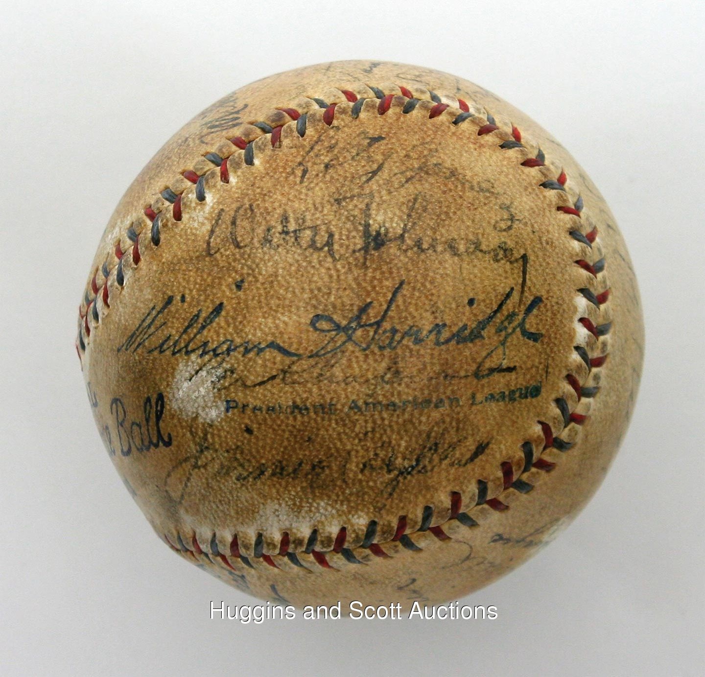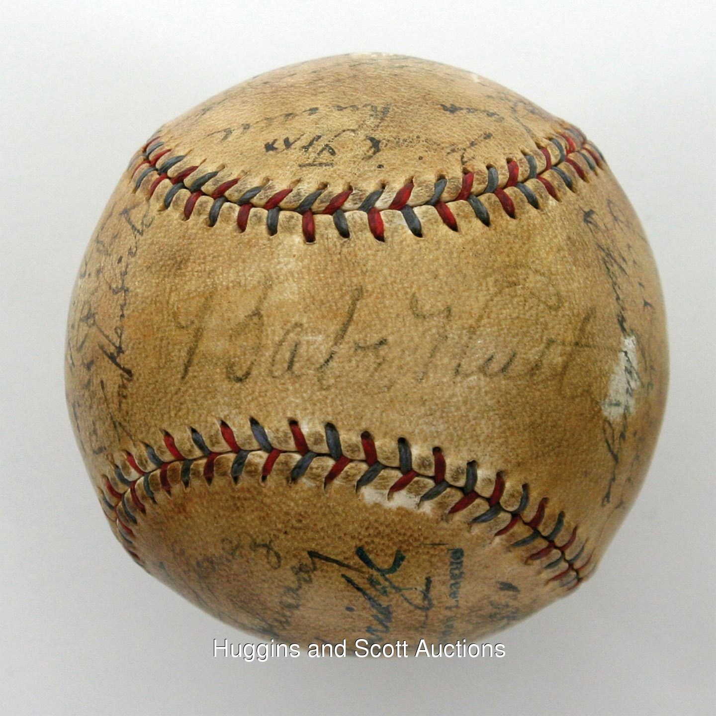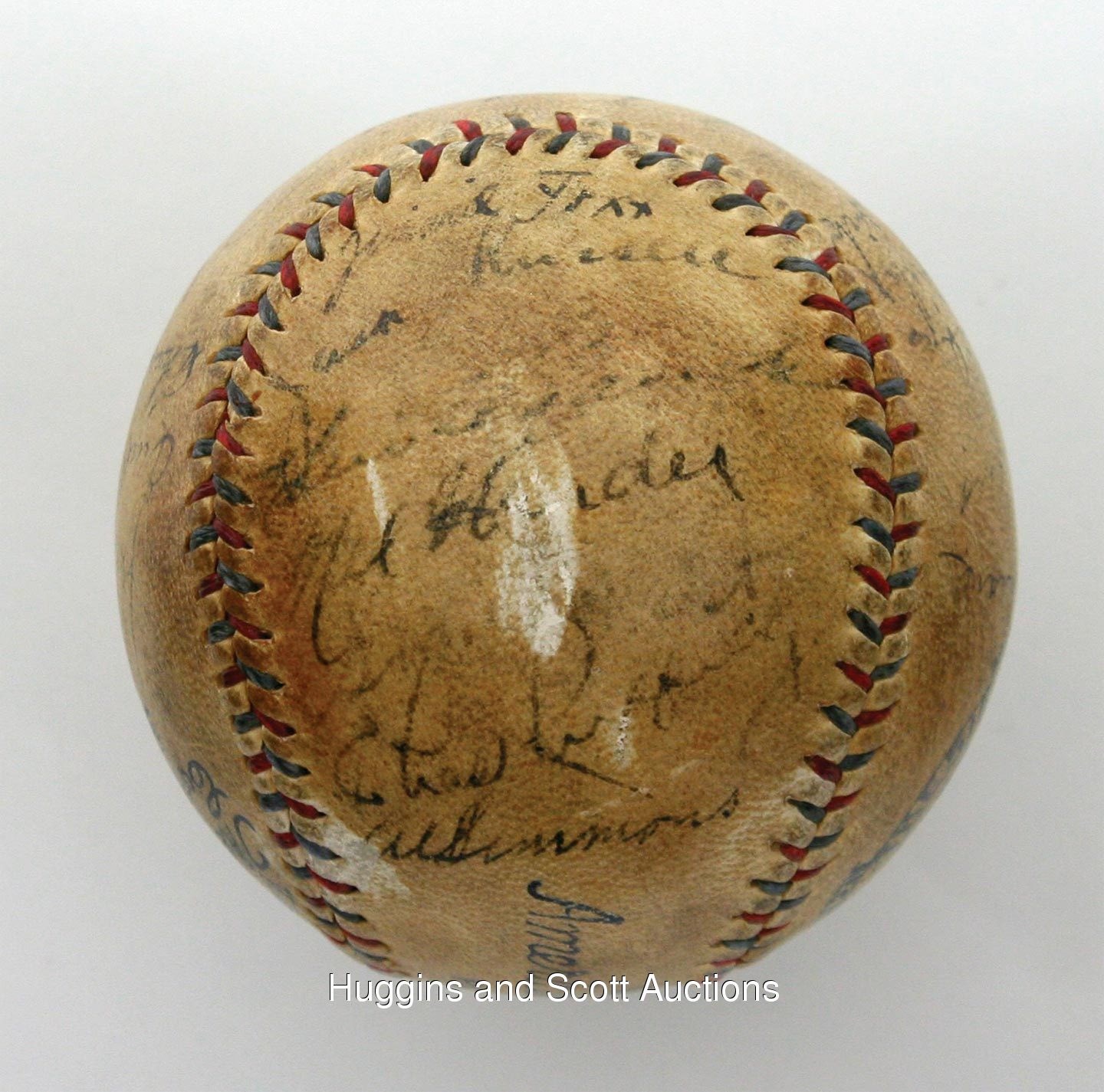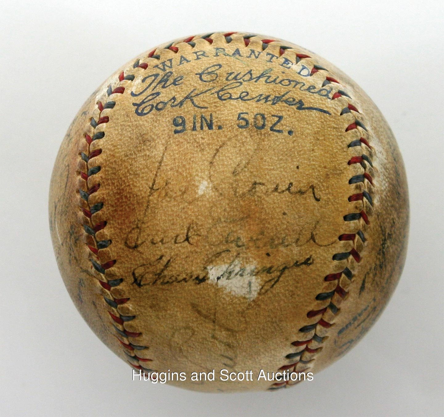 The story begins in a majestic old ballpark that was pressed hard against Coogan's Bluff in the Manhattan section in New York City. Little had anyone realized at the time that this 9-inch, 5-ounce sphere would become one of the most prized and best documented baseballs of its kind, a 1934 All-Star game-used ball known simply as the 'Matchless Ball'. The greatest players in baseball assembled at the Polo Grounds on that hot July afternoon to do battle in front of 48,000 adoring fans. The ball is an Official American League Harridge baseball with red and blue stitching. REACH produced these baseballs with the combination of the 'William Harridge' stamped signature along with 'President, American League' for only a short period of time, 1931-1934. The ball has yellowed over the past 74 years and shows solid game usage with obvious bat marks and evidence of the mud that was rubbed into every ball before the start of a game. Although it may never be proven, this very well may have been the ball hit for a home-run by either Frankie Frisch or Joe Medwick, since very few balls were actually used in games those days, and most were retrieved when hit out of the parks.The “Matchless Ball” features a total of twenty signatures, nineteen of whom played in the game, as well as the initials of Lou Gehrig and Jimmie Foxx. The sweet spot is graced with the signature of Babe Ruth (d.1948, “4-5”) who was playing in his second and last All-Star game. The remaining panels include North Panel: Jimmie Foxx (d.1967, “4”), Jack Russell (d.1990, “4”), Heinie Manush (d.1971, “3”), Mel Harder (d.2002, “4”), Sam West (d.1985, "3"), Charlie Ruffing (d.1986, “4”), Al Simmons (d.1956, “5”); South Panel: Lefty Gomez (d.1989, “5”), Walter Johnson (coach, d.1946, “5”), Ben Chapman (d.1993, “3-4”), Jimmy Dykes (d.1976, “3”); East Panel: Joe Cronin (d.1984, “4”), Earl Averill (d.1983, “4”), Charlie Gehringer (d.1993, “5”); West Panel: Mickey Cochrane (d.1962, “5”), Lou Gehrig (d.1941, “2-3”), Tommy Bridges (d.1968, “4”), Bill Dickey (d.1993, “4-5”) and Tom Henrich (“4-5”). Although Henrich's signature appears on the ball, he did not play in that game. Henrich explains, in an affidavit, that he added his signature years later at the request of the original owner, who was a longtime friend. The provenance accompanying the 'Matchless Ball' is incredible. The documentation includes a copy of the affidavit from Mel Harder attesting to the authenticity that the ball was used in the 1934 All-Star game and was signed by himself and his teammates. There are also (8) photographs that include Harder, Henrich, and the ball on display at The Babe Ruth Museum, where it was on loan for nearly six years and displayed during the Centennial Celebration of Babe Ruth's birth. The detailed documentation also includes a 107-page published book titled Pitched from the Past; The Journey of The ‘Matchless Ball’, by Dan de la Torre, and a photocopy of Harder's letter to de la Torre that is included in the foreword to the book. According to Harder, this ball is one of two or three game-used baseballs that the American League squad signed that day, and despite an exhaustive search, no other A.L. team-signed 1934 All-Star game-used baseball has ever surfaced. The 'Matchless Ball' has appeared on ESPN, FOX News, PBS, and featured in more than a dozen articles in newspapers and magazines. The book that accompanies the ball has paper inserts featuring authentic signatures of Harder, the winning pitcher, and Tommy Henrich. The term 'Matchless Ball' is a registered trademark. This incredible ball comes with a full photo LOA from James Spence Authentications.