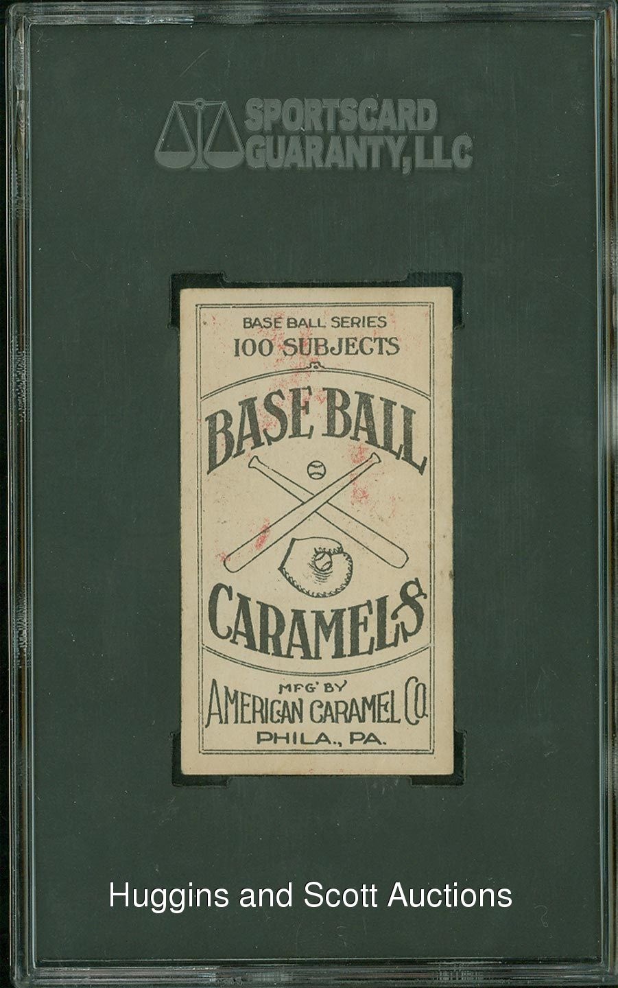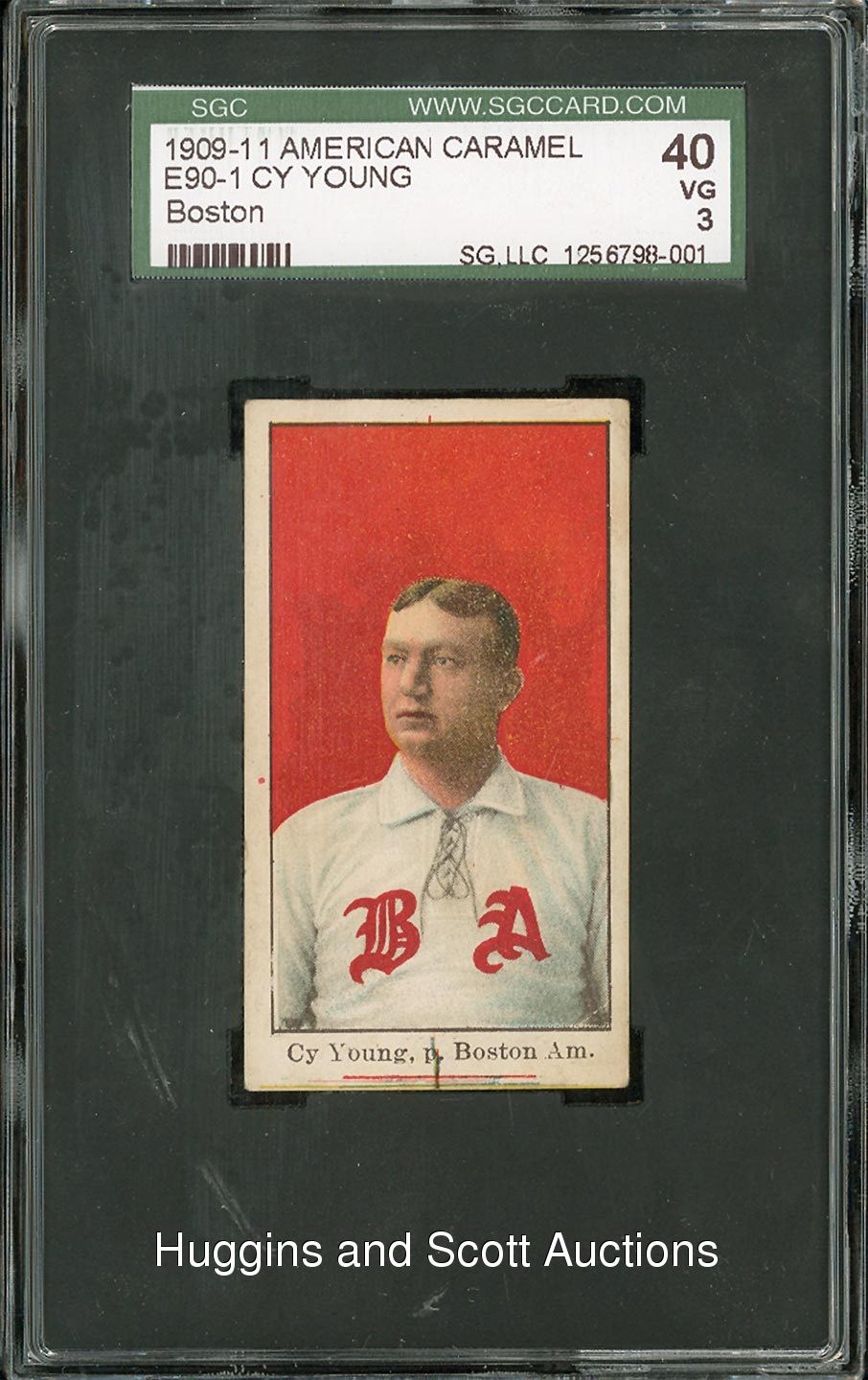 Presented is a possibly unique 1909-1911 E90-1 American Caramel Cy Young (Boston) proof, graded 40 VG by SGC. With the presence of period printer’s guidelines, the attractive portrait of this upper-echelon Hall of Famer offers the advanced collector a seldom-encountered opportunity. This relic is highlighted by a radiant red background and team initials on the hurler’s chest. The corners are bright and moderately touched, while a pair of spider creases are found on the bottom-right corner. The reverse reveals moderate color bleeding from the surface but does not detract from the astounding visual appeal of this dynamic caramel card.