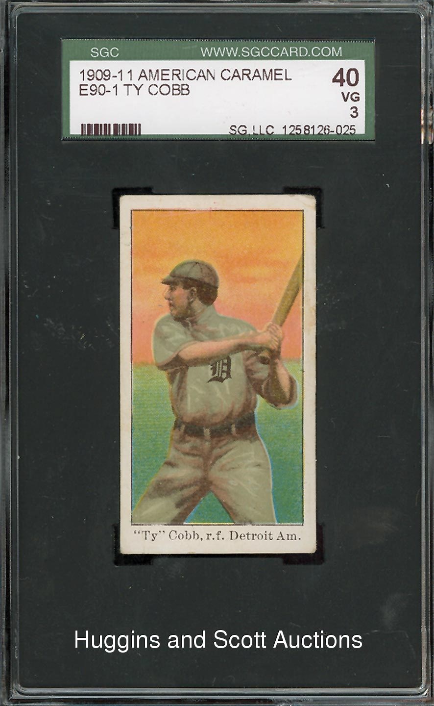 Graded 40 VG by SGC. This classic 1909-1911 E90-1 Ty Cobb example is a fine mid-grade example of the fiery southerner. This antiquity exhibits astounding color, pinpoint centering and a crystal clean back. Despite even corner wear and a pair of surface creases, this relic appears at the apex of the assigned technical grade.