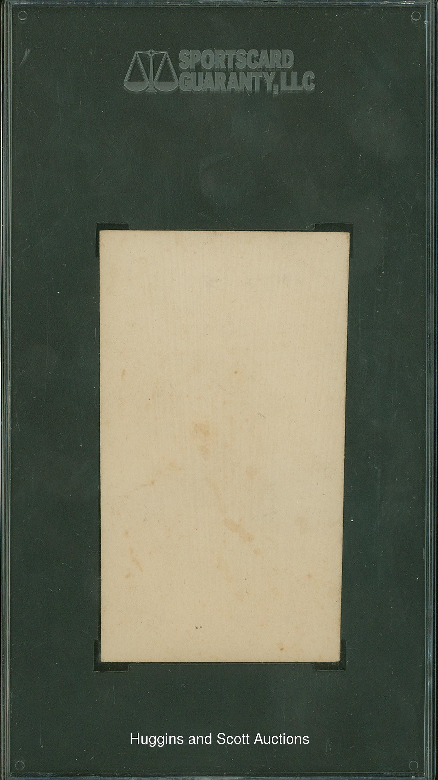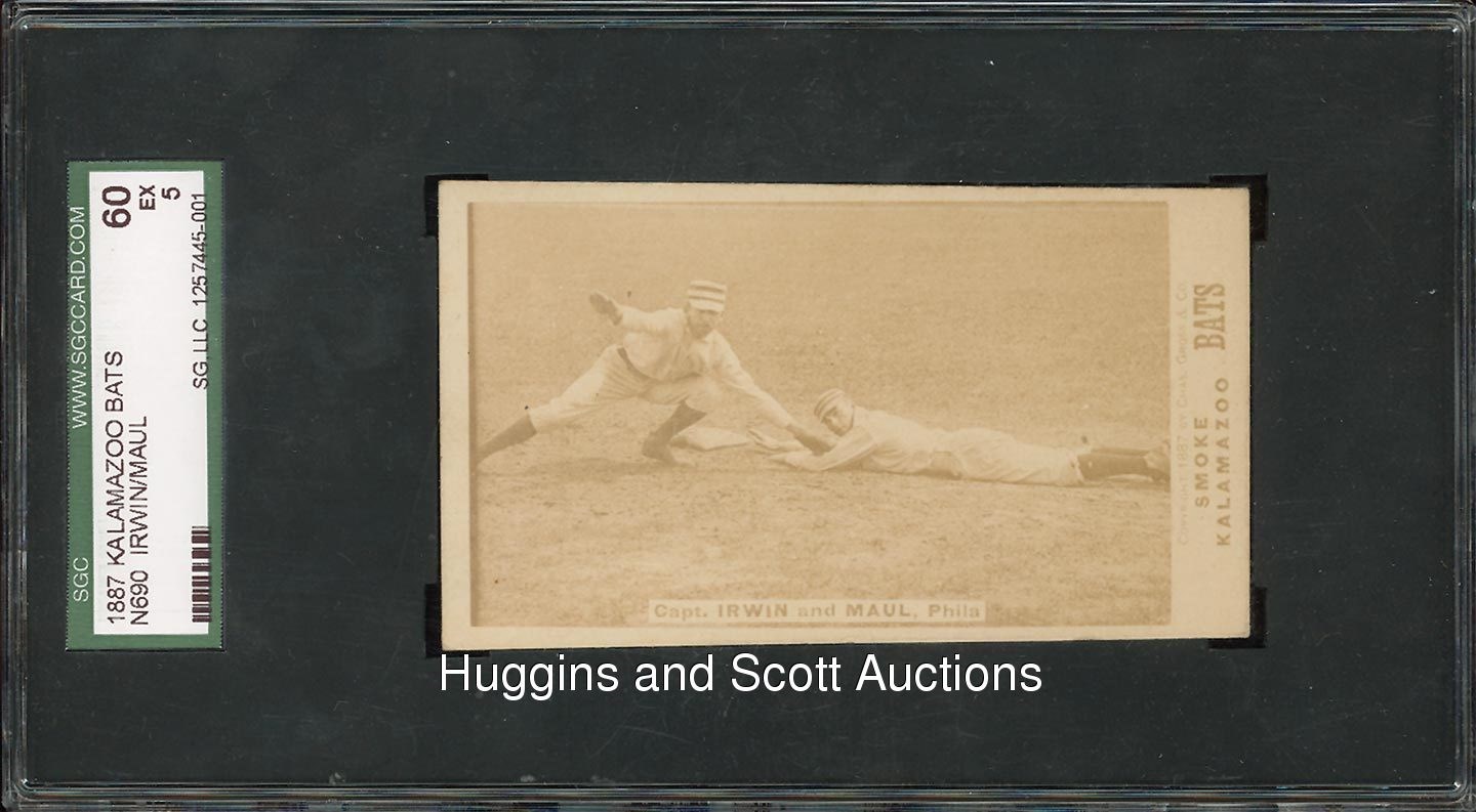 The 1887 Kalamazoo Bats N690 tobacco issue is one of the toughest and most desirable of all 19th Century issues. Offered is a superb example of one of these rarities, an 1887 Kalamazoo Bats N690 Irwin/Maul, Phila graded SGC 60. This paramount exemplar, the highest graded of the five authenticated by SGC, has a crystal clean front with a sharp image and well defined borders. The reverse does display mild toning spots common with tobacco issues. Although very common with the Kalamazoo Bats issue, the card is slightly tapered from top to bottom, measuring 2-1/4” at the top and 2-1/8” at the bottom. This is the highest graded example of this card on the SGC Registry and is one of the top graded cards in the entire set.