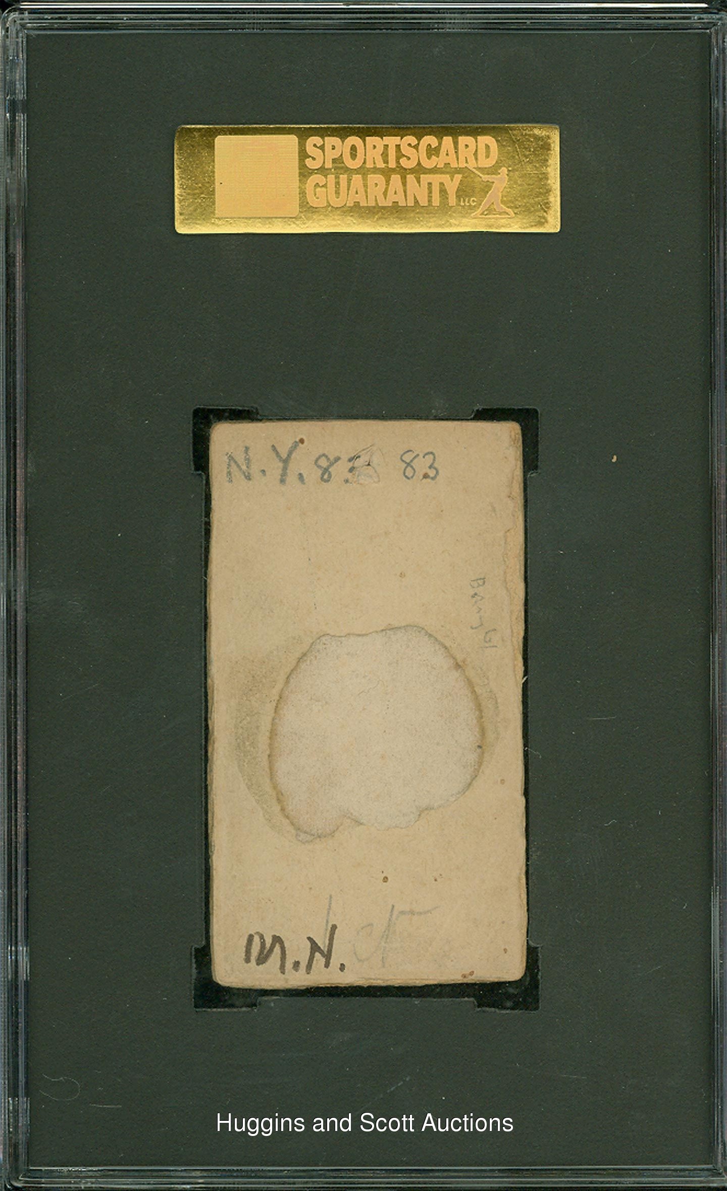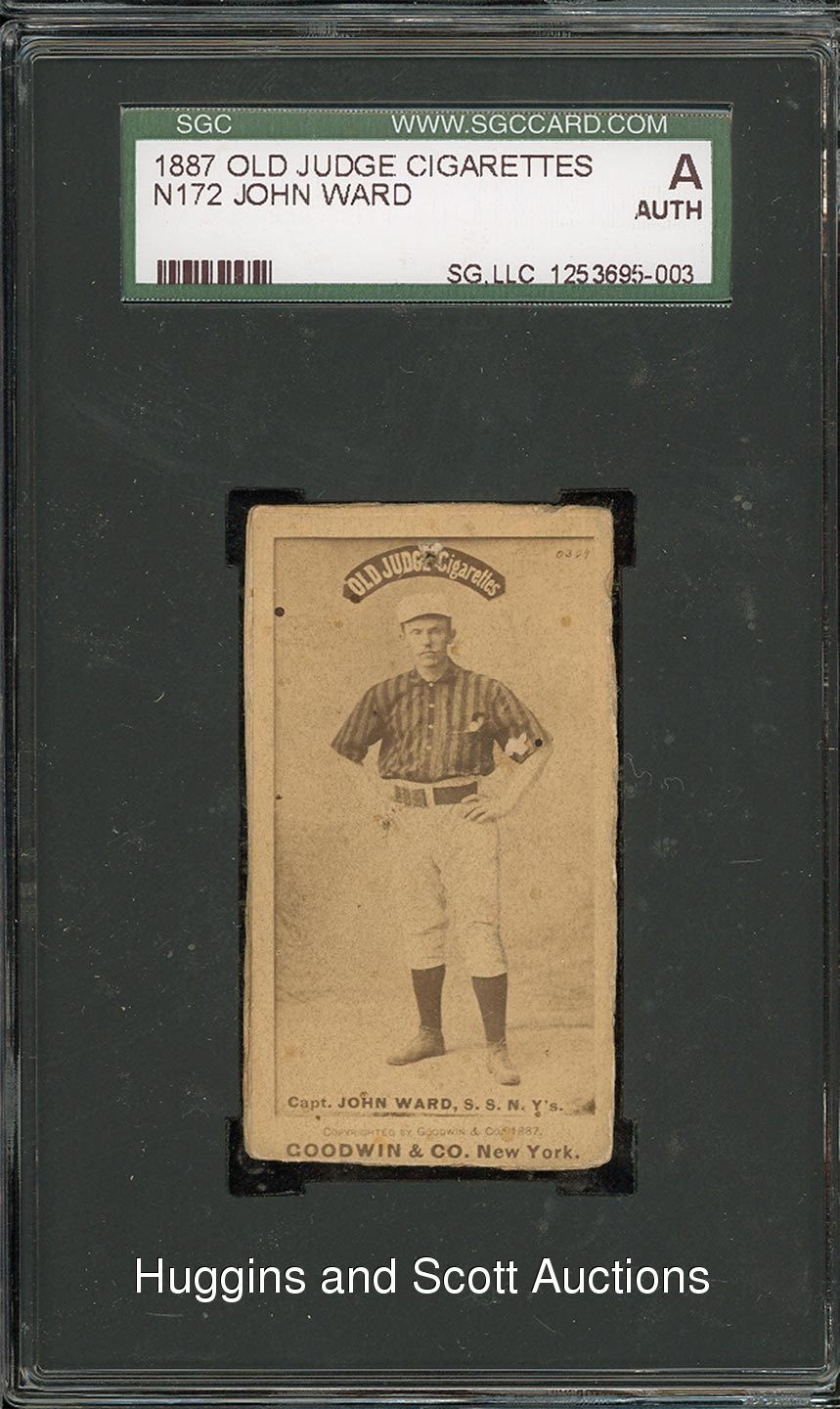 Judged as Authentic by SGC. Early Hall of Famer John Montgomery Ward is the focus of this 1887 N172 Old Judge example. This nineteenth century relic displays a pinhole that has been placed on the surface’s advertisement along with additional paper residue and pen markings on the reverse. Despite these flaws, this attractive card displays better than the technical grade would indicate.
