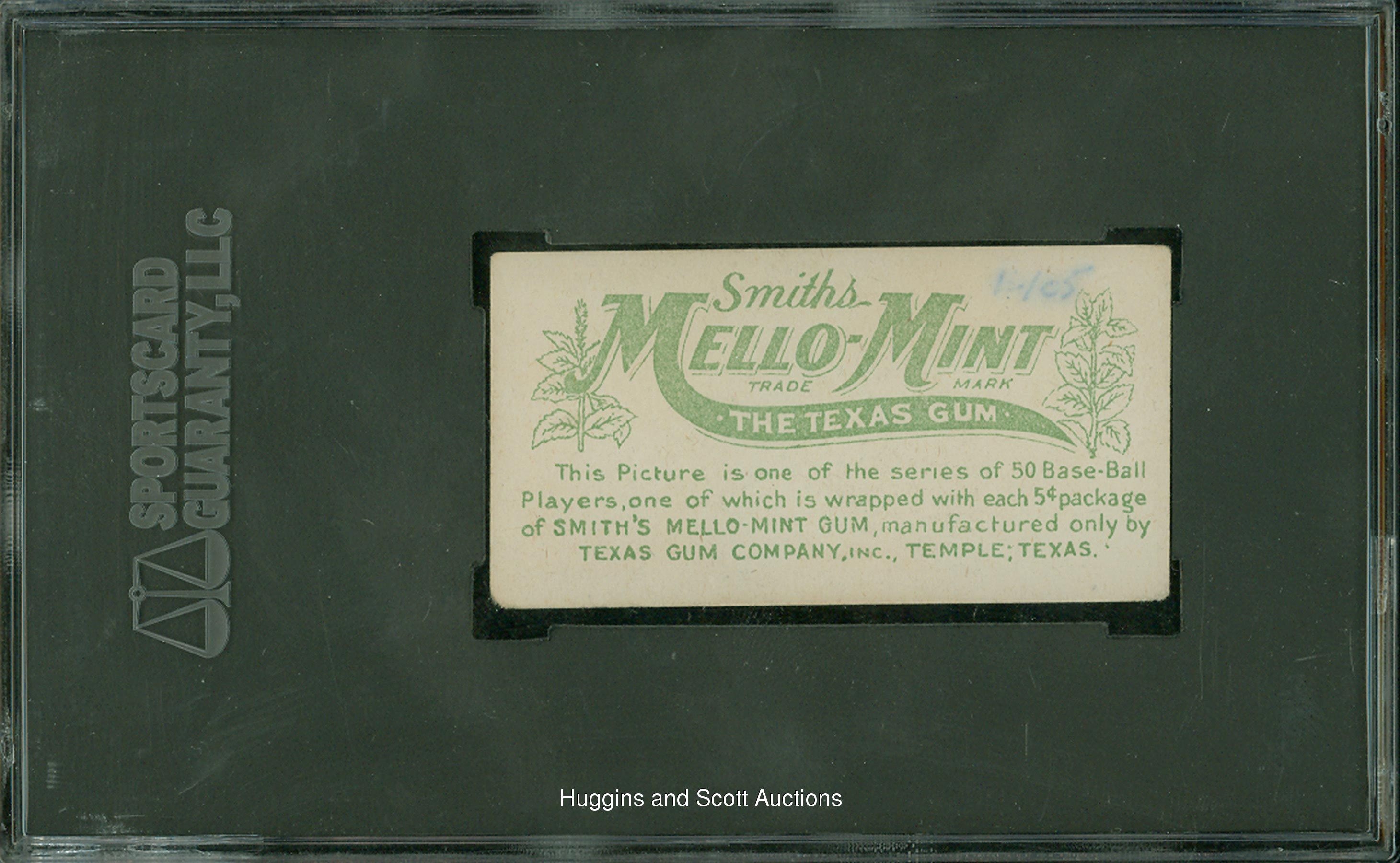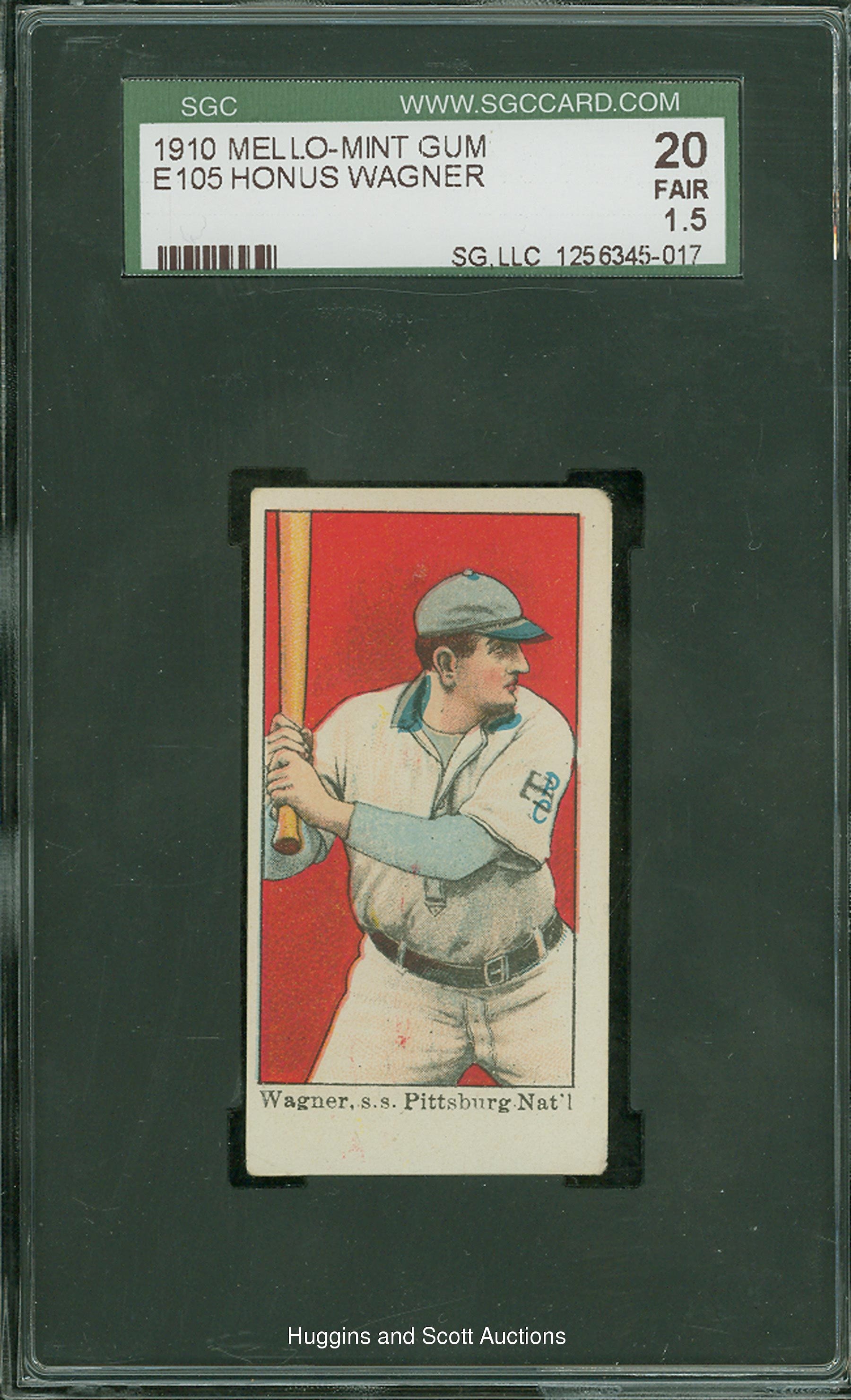 It does not get much more challenging than this 1910 E105 Mello-Mint Gum Honus Wagner (Batting). Graded 20 Fair 1.5 by SGC, only fourteen similar Wagner specimens have been judged by the grading surface. This fragile beauty is crease-free and further accentuated by piercing color contrasts, moderately touched borders and precise registration. If not for an inexplicable pen marking on the picturesque advertising reverse, this Hall of Fame type card would have fared much better.