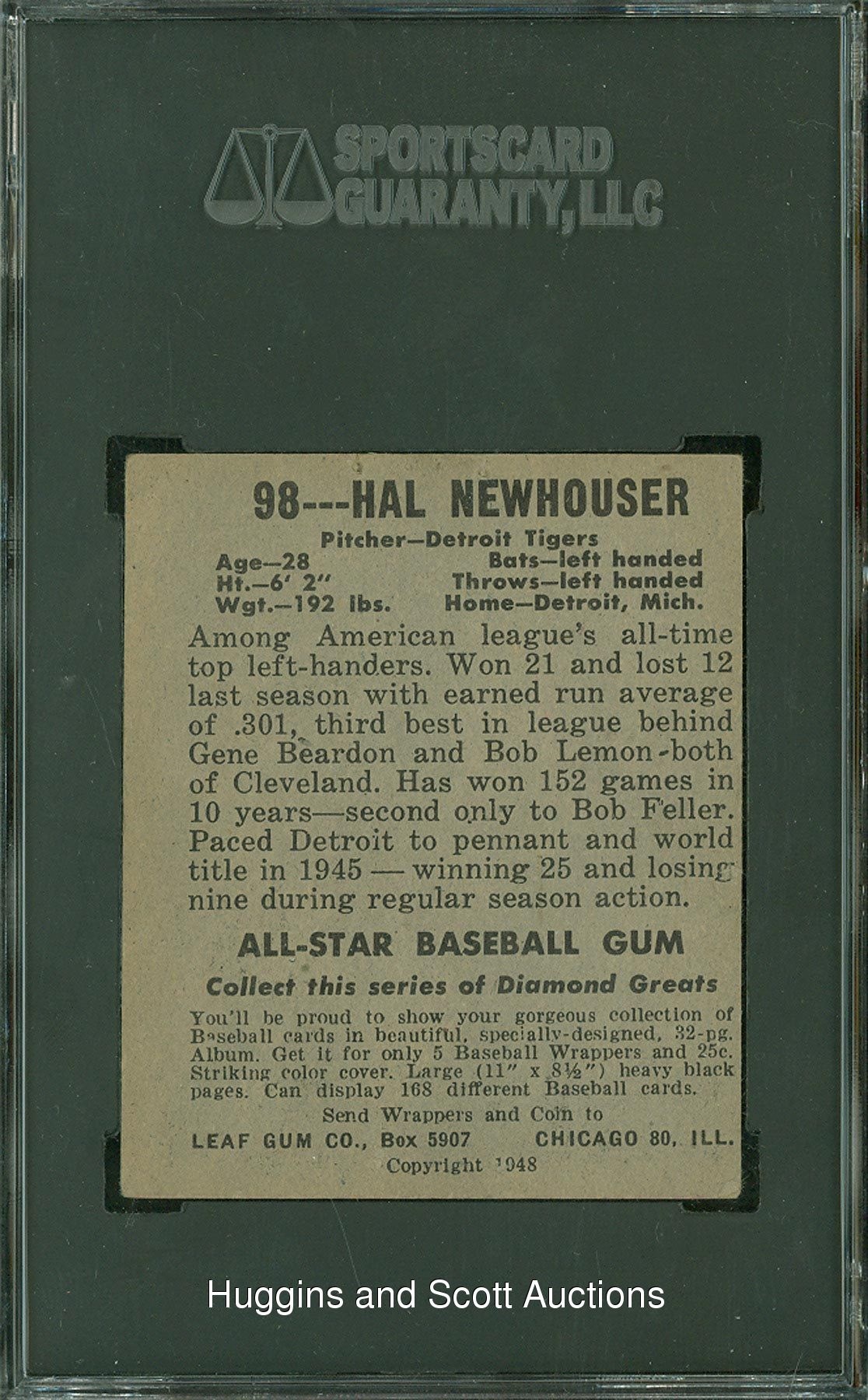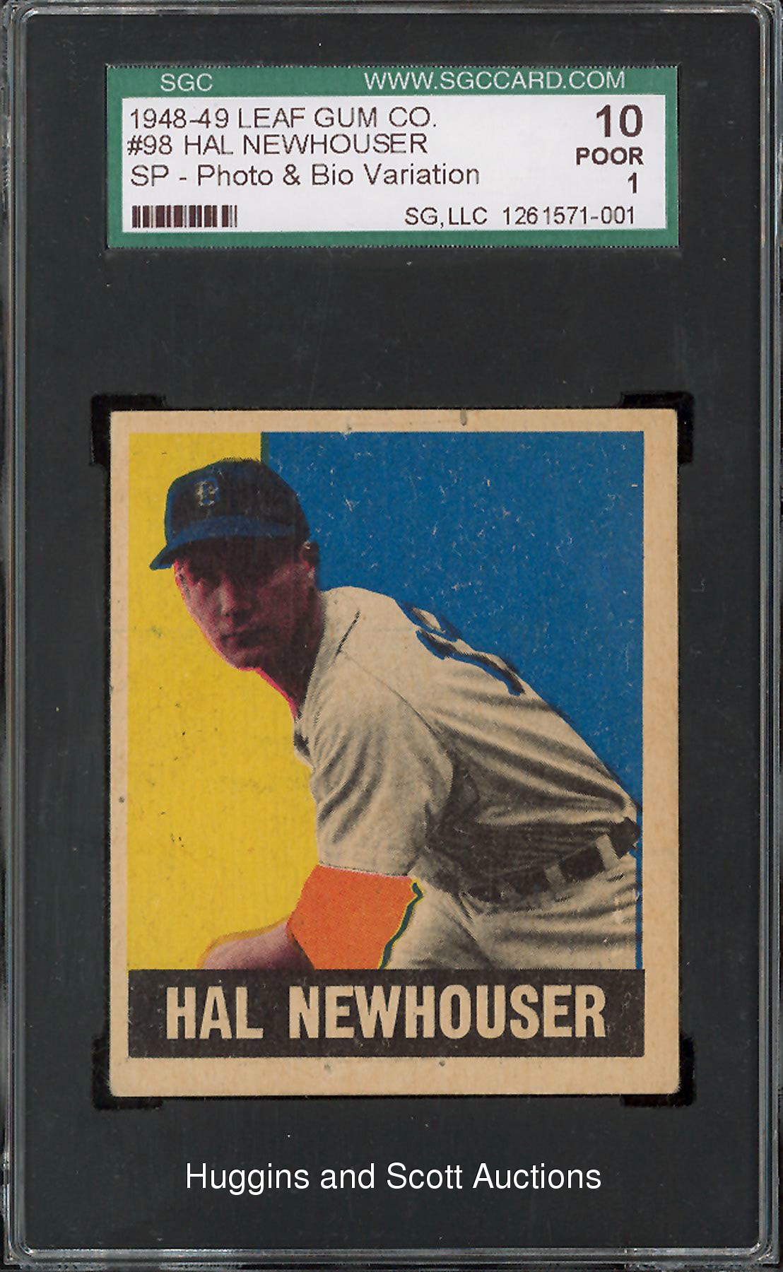 The first full-color issue following World War II, the 1948-49 Leaf series introduced legions of wide-eyed youth to baseball card collecting. Although the nationally released set has been enthusiastically collected for over sixty years, the inclusion of challenging short-prints and pose variations have stymied many attempts at securing a full series of 98 cards. One of the key short-prints is found with the rookie card of #98 Hal Newhouser. The debut appearance of Prince Hal is perpetually atop many advanced collectors want lists. In early 2008, a previously undiscovered 1948-49 Leaf #98 Newhouser pose surfaced in Baltimore, Maryland. It is natural that after six decades the unearthing of a new variation from an acclaimed set caused quite a stir in the vintage baseball card community. As the subject of several message board forums as well as the October 2008 Old Cardboard newsletter, this mysterious relic was initially met with disbelief. However, after prolonged examination, the consensus from several hobby experts concludes that the offered 1948-49 Leaf #98 Hal Newhouser SP photo and bio variation is a bona fide prototype. Graded 10 PR 1 by SGC, the prototype varies from the released version in that the pose, split-colored background and reverse biography are different. A variety of factors indicate that #98 Newhouser was initially slated to be included in the more common first series. Only split-colored poses and the textual wording “left handed†are found on first series cards. For whatever speculative reasons (possibly contractual), Newhouser was left for the second series. Card manufacturers of the age typically kept sample cards in notebooks, usually affixing the “prototypes†to the pages with staples. The offered relic displays these staple markings along the top border. The so-called technical flaw actually serves as a ringing endorsement to the history of this example. This vintage cardboard is further highlighted by a radiant blue-and-yellow background and an attractive “follow-through†pose. In the sports memorabilia industry the terms “unique†and “one-of-a-kind†are often used as descriptors for either high-profile cornerstone items or esoteric pieces with little secondary value. This unparalleled piece is an important hobby discovery that serves to advance the scope of knowledge of the renowned 1948-49 Leaf set.