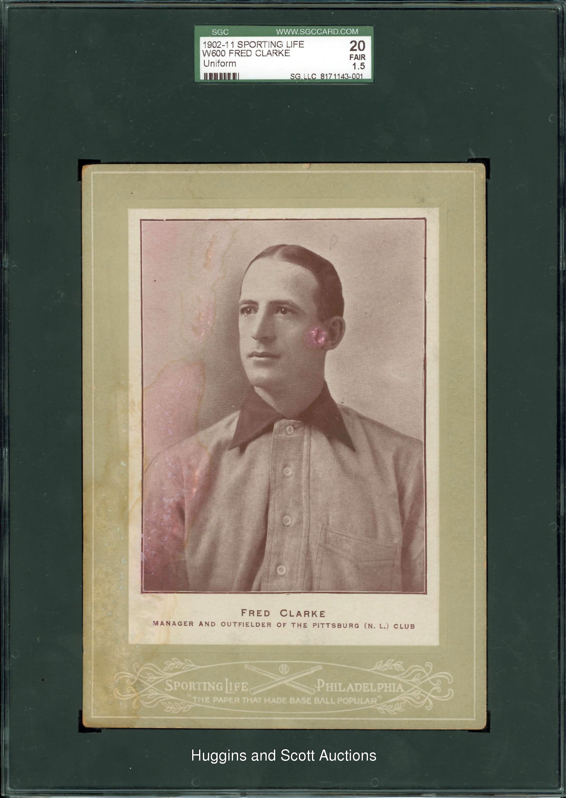 Graded 20 Fair by SGC, the offered 1902-11 W600 Sporting Life Cabinets Fred Clarke depicts the Hall of Famer in uniform as the Pittsburgh Pirates manager and outfielder. Despite water staining, pink discoloration that permeates the surface and reverse along with moderate paper loss on the reverse, this oversized antiquity will fit nicely into any discerning pre-war gathering.