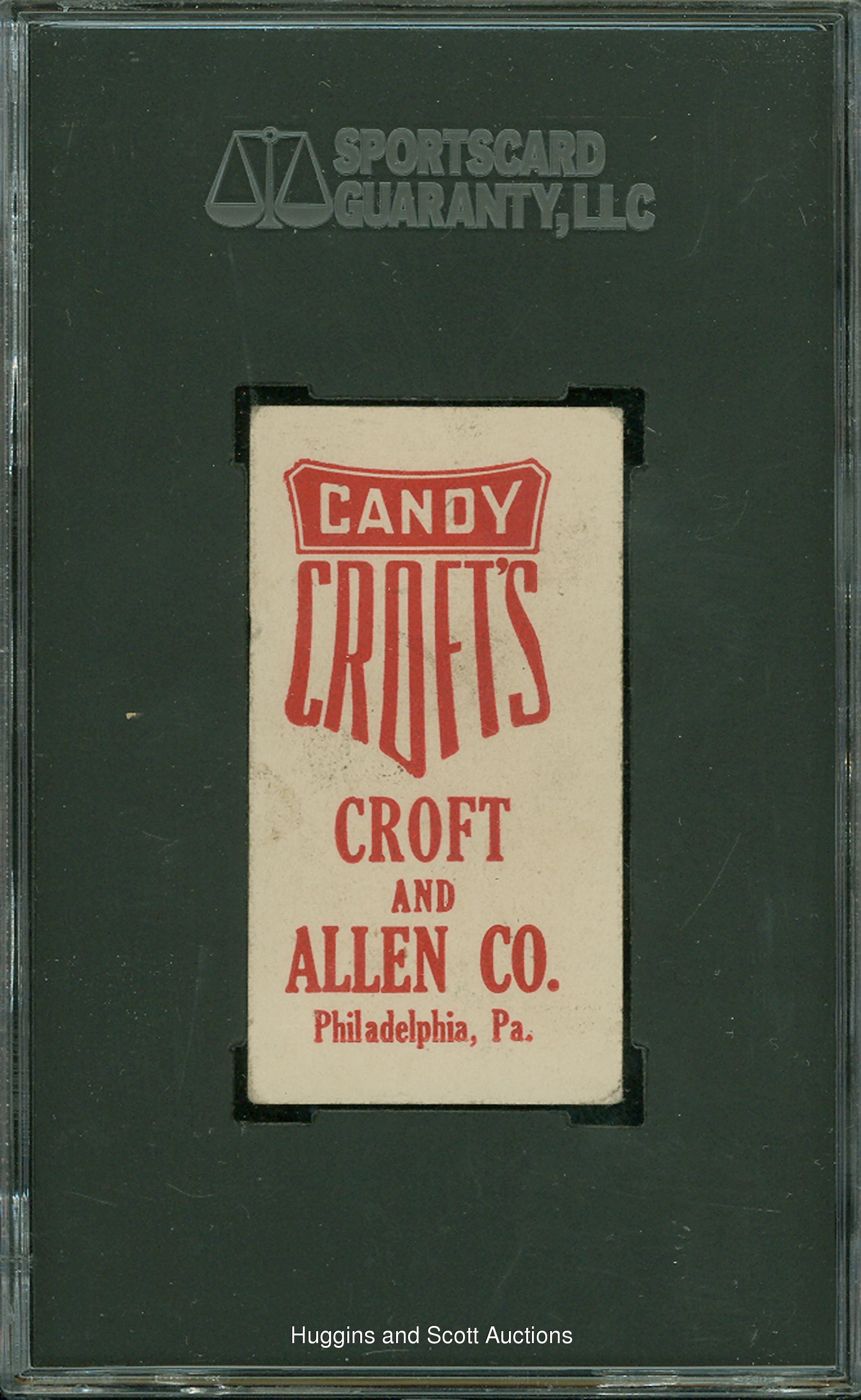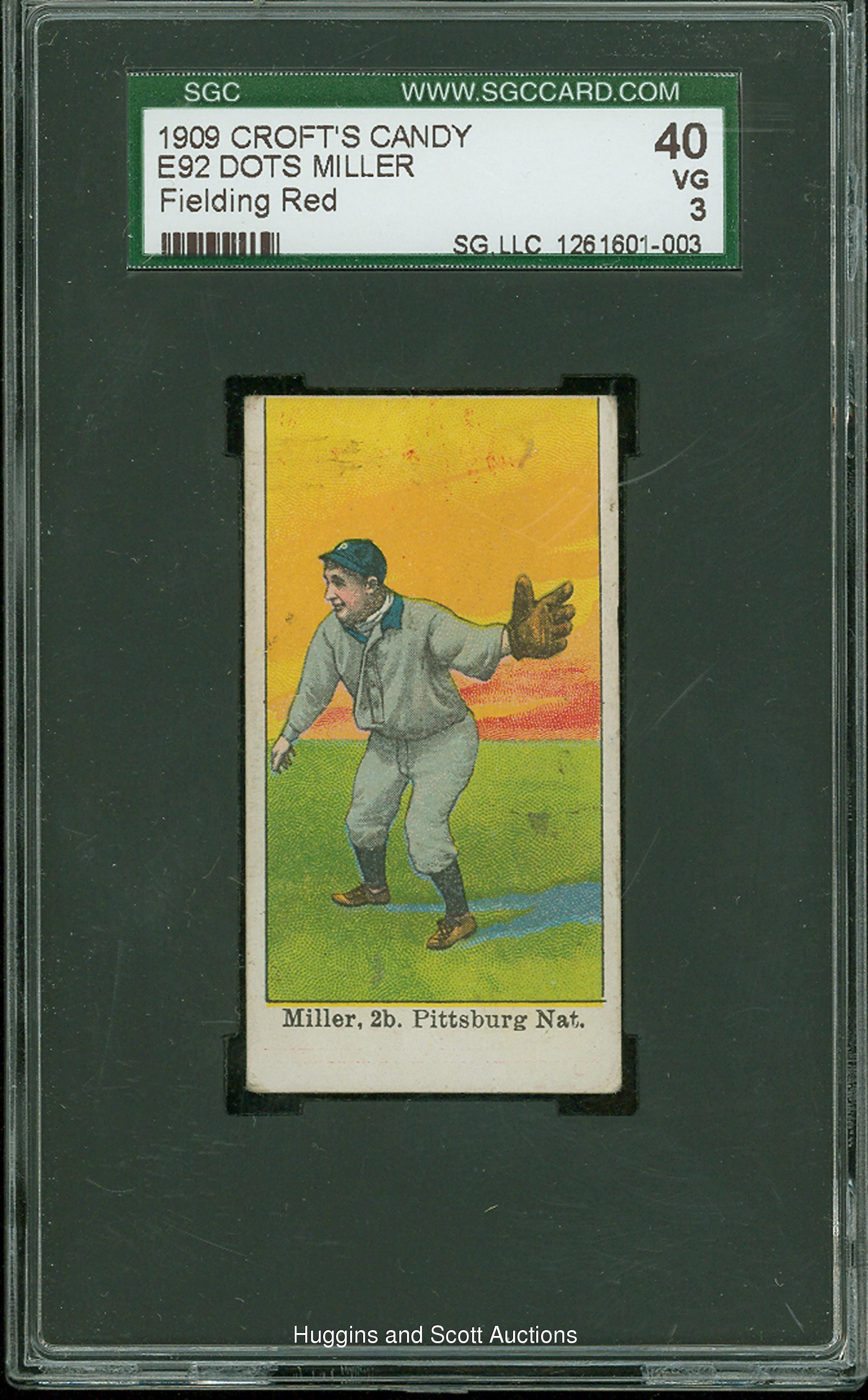 Graded 40 VG 3 by SGC. Featured is an almost impossible-to-find 1909 E92 Croft’s Candy Dots Miller with a decidedly tough red back. This crease-free “fielding†pose retains lush colors, a problem-free reverse with blazing type and only suffers from being off-centered from the top-to-bottom. According to industry experts, only a handful of 1909 E92 Croft’s Candy examples with a red advertising reverse have surfaced in any condition.