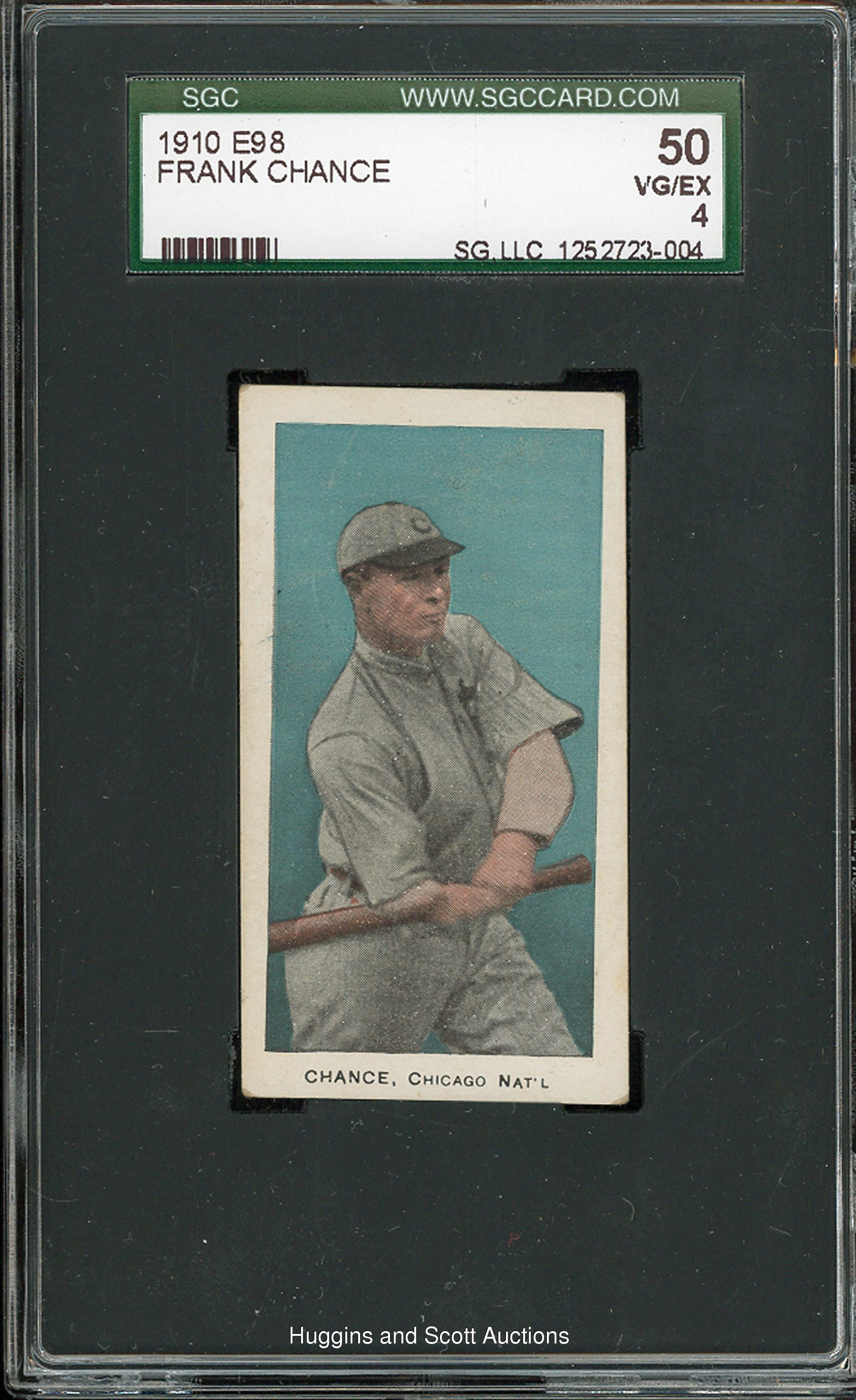 Graded 50 VG-EX 4 by SGC. Presented is a solid mid-grade 1910 E98 Frank Chance. This crease-free example has a blue background, reveals mild corner wear along with a slightly askew diamond cut.