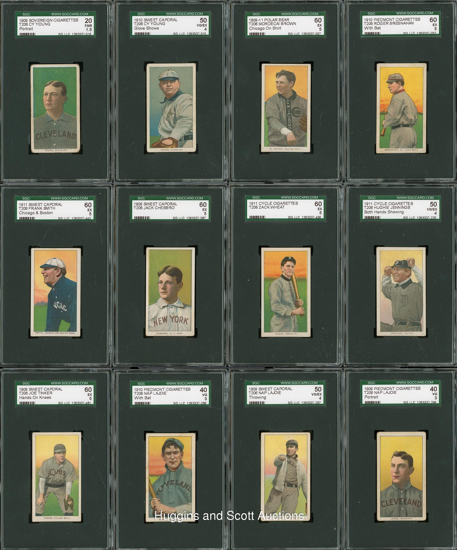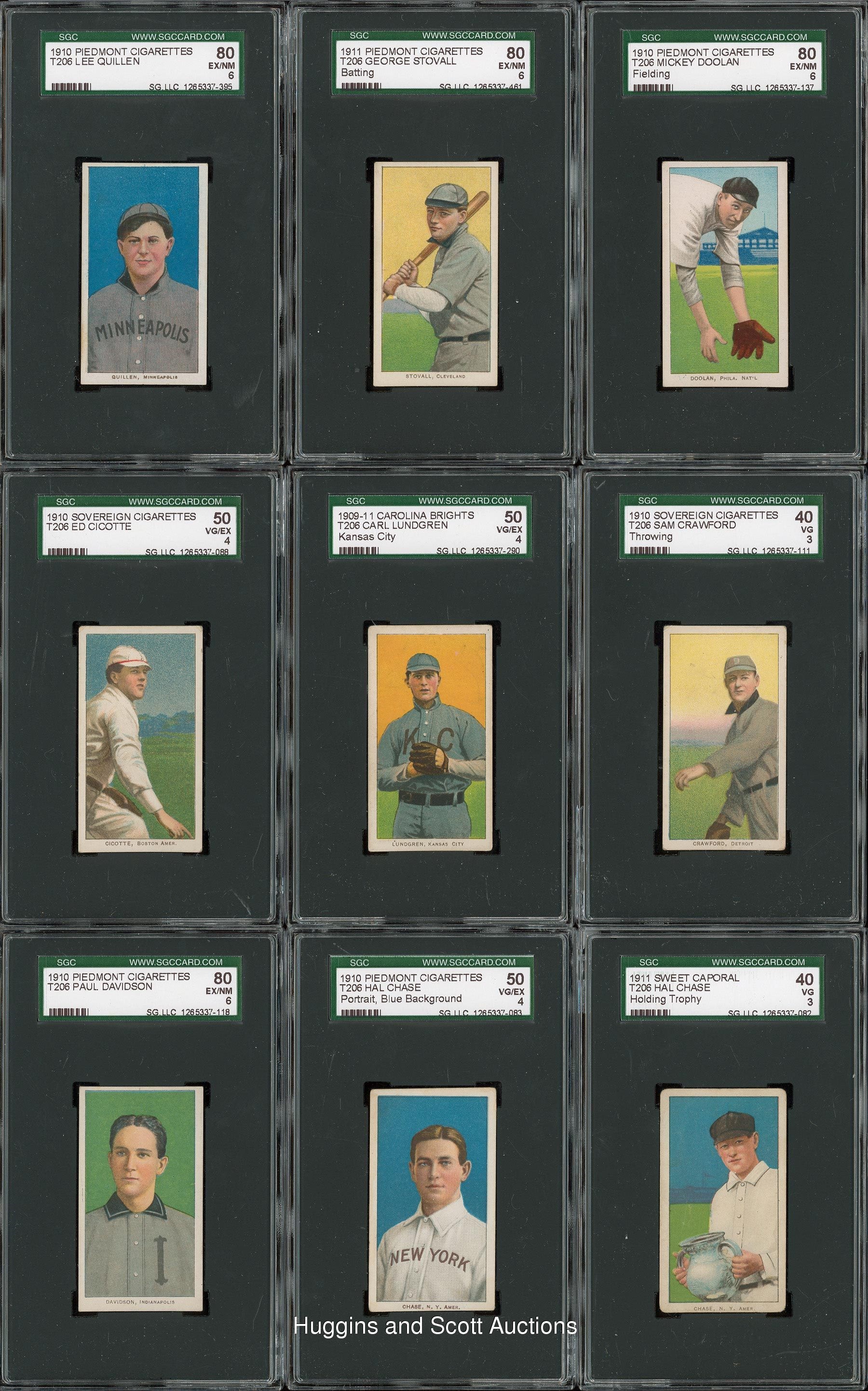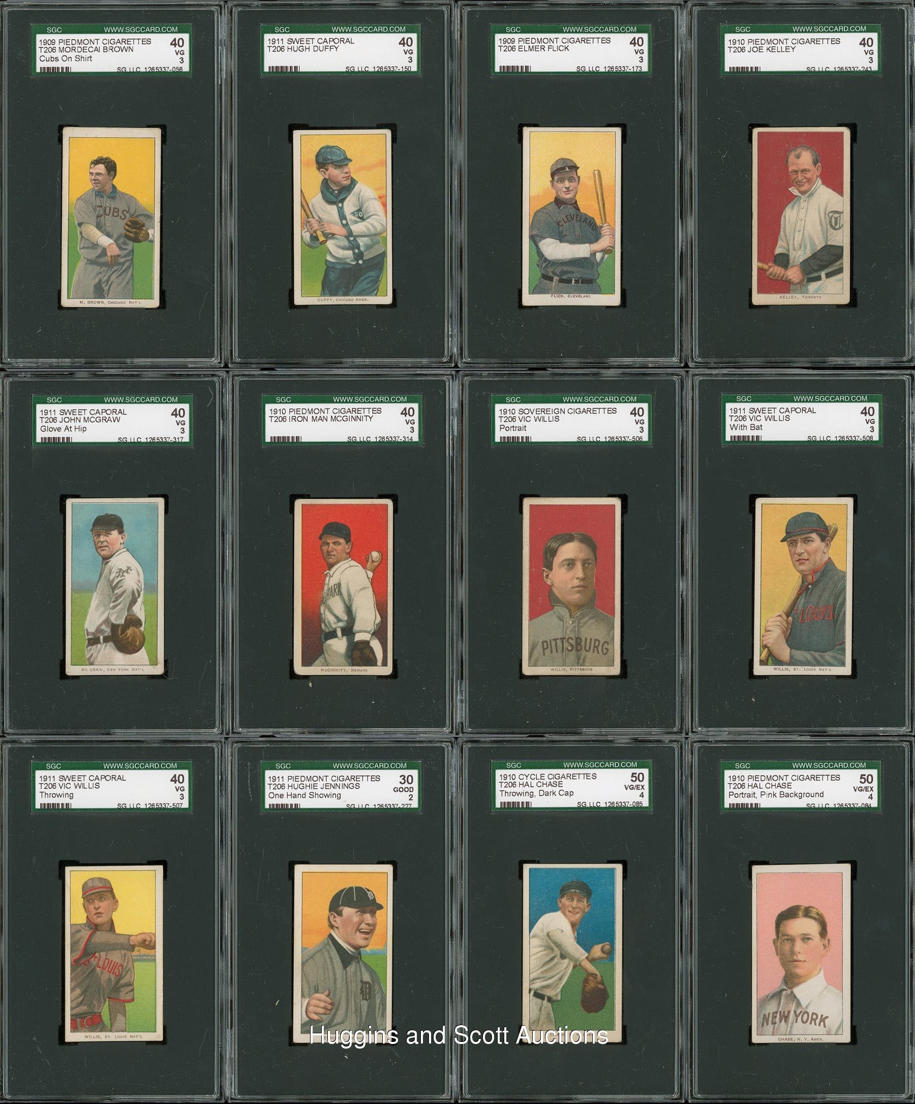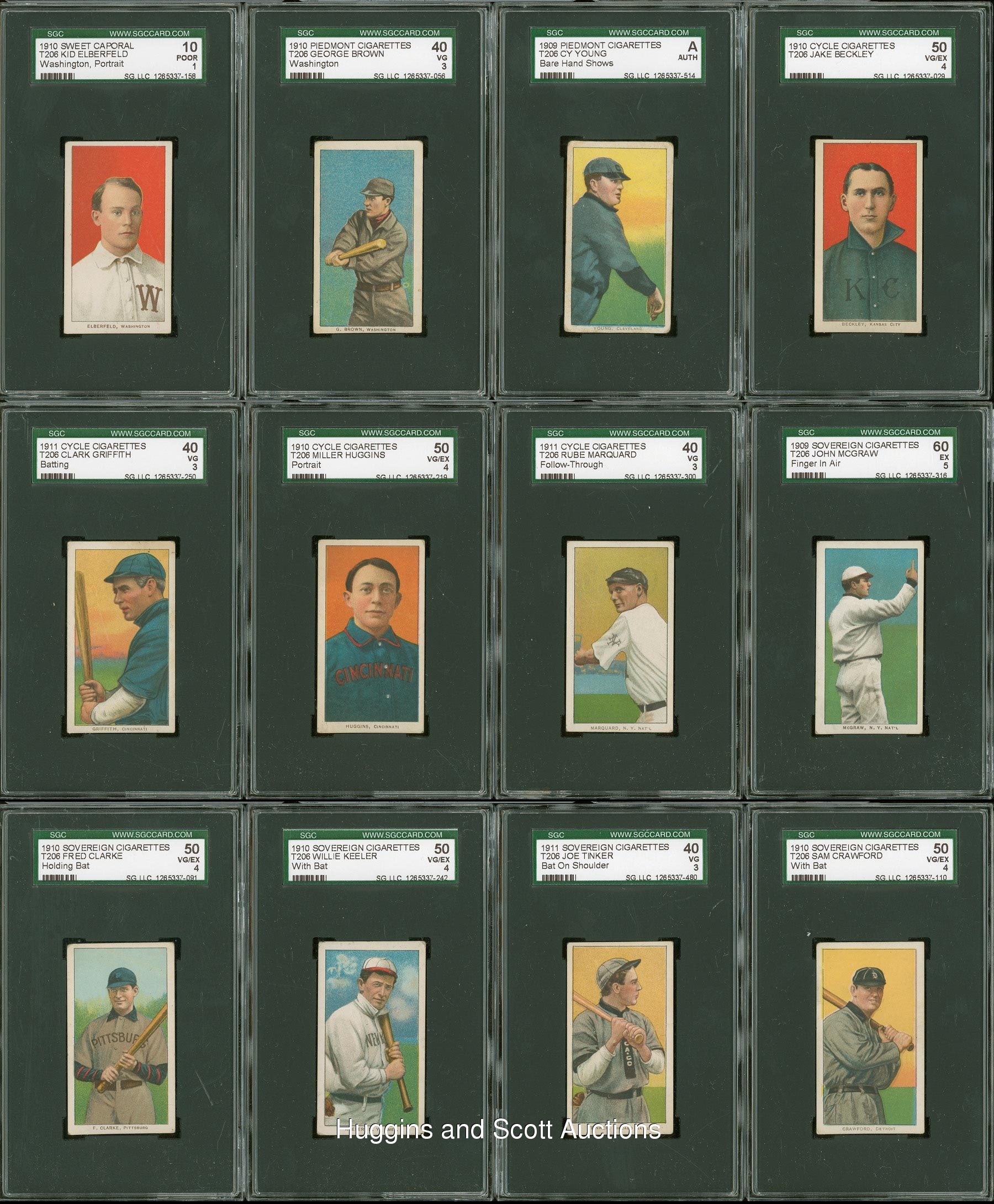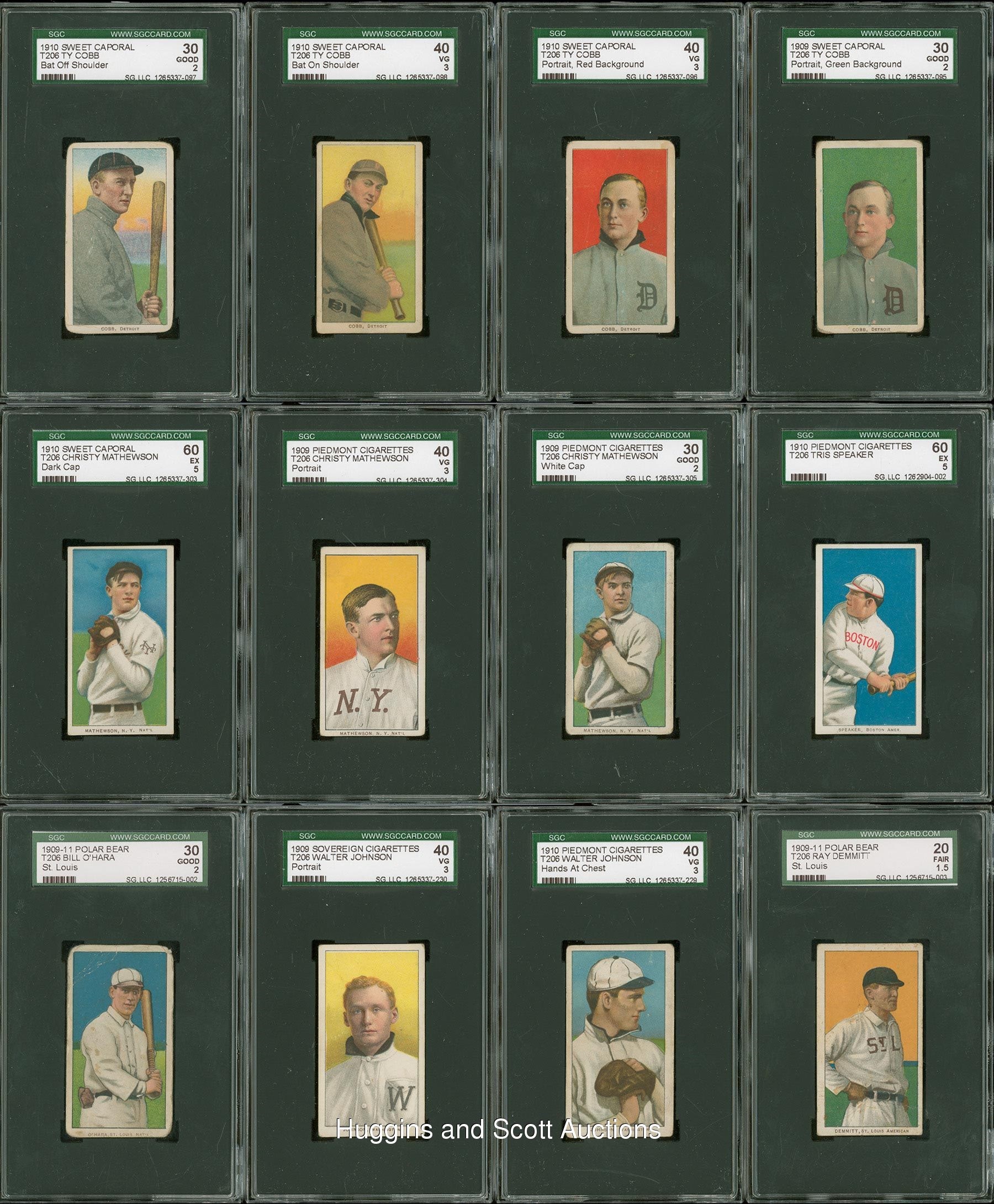 A century has passed since the early summer of 1909 when the American Tobacco Company (ATC) began an advertising campaign to market packages of Piedmont, Sweet Caporal and Sovereign cigarettes by distributing cardboard renderings of contemporary baseball stars. Though the half-page advertisements did not mention the other brands associated with the consortium, the “150 Series” became a runaway success on both the national and regional levels (“The Encyclopedia of Baseball Card, Volume 3—20th Century Tobacco Cards”, 1986, Lipset). From the research of Scott Reader, an article from the August 9, 1909 edition of the Charlotte Observer notes, “Since the beginning of summer, when the American Tobacco Company commenced putting the pictures in their packages of cigarettes, the small boy has been more or less of a nuisance by stopping young and old men as they walked along the street begging for “baseball men.” Although tobacco cards had been collected for decades, the ardor of what was to be designated as T206 helped root the baseball card collecting hobby. Securing examples from this famed set is considered a rite of passage; as holding a tangible piece of baseball history often leads to a lifelong pursuit of “The Monster.” In commemoration of the one hundredth year since its release, offered is a 1909-1911 T206 White Border near set of (520/524) cards that is missing only the “Big Four” (Plank and Magie are available separately in this auction) for completion. With each card graded and encapsulated by SGC, this #6 ranked gathering demonstrates an average weighted score of 46.69 with an accompanying set superiority rating of 45.24. The technical grade assessments follow: (4) SGC 80 (.8%), (5) SGC 70 (.9%), (95) SGC 60 (18.2%), (184) SGC 50 (35.4%), (188) SGC 40 (36.3%), (34) SGC 30 (6.5%), (6) SGC 20 (1.1%) and (4) SGC 10 (.8%). Additionally, the overall composition of the all-important advertising backs display: (100 uncommon backs) with (1) Carolina Brights, (36) Cycle (Seventeen 460), (2) El Principe De Gales, (23) Old Mill, (6) Polar Bear, (31) Sovereign (Two 460), (1) Tolstoi, (12) factory overprints and the remaining (420) with either Piedmont or Sweet Caporal backs. Featured are Hall of Famers/Stars: (81 cards, all common backs, unless noted) with SGC 60: Bresnahan (with Bat), M. Brown (Chicago on Shirt, Polar Bear), Chance (Batting), Chance (Yellow Portrait, Sweet Caporal Factory 42 overprint), Chesbro, Mathewson (Dark Cap), Speaker, Wheat (Cycle 460); SGC 50: Baker, Crawford (with Bat, Sovereign), Jennings (Both Hands Showing, Cycle 460), Lajoie (Throwing, Sweet Caporal Factory 649 overprint), C. Young (Glove Shows); SGC 40: Bresnahan (Portrait, Sweet Caporal Factory 649 overprint), Cobb (Bat on Shoulder), Cobb (Red Portrait), Crawford (Throwing, Sovereign), Flick, Griffith (Batting, Cycle 460), Johnson (Hands at Chest), Johnson (Portrait, Sovereign), Lajoie (Portrait), Lajoie (with Bat), Marquard (Follow-Through, Cycle 460), Mathewson (Portrait), Tinker (Bat on Shoulder, Sovereign 460), Willis (with Bat, Sweet Caporal Factory 42 overprint); SGC 30: Cobb (Bat Off Shoulder), Cobb (Green Portrait), Mathewson (White Cap), C. Young (Bare Hand Shows); SGC 20: C. Young (Portrait, Sovereign); Southern Leaguers: (48 cards, 17 Old Mill) with SGC 60: Bernhard, Mullaney, Revelle (Old Mill), Thornton; SGC 50: Carey (Old Mill), Coles (Old Mill), J. Hart, Helm (Old Mill), E. Howard (Old Mill), Kiernan, Hickman, McCauley (Old Mill), Orth, Paige, Rockenfeld, Ryan, Thebo, Westlake, F. White; Key Variations/Errors: (6 cards) with SGC 60: F. Smith (Chicago & Boston, Sweet Caporal Factory 42 overprint), SGC 30: O’Hara (St. Louis, Polar Bear, SGC 20: Demmitt (St. Louis, Polar Bear) and SGC 10: Elberfeld (Washington, Portrait). To review the magnificent scope of this carefully pieced-together collection, multiple images are available on our website, along with the respective grades for each card. Hall of Famers/Stars: (81 cards, all common backs, unless noted) with SGC 60: Bresnahan (with Bat), M. Brown (Chicago on Shirt, Polar Bear), Chance (Batting), Chance (Yellow Portrait, Sweet Caporal Factory 42 overprint), Chesbro, F. Clarke, Evers (with Bat, Cubs on Shirt), Gandil, Huggins (Hands at Mouth), Mathewson (Dark Cap), McGraw (Finger in Air, Sovereign), Speaker, Tinker (Hands on Knees), Waddell (Portrait), Wheat (Cycle 460); SGC 50: Baker, Beckley (Cycle), Bender (No Trees), Bender (with Trees), Chase (Blue Portrait), Chase (Pink Portrait), Chase (Throwing, Dark Cap, Cycle), Cicotte (Sovereign), F. Clarke (with Bat, Sovereign), J. Collins, Crawford (with Bat, Sovereign), G. Davis, Evers (with Bat, Chicago on Shirt), Huggins (Portrait, Cycle), Jennings (Both Hands Showing, Cycle 460), Joss (Pitching), Keeler (with Bat, Sovereign), Lajoie (Throwing, Sweet Caporal Factory 649 overprint), Marquard (Hands at Thighs), McGraw (Portrait, No Cap), McGraw (Portrait, with Cap), Tinker (Portrait), Waddell (Throwing), C. Young (Glove Shows); SGC 40: Bender (Portrait), Bresnahan (Portrait, Sweet Caporal Factory 649 overprint), M. Brown (Cubs on Shirt), Chance (Red Portrait), Chase (Holding Trophy), Chase (Throwing, White Cap), Cobb (Bat on Shoulder), Cobb (Red Portrait), E. Collins, Crawford (Throwing, Sovereign), Duffy, Evers (Portrait), Flick, Griffith (Batting, Cycle 460), Griffith (Portrait), Jennings (Portrait), Johnson (Hands at Chest), Johnson (Portrait, Sovereign), Joss (Portrait), Keeler (Portrait), Kelley, Lajoie (Portrait), Lajoie (with Bat), Marquard (Follow-Through, Cycle 460), Marquard (Portrait), Mathewson (Portrait), McGinnity, McGraw (Glove at Hip), Tinker (Bat on Shoulder, Sovereign 460), Wallace (Sovereign), Walsh, Willis (Portrait, Sovereign), Willis (Throwing), Willis (with Bat, Sweet Caporal Factory 42 overprint); SGC 30: M. Brown (Portrait), Cobb (Bat Off Shoulder), Cobb (Green Portrait), Jennings (One Hand Showing), Mathewson (White Cap), Tinker (Bat Off Shoulder), C. Y
