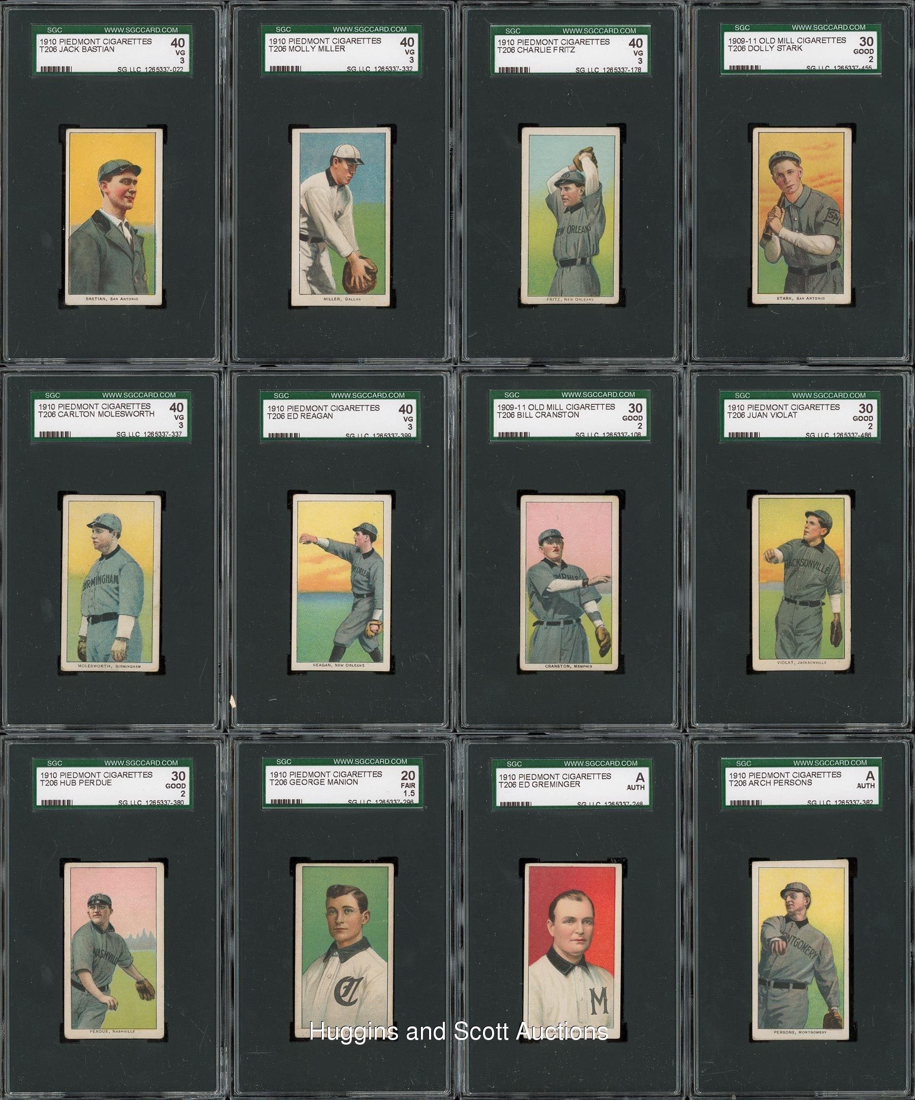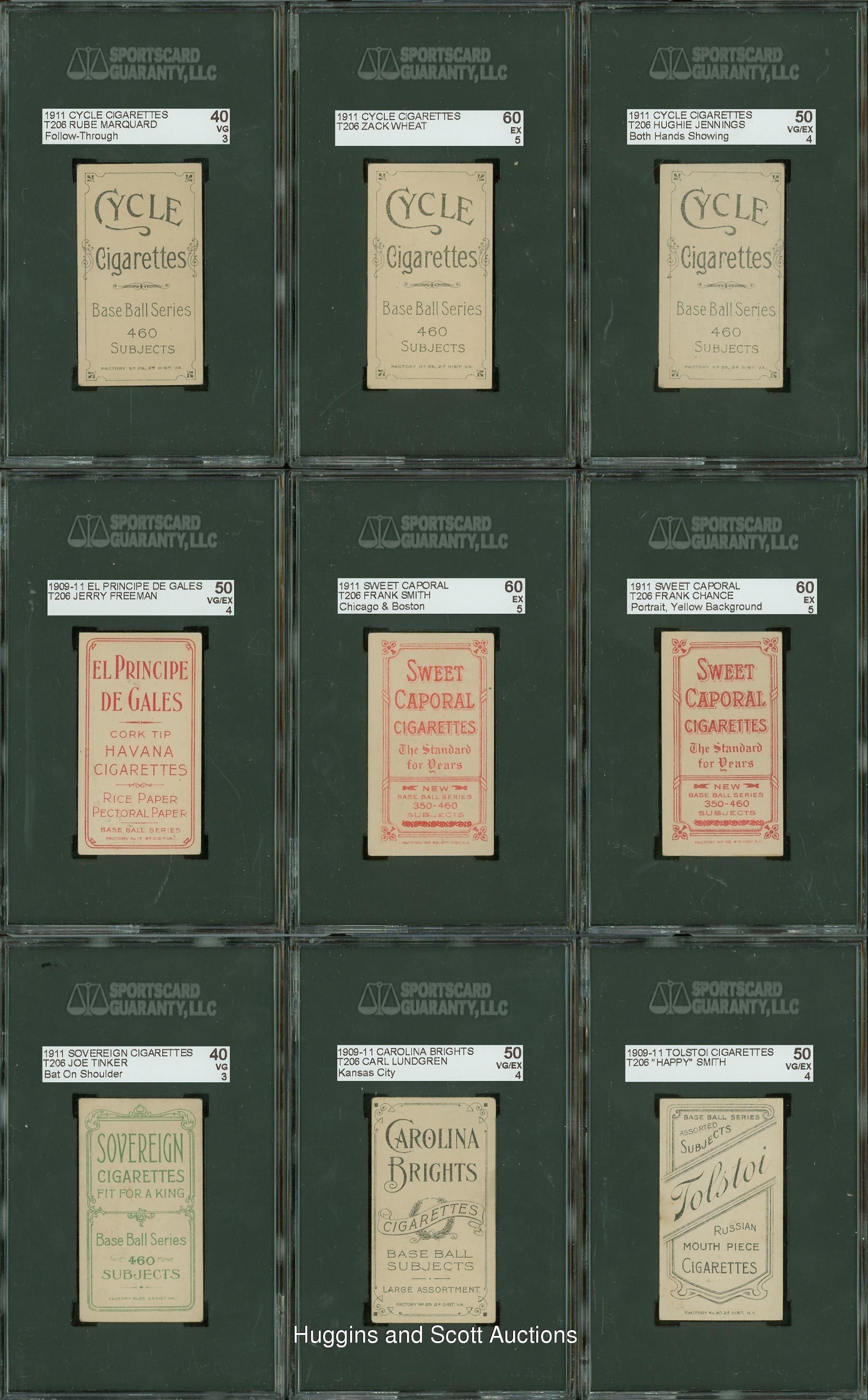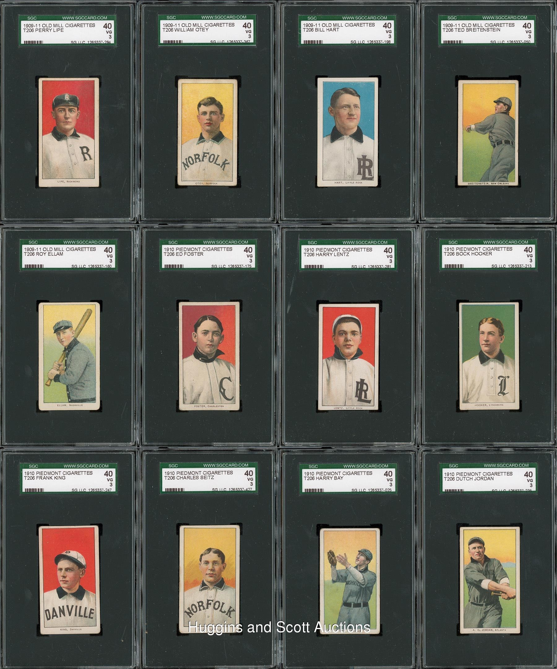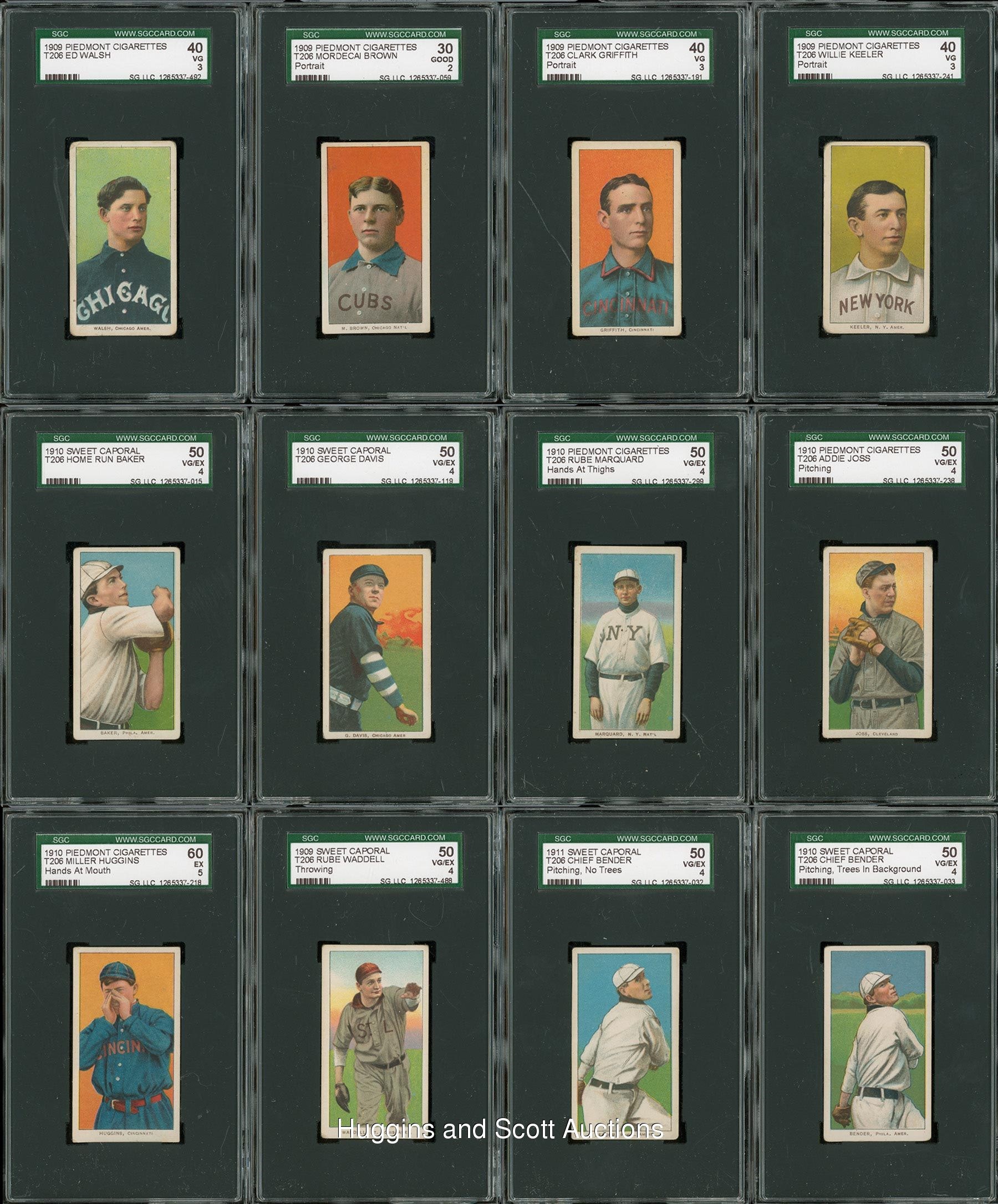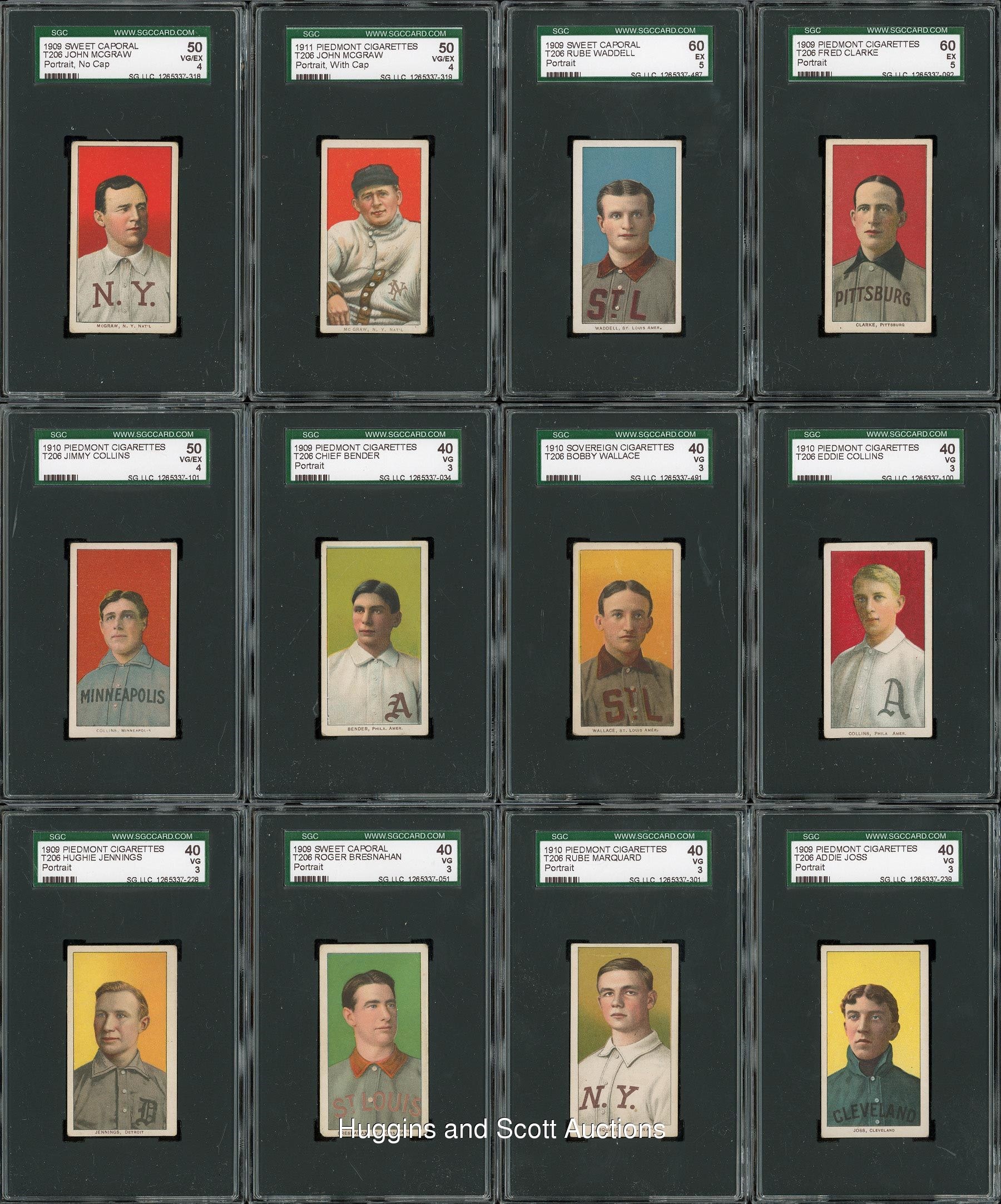 A century has passed since the early summer of 1909 when the American Tobacco Company (ATC) began an advertising campaign to market packages of Piedmont, Sweet Caporal and Sovereign cigarettes by distributing cardboard renderings of contemporary baseball stars. Though the half-page advertisements did not mention the other brands associated with the consortium, the “150 Series” became a runaway success on both the national and regional levels (“The Encyclopedia of Baseball Card, Volume 3—20th Century Tobacco Cards”, 1986, Lipset). From the research of Scott Reader, an article from the August 9, 1909 edition of the Charlotte Observer notes, “Since the beginning of summer, when the American Tobacco Company commenced putting the pictures in their packages of cigarettes, the small boy has been more or less of a nuisance by stopping young and old men as they walked along the street begging for “baseball men.” Although tobacco cards had been collected for decades, the ardor of what was to be designated as T206 helped root the baseball card collecting hobby. Securing examples from this famed set is considered a rite of passage; as holding a tangible piece of baseball history often leads to a lifelong pursuit of “The Monster.” In commemoration of the one hundredth year since its release, offered is a 1909-1911 T206 White Border near set of (520/524) cards that is missing only the “Big Four” (Plank and Magie are available separately in this auction) for completion. With each card graded and encapsulated by SGC, this #6 ranked gathering demonstrates an average weighted score of 46.69 with an accompanying set superiority rating of 45.24. The technical grade assessments follow: (4) SGC 80 (.8%), (5) SGC 70 (.9%), (95) SGC 60 (18.2%), (184) SGC 50 (35.4%), (188) SGC 40 (36.3%), (34) SGC 30 (6.5%), (6) SGC 20 (1.1%) and (4) SGC 10 (.8%). Additionally, the overall composition of the all-important advertising backs display: (100 uncommon backs) with (1) Carolina Brights, (36) Cycle (Seventeen 460), (2) El Principe De Gales, (23) Old Mill, (6) Polar Bear, (31) Sovereign (Two 460), (1) Tolstoi, (12) factory overprints and the remaining (420) with either Piedmont or Sweet Caporal backs. Featured are Hall of Famers/Stars: (81 cards, all common backs, unless noted) with SGC 60: Bresnahan (with Bat), M. Brown (Chicago on Shirt, Polar Bear), Chance (Batting), Chance (Yellow Portrait, Sweet Caporal Factory 42 overprint), Chesbro, Mathewson (Dark Cap), Speaker, Wheat (Cycle 460); SGC 50: Baker, Crawford (with Bat, Sovereign), Jennings (Both Hands Showing, Cycle 460), Lajoie (Throwing, Sweet Caporal Factory 649 overprint), C. Young (Glove Shows); SGC 40: Bresnahan (Portrait, Sweet Caporal Factory 649 overprint), Cobb (Bat on Shoulder), Cobb (Red Portrait), Crawford (Throwing, Sovereign), Flick, Griffith (Batting, Cycle 460), Johnson (Hands at Chest), Johnson (Portrait, Sovereign), Lajoie (Portrait), Lajoie (with Bat), Marquard (Follow-Through, Cycle 460), Mathewson (Portrait), Tinker (Bat on Shoulder, Sovereign 460), Willis (with Bat, Sweet Caporal Factory 42 overprint); SGC 30: Cobb (Bat Off Shoulder), Cobb (Green Portrait), Mathewson (White Cap), C. Young (Bare Hand Shows); SGC 20: C. Young (Portrait, Sovereign); Southern Leaguers: (48 cards, 17 Old Mill) with SGC 60: Bernhard, Mullaney, Revelle (Old Mill), Thornton; SGC 50: Carey (Old Mill), Coles (Old Mill), J. Hart, Helm (Old Mill), E. Howard (Old Mill), Kiernan, Hickman, McCauley (Old Mill), Orth, Paige, Rockenfeld, Ryan, Thebo, Westlake, F. White; Key Variations/Errors: (6 cards) with SGC 60: F. Smith (Chicago & Boston, Sweet Caporal Factory 42 overprint), SGC 30: O’Hara (St. Louis, Polar Bear, SGC 20: Demmitt (St. Louis, Polar Bear) and SGC 10: Elberfeld (Washington, Portrait). To review the magnificent scope of this carefully pieced-together collection, multiple images are available on our website, along with the respective grades for each card. Hall of Famers/Stars: (81 cards, all common backs, unless noted) with SGC 60: Bresnahan (with Bat), M. Brown (Chicago on Shirt, Polar Bear), Chance (Batting), Chance (Yellow Portrait, Sweet Caporal Factory 42 overprint), Chesbro, F. Clarke, Evers (with Bat, Cubs on Shirt), Gandil, Huggins (Hands at Mouth), Mathewson (Dark Cap), McGraw (Finger in Air, Sovereign), Speaker, Tinker (Hands on Knees), Waddell (Portrait), Wheat (Cycle 460); SGC 50: Baker, Beckley (Cycle), Bender (No Trees), Bender (with Trees), Chase (Blue Portrait), Chase (Pink Portrait), Chase (Throwing, Dark Cap, Cycle), Cicotte (Sovereign), F. Clarke (with Bat, Sovereign), J. Collins, Crawford (with Bat, Sovereign), G. Davis, Evers (with Bat, Chicago on Shirt), Huggins (Portrait, Cycle), Jennings (Both Hands Showing, Cycle 460), Joss (Pitching), Keeler (with Bat, Sovereign), Lajoie (Throwing, Sweet Caporal Factory 649 overprint), Marquard (Hands at Thighs), McGraw (Portrait, No Cap), McGraw (Portrait, with Cap), Tinker (Portrait), Waddell (Throwing), C. Young (Glove Shows); SGC 40: Bender (Portrait), Bresnahan (Portrait, Sweet Caporal Factory 649 overprint), M. Brown (Cubs on Shirt), Chance (Red Portrait), Chase (Holding Trophy), Chase (Throwing, White Cap), Cobb (Bat on Shoulder), Cobb (Red Portrait), E. Collins, Crawford (Throwing, Sovereign), Duffy, Evers (Portrait), Flick, Griffith (Batting, Cycle 460), Griffith (Portrait), Jennings (Portrait), Johnson (Hands at Chest), Johnson (Portrait, Sovereign), Joss (Portrait), Keeler (Portrait), Kelley, Lajoie (Portrait), Lajoie (with Bat), Marquard (Follow-Through, Cycle 460), Marquard (Portrait), Mathewson (Portrait), McGinnity, McGraw (Glove at Hip), Tinker (Bat on Shoulder, Sovereign 460), Wallace (Sovereign), Walsh, Willis (Portrait, Sovereign), Willis (Throwing), Willis (with Bat, Sweet Caporal Factory 42 overprint); SGC 30: M. Brown (Portrait), Cobb (Bat Off Shoulder), Cobb (Green Portrait), Jennings (One Hand Showing), Mathewson (White Cap), Tinker (Bat Off Shoulder), C. Y