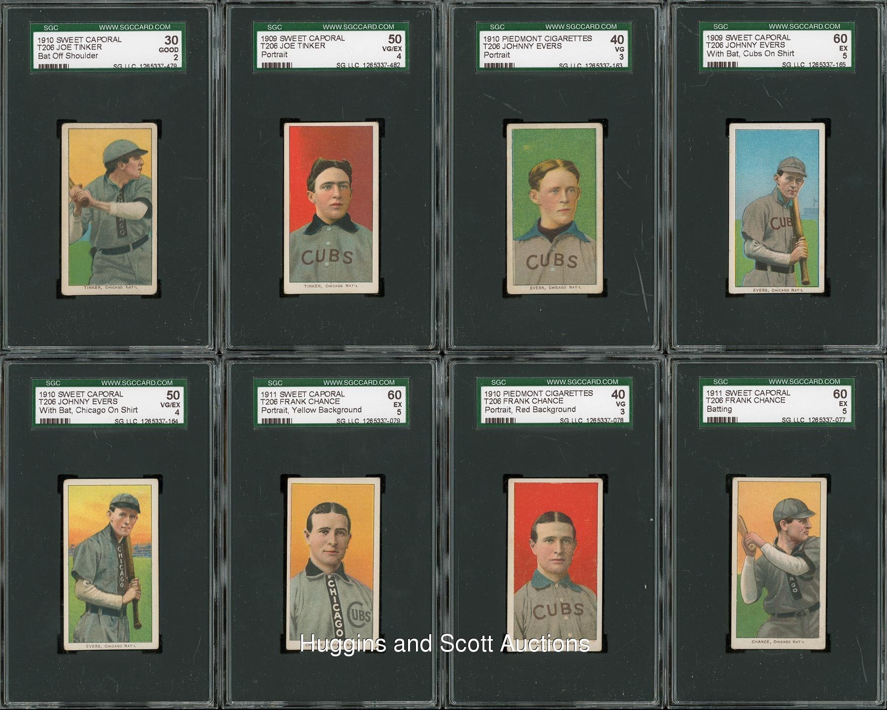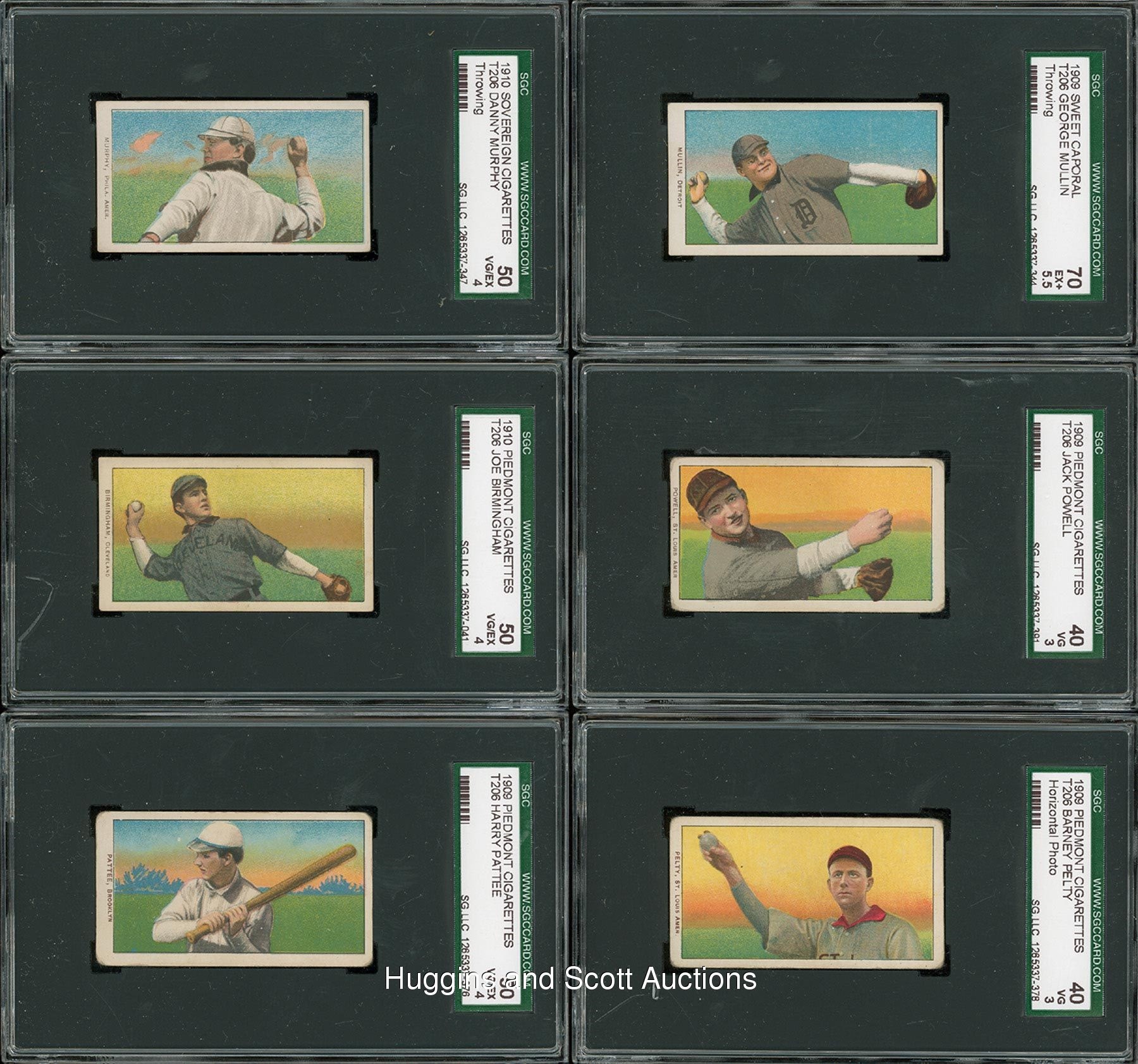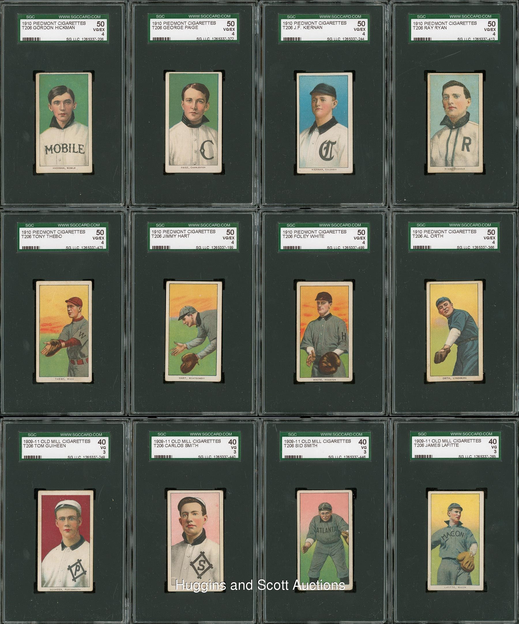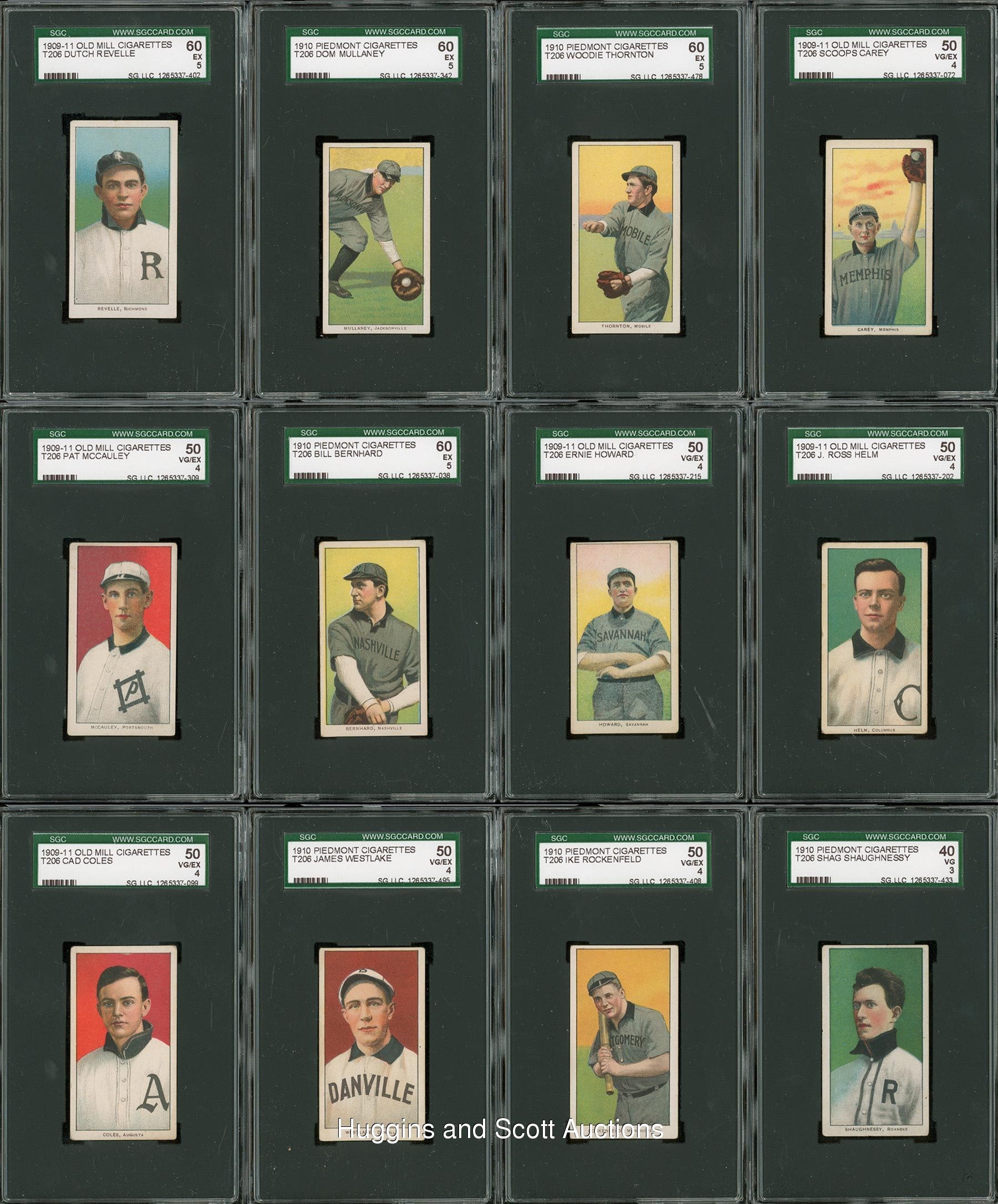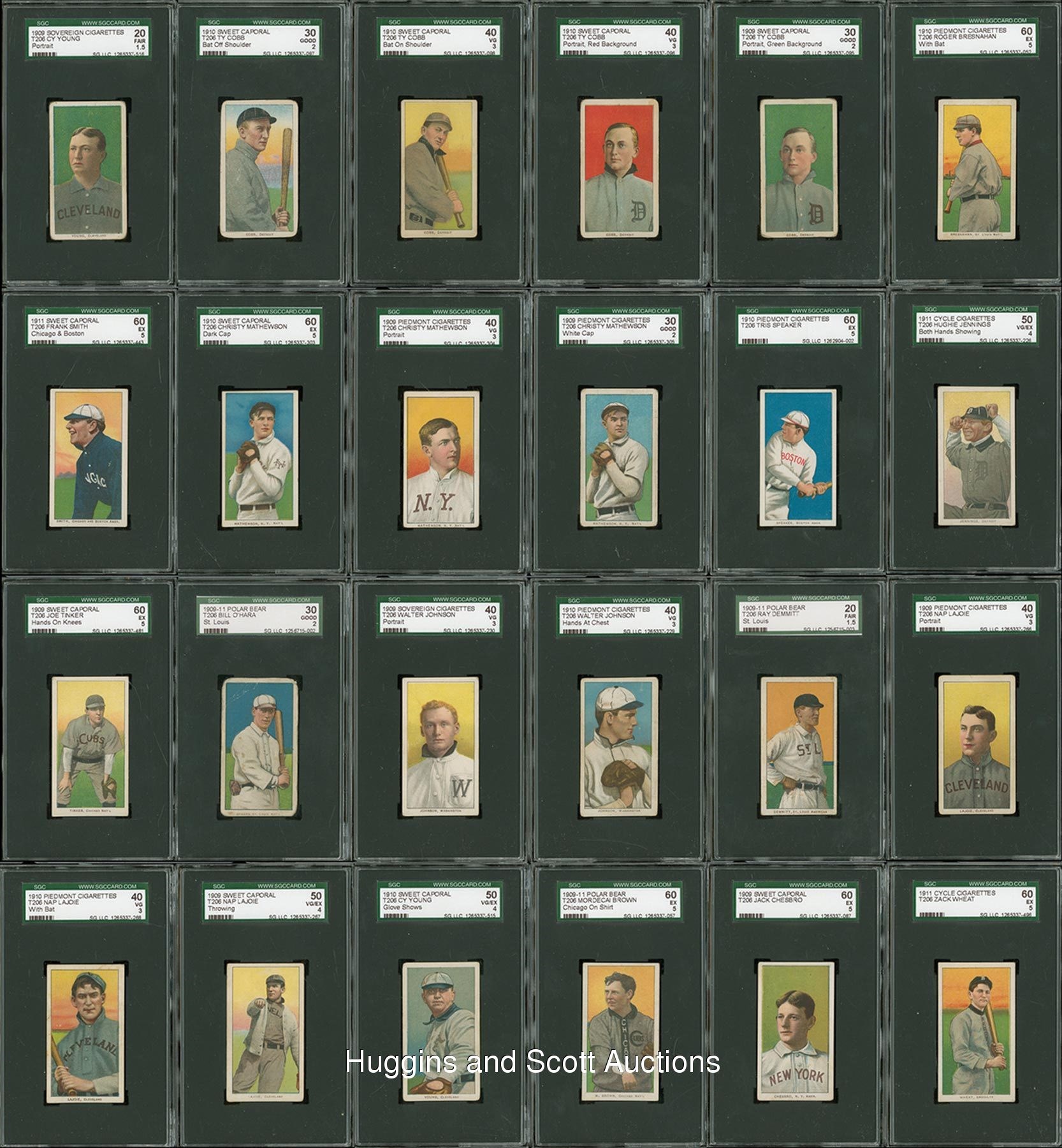 A century has passed since the early summer of 1909 when the American Tobacco Company (ATC) began an advertising campaign to market packages of Piedmont, Sweet Caporal and Sovereign cigarettes by distributing cardboard renderings of contemporary baseball stars. Though the half-page advertisements did not mention the other brands associated with the consortium, the “150 Series” became a runaway success on both the national and regional levels (“The Encyclopedia of Baseball Card, Volume 3—20th Century Tobacco Cards”, 1986, Lipset). From the research of Scott Reader, an article from the August 9, 1909 edition of the Charlotte Observer notes, “Since the beginning of summer, when the American Tobacco Company commenced putting the pictures in their packages of cigarettes, the small boy has been more or less of a nuisance by stopping young and old men as they walked along the street begging for “baseball men.” Although tobacco cards had been collected for decades, the ardor of what was to be designated as T206 helped root the baseball card collecting hobby. Securing examples from this famed set is considered a rite of passage; as holding a tangible piece of baseball history often leads to a lifelong pursuit of “The Monster.” In commemoration of the one hundredth year since its release, offered is a 1909-1911 T206 White Border near set of (520/524) cards that is missing only the “Big Four” (Plank and Magie are available separately in this auction) for completion. With each card graded and encapsulated by SGC, this #6 ranked gathering demonstrates an average weighted score of 46.69 with an accompanying set superiority rating of 45.24. The technical grade assessments follow: (4) SGC 80 (.8%), (5) SGC 70 (.9%), (95) SGC 60 (18.2%), (184) SGC 50 (35.4%), (188) SGC 40 (36.3%), (34) SGC 30 (6.5%), (6) SGC 20 (1.1%) and (4) SGC 10 (.8%). Additionally, the overall composition of the all-important advertising backs display: (100 uncommon backs) with (1) Carolina Brights, (36) Cycle (Seventeen 460), (2) El Principe De Gales, (23) Old Mill, (6) Polar Bear, (31) Sovereign (Two 460), (1) Tolstoi, (12) factory overprints and the remaining (420) with either Piedmont or Sweet Caporal backs. Featured are Hall of Famers/Stars: (81 cards, all common backs, unless noted) with SGC 60: Bresnahan (with Bat), M. Brown (Chicago on Shirt, Polar Bear), Chance (Batting), Chance (Yellow Portrait, Sweet Caporal Factory 42 overprint), Chesbro, Mathewson (Dark Cap), Speaker, Wheat (Cycle 460); SGC 50: Baker, Crawford (with Bat, Sovereign), Jennings (Both Hands Showing, Cycle 460), Lajoie (Throwing, Sweet Caporal Factory 649 overprint), C. Young (Glove Shows); SGC 40: Bresnahan (Portrait, Sweet Caporal Factory 649 overprint), Cobb (Bat on Shoulder), Cobb (Red Portrait), Crawford (Throwing, Sovereign), Flick, Griffith (Batting, Cycle 460), Johnson (Hands at Chest), Johnson (Portrait, Sovereign), Lajoie (Portrait), Lajoie (with Bat), Marquard (Follow-Through, Cycle 460), Mathewson (Portrait), Tinker (Bat on Shoulder, Sovereign 460), Willis (with Bat, Sweet Caporal Factory 42 overprint); SGC 30: Cobb (Bat Off Shoulder), Cobb (Green Portrait), Mathewson (White Cap), C. Young (Bare Hand Shows); SGC 20: C. Young (Portrait, Sovereign); Southern Leaguers: (48 cards, 17 Old Mill) with SGC 60: Bernhard, Mullaney, Revelle (Old Mill), Thornton; SGC 50: Carey (Old Mill), Coles (Old Mill), J. Hart, Helm (Old Mill), E. Howard (Old Mill), Kiernan, Hickman, McCauley (Old Mill), Orth, Paige, Rockenfeld, Ryan, Thebo, Westlake, F. White; Key Variations/Errors: (6 cards) with SGC 60: F. Smith (Chicago & Boston, Sweet Caporal Factory 42 overprint), SGC 30: O’Hara (St. Louis, Polar Bear, SGC 20: Demmitt (St. Louis, Polar Bear) and SGC 10: Elberfeld (Washington, Portrait). To review the magnificent scope of this carefully pieced-together collection, multiple images are available on our website, along with the respective grades for each card. Hall of Famers/Stars: (81 cards, all common backs, unless noted) with SGC 60: Bresnahan (with Bat), M. Brown (Chicago on Shirt, Polar Bear), Chance (Batting), Chance (Yellow Portrait, Sweet Caporal Factory 42 overprint), Chesbro, F. Clarke, Evers (with Bat, Cubs on Shirt), Gandil, Huggins (Hands at Mouth), Mathewson (Dark Cap), McGraw (Finger in Air, Sovereign), Speaker, Tinker (Hands on Knees), Waddell (Portrait), Wheat (Cycle 460); SGC 50: Baker, Beckley (Cycle), Bender (No Trees), Bender (with Trees), Chase (Blue Portrait), Chase (Pink Portrait), Chase (Throwing, Dark Cap, Cycle), Cicotte (Sovereign), F. Clarke (with Bat, Sovereign), J. Collins, Crawford (with Bat, Sovereign), G. Davis, Evers (with Bat, Chicago on Shirt), Huggins (Portrait, Cycle), Jennings (Both Hands Showing, Cycle 460), Joss (Pitching), Keeler (with Bat, Sovereign), Lajoie (Throwing, Sweet Caporal Factory 649 overprint), Marquard (Hands at Thighs), McGraw (Portrait, No Cap), McGraw (Portrait, with Cap), Tinker (Portrait), Waddell (Throwing), C. Young (Glove Shows); SGC 40: Bender (Portrait), Bresnahan (Portrait, Sweet Caporal Factory 649 overprint), M. Brown (Cubs on Shirt), Chance (Red Portrait), Chase (Holding Trophy), Chase (Throwing, White Cap), Cobb (Bat on Shoulder), Cobb (Red Portrait), E. Collins, Crawford (Throwing, Sovereign), Duffy, Evers (Portrait), Flick, Griffith (Batting, Cycle 460), Griffith (Portrait), Jennings (Portrait), Johnson (Hands at Chest), Johnson (Portrait, Sovereign), Joss (Portrait), Keeler (Portrait), Kelley, Lajoie (Portrait), Lajoie (with Bat), Marquard (Follow-Through, Cycle 460), Marquard (Portrait), Mathewson (Portrait), McGinnity, McGraw (Glove at Hip), Tinker (Bat on Shoulder, Sovereign 460), Wallace (Sovereign), Walsh, Willis (Portrait, Sovereign), Willis (Throwing), Willis (with Bat, Sweet Caporal Factory 42 overprint); SGC 30: M. Brown (Portrait), Cobb (Bat Off Shoulder), Cobb (Green Portrait), Jennings (One Hand Showing), Mathewson (White Cap), Tinker (Bat Off Shoulder), C. Y