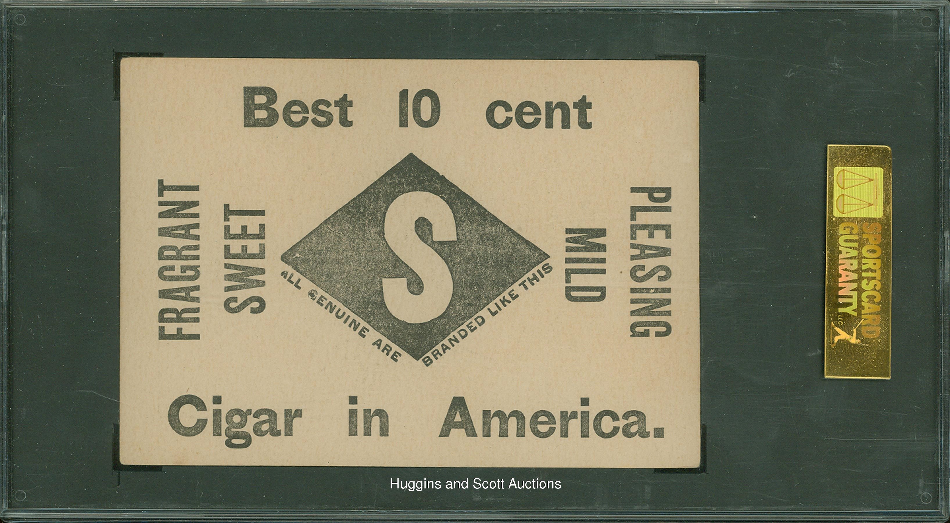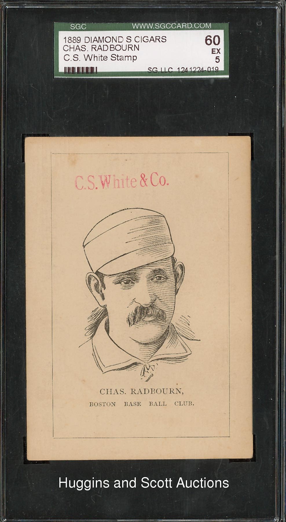 The nineteenth-century tobacco specialist will want to secure this 1889 Diamond S Cigars Charles Radbourn example, graded 60 EX 5 by SGC. Accentuated by a firmly pressed C.S. White store advertisement stamp, the Boston hurler’s card is detracted only by mild peripheral wear. The black ink on the reverse is pronounced and otherwise problem-free. An ideal accompaniment for the Hall of Fame type collector that will find a permanent home in any advanced collection.