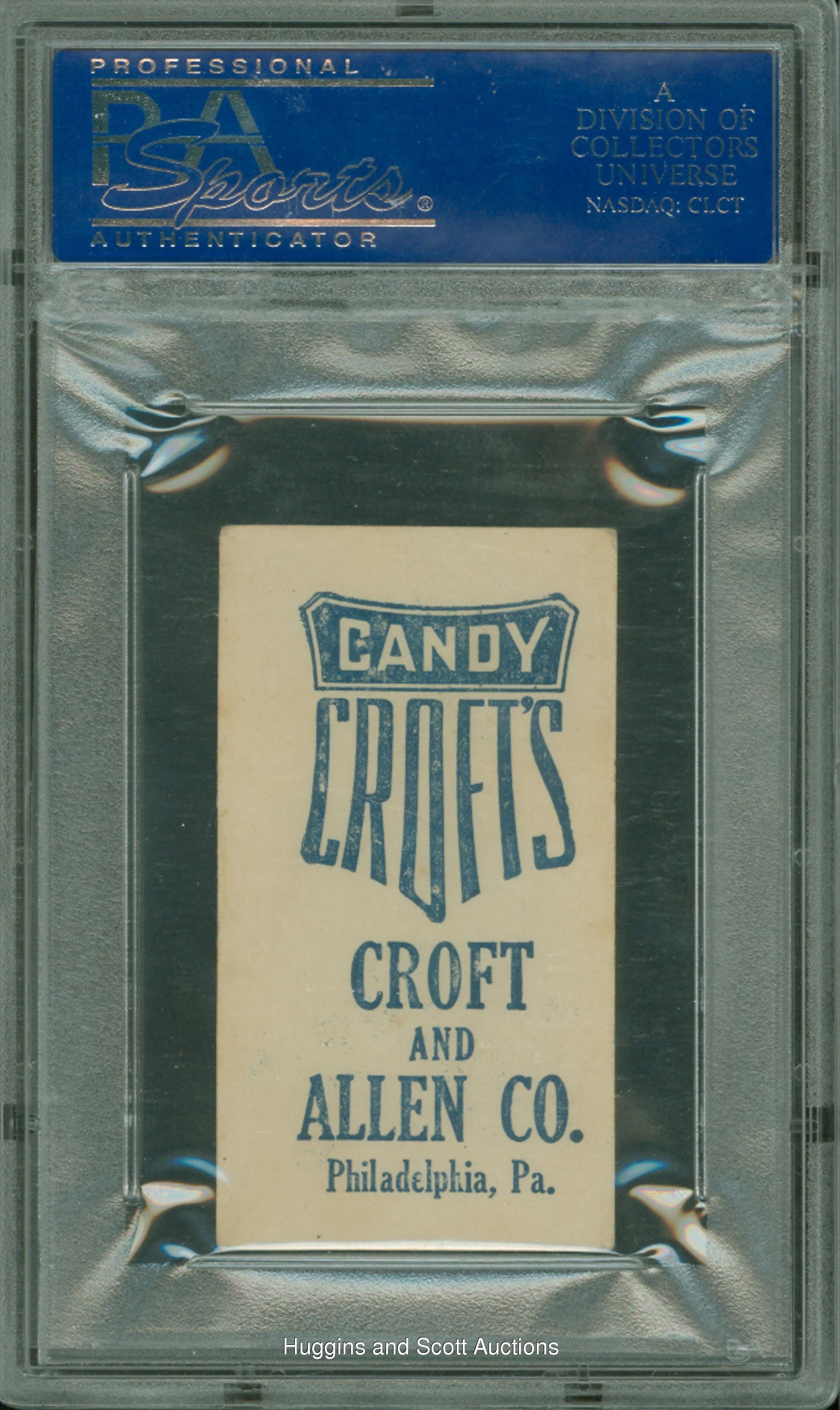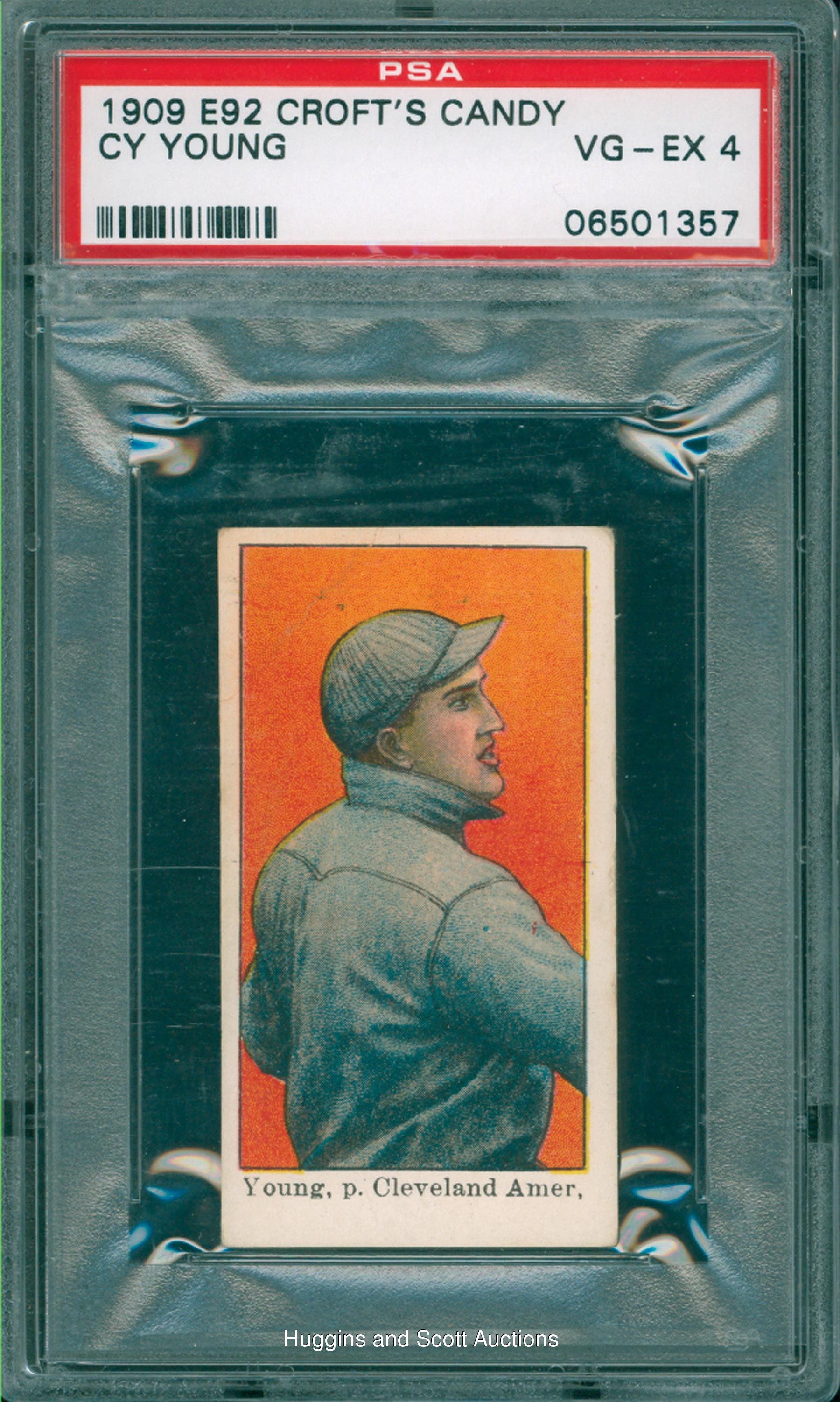 An integral card in the 1909 E92 Croft’s Candy series is found with the offered Cy Young example. Judged VG-EX 4 by PSA, only four such examples have been judged by the grading service. This blue-backed beauty boasts solid coloring, precise registration and a clean advertising reverse. Despite a barely distinguishable crease that traces through the upper left reverse, this scarce Hall of Fame relic will find its rightful place in an advanced collection.