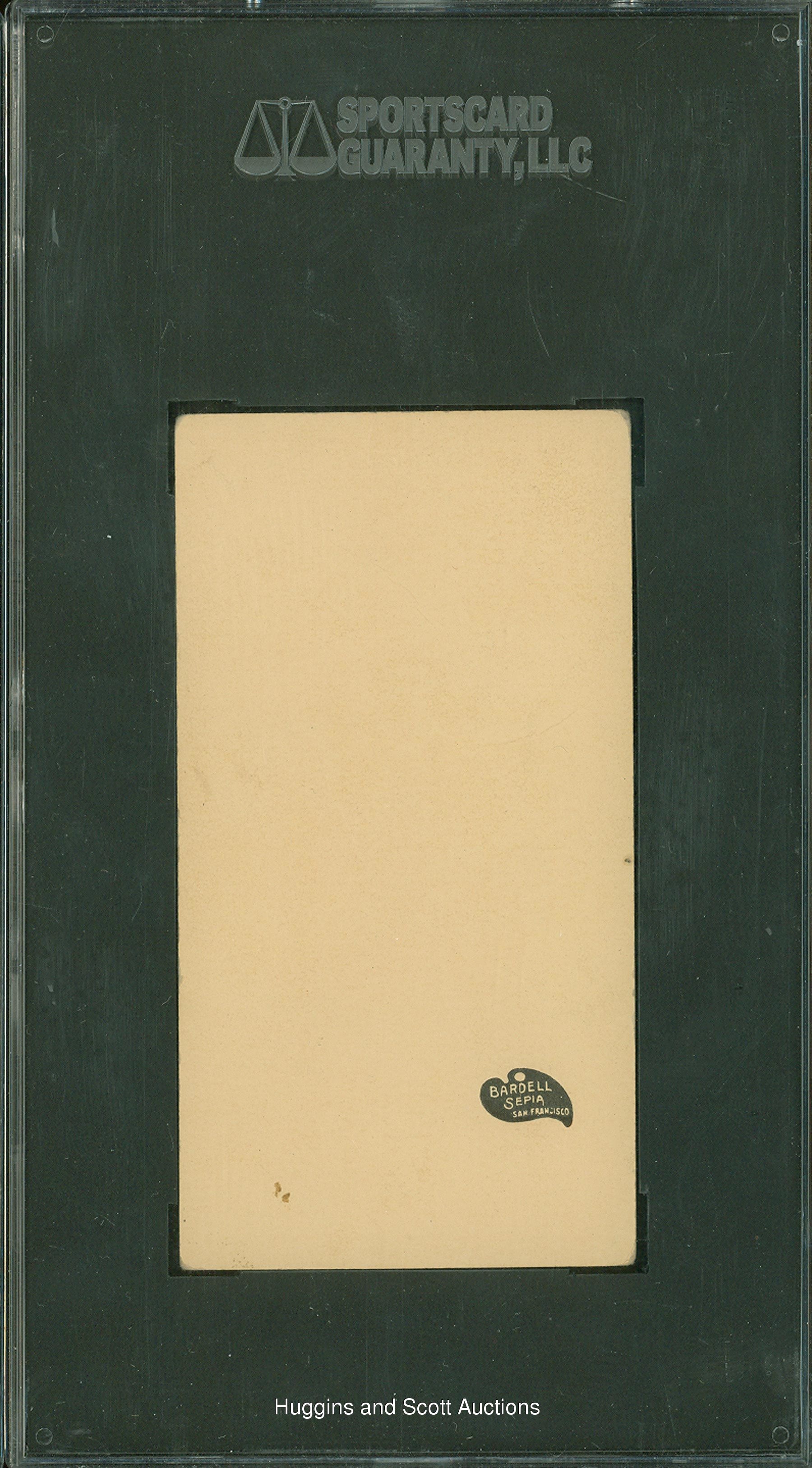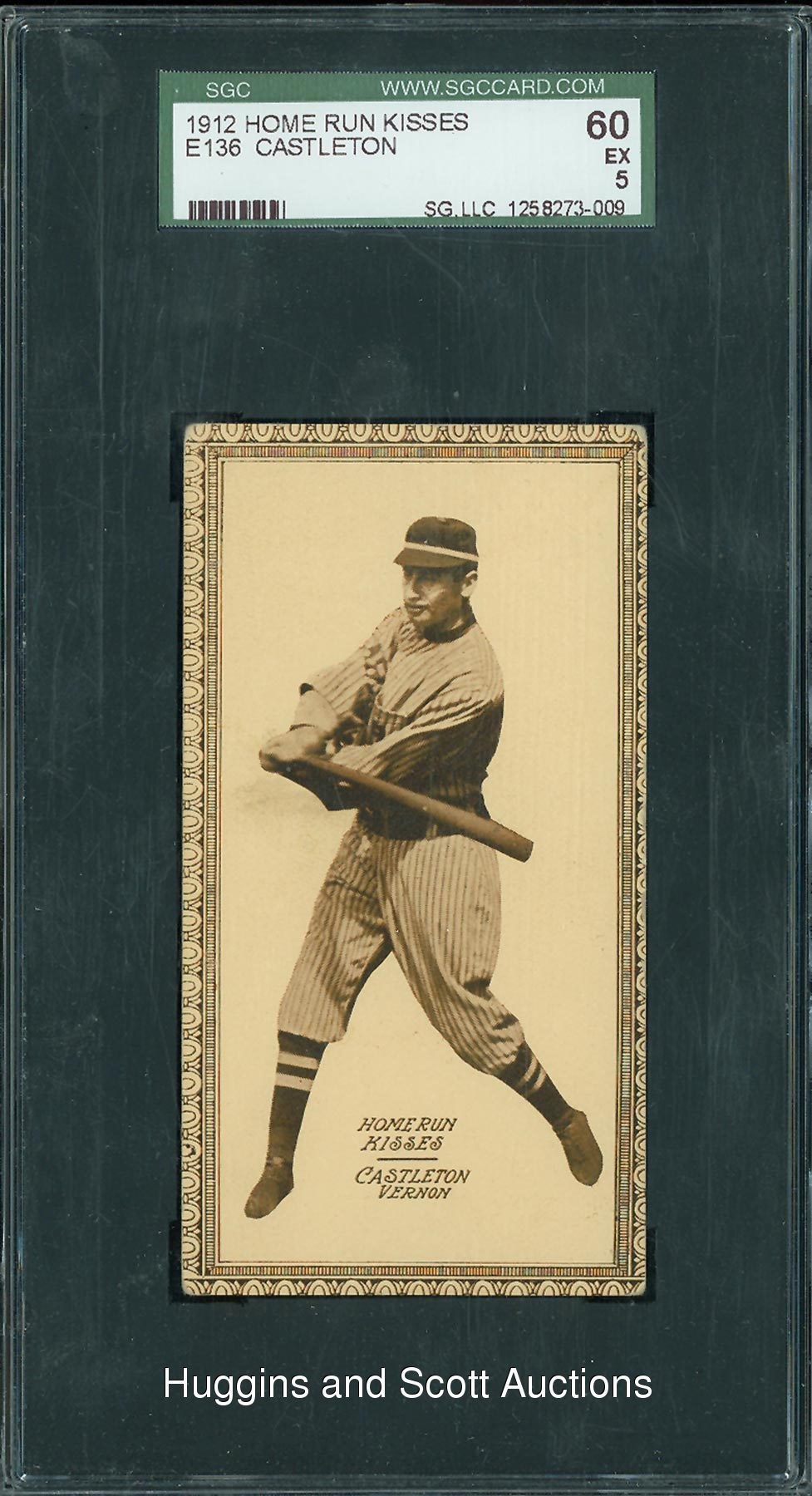 Graded 60 EX 5 by SGC. The offered 1912 E136 Home Run Kisses Roy Castleton is the only such example to have been graded by either PSA or SGC. This crease-free antiquity reveals only light corner wear and surface soiling commensurate with the technical grade. The Bardell Sepia back is clean and problem-free. Of particular note, Castleton was the first member of the Church of Jesus Christ of Latter-day Saints (Mormon) to play in the major leagues, proving this to be quite a find among such niche collectors. For more details, visit our website. According to the population reports of both grading services, of the (104) combined Home Run Kisses judged by the grading services this specimen shares the grading tier with fourteen other examples with only two better.