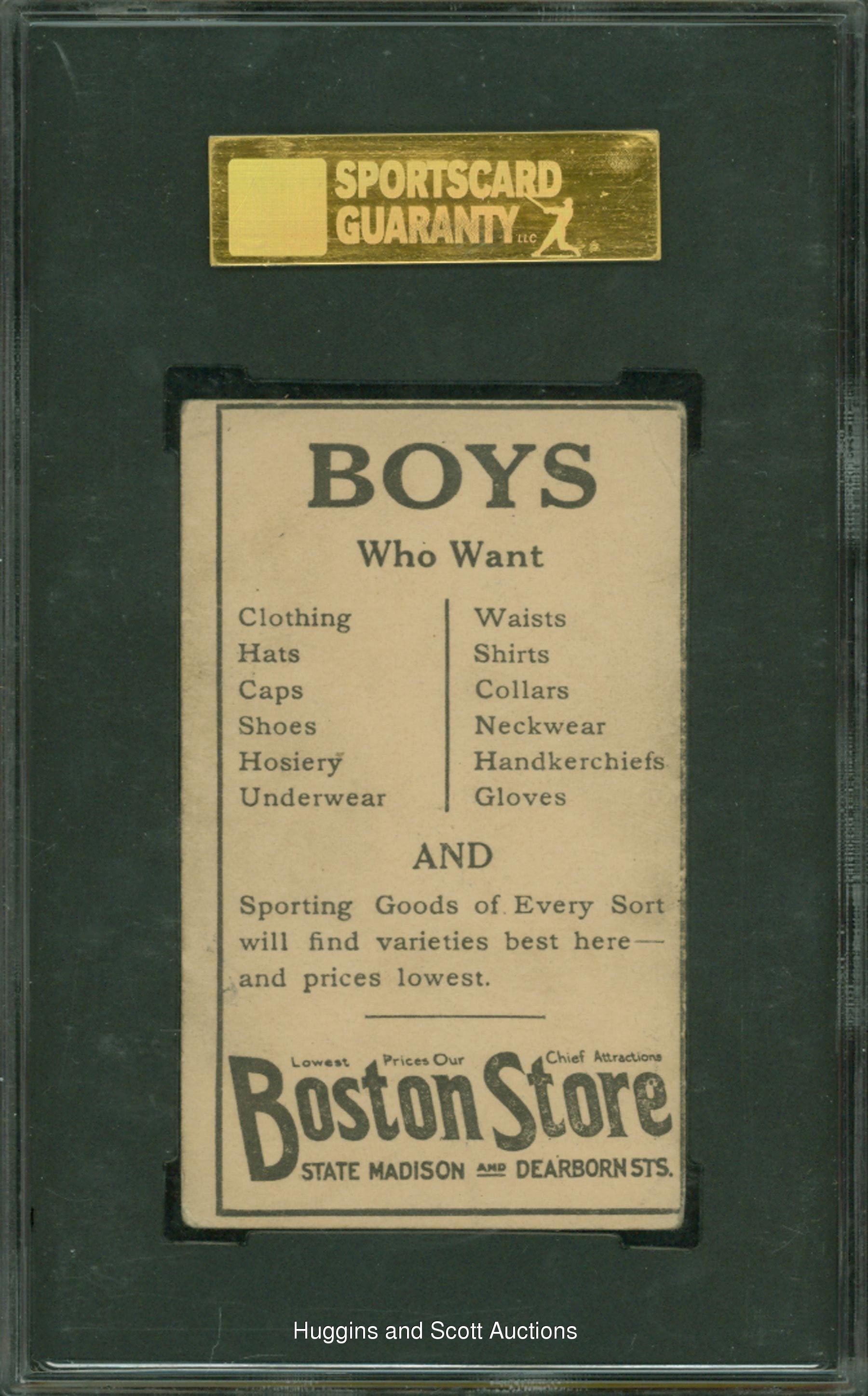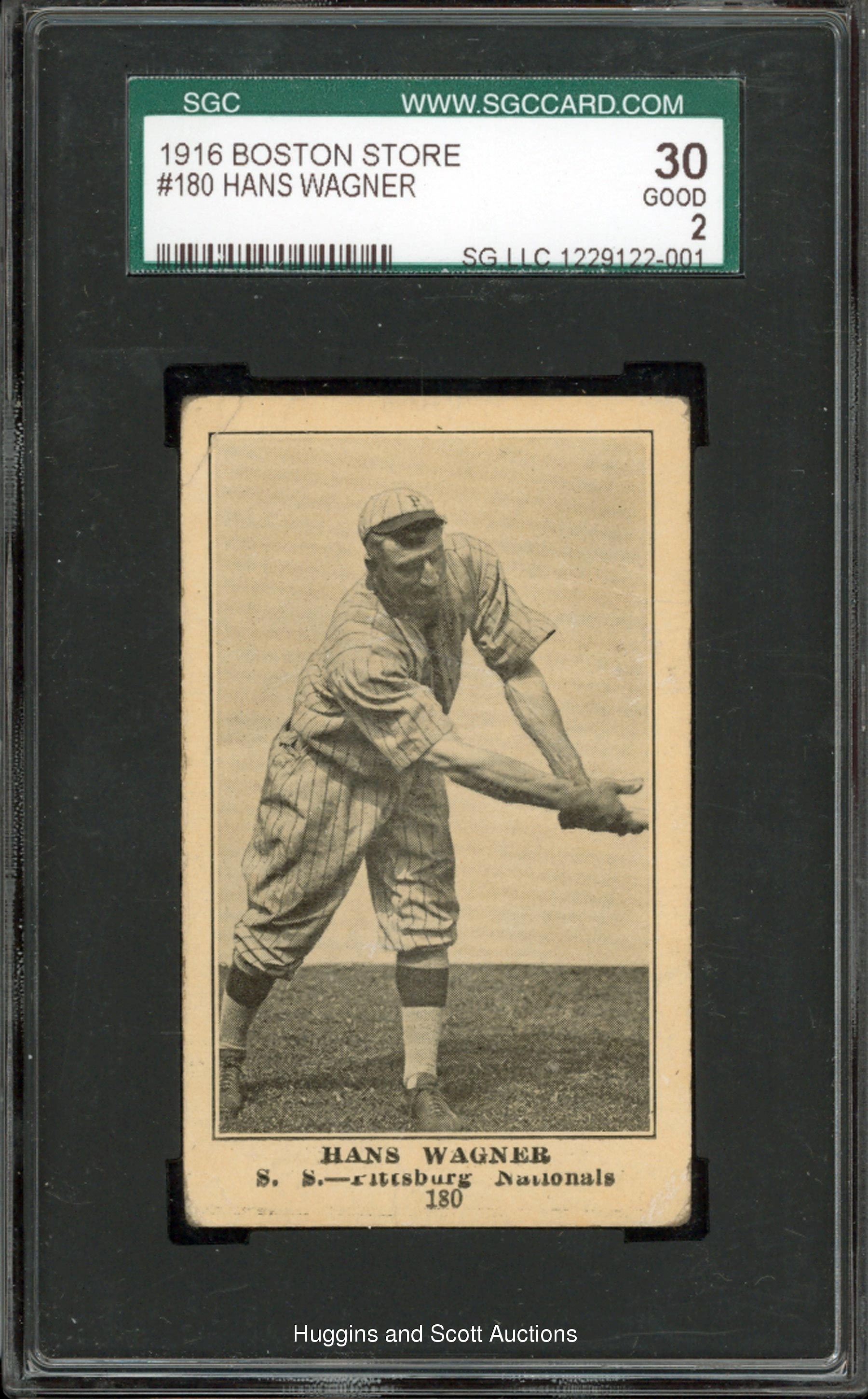 One of the more difficult Honus Wagner cards is found with the offered 1917 Boston Store #180 example. Graded 30 Good 2 by SGC (year mislabeled by SGC), this “Flying Dutchman” is one of only three such judged by the grading service. Although there exists peripheral creasing and an off-centered advertising reverse, this Hall of Famer remains a solid choice for the type collector.