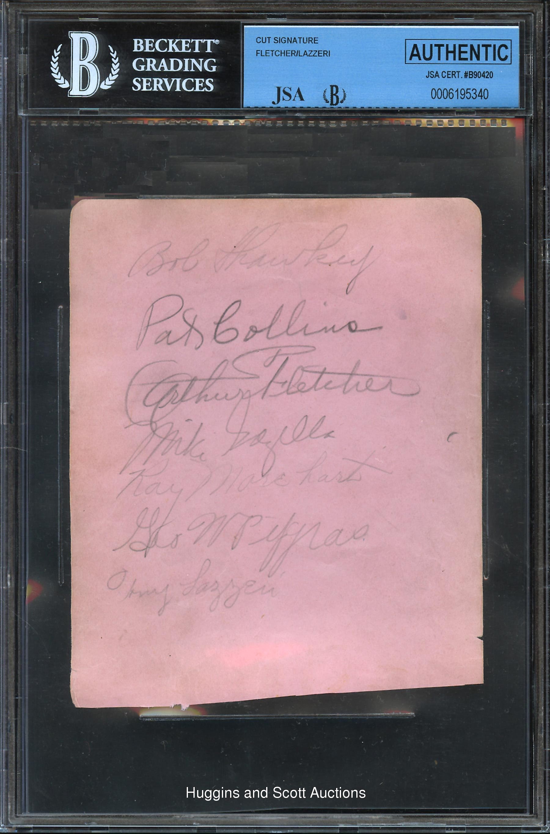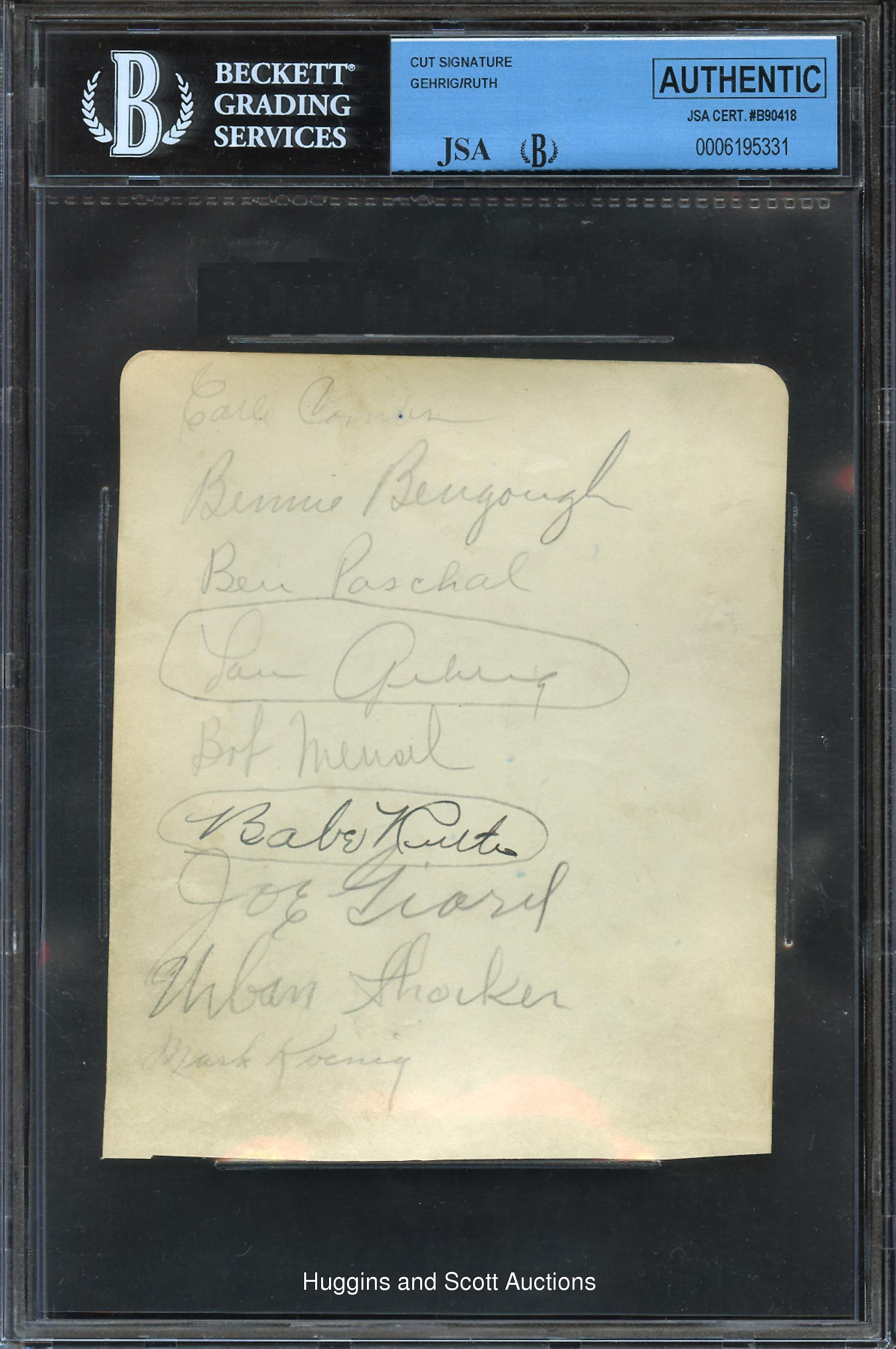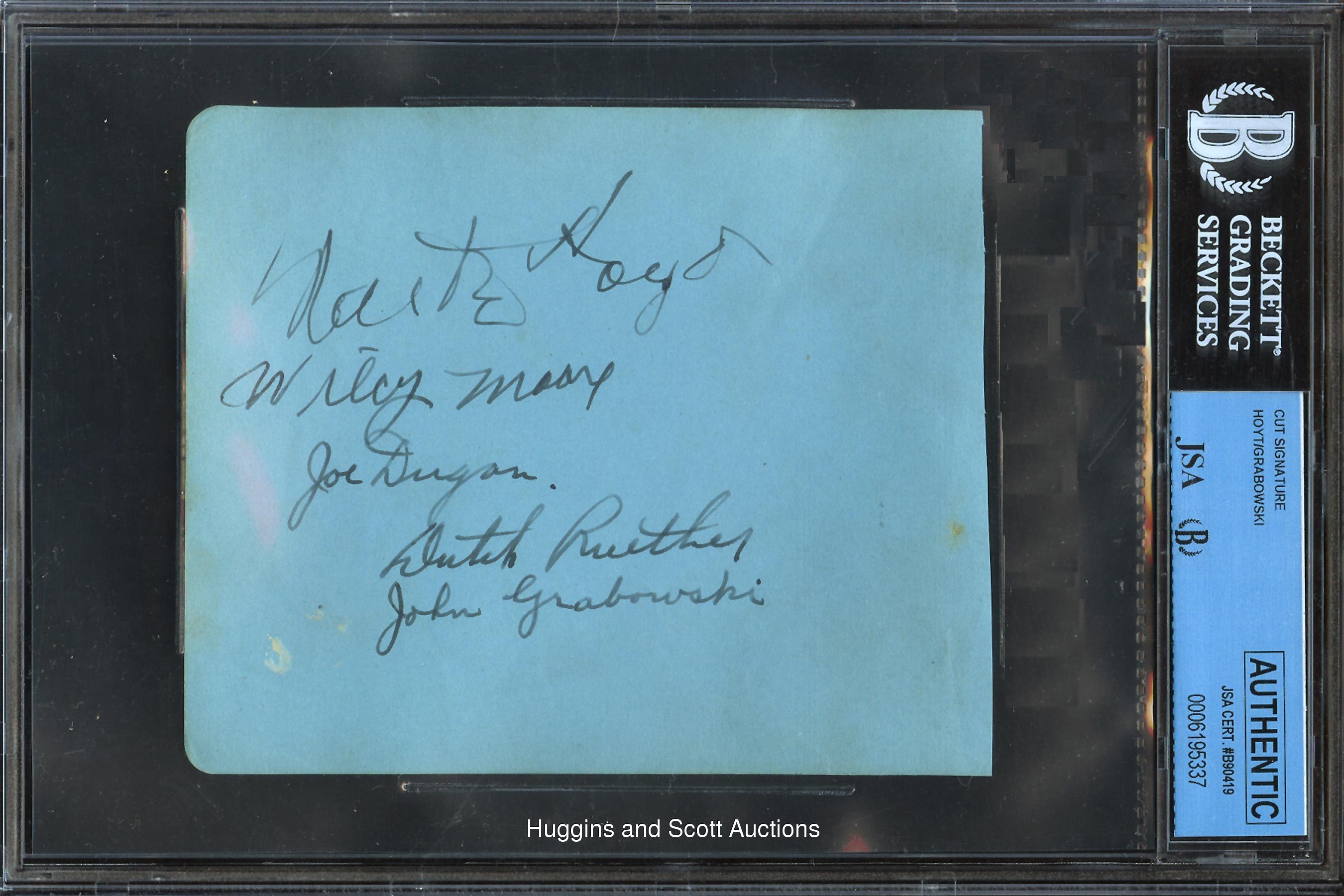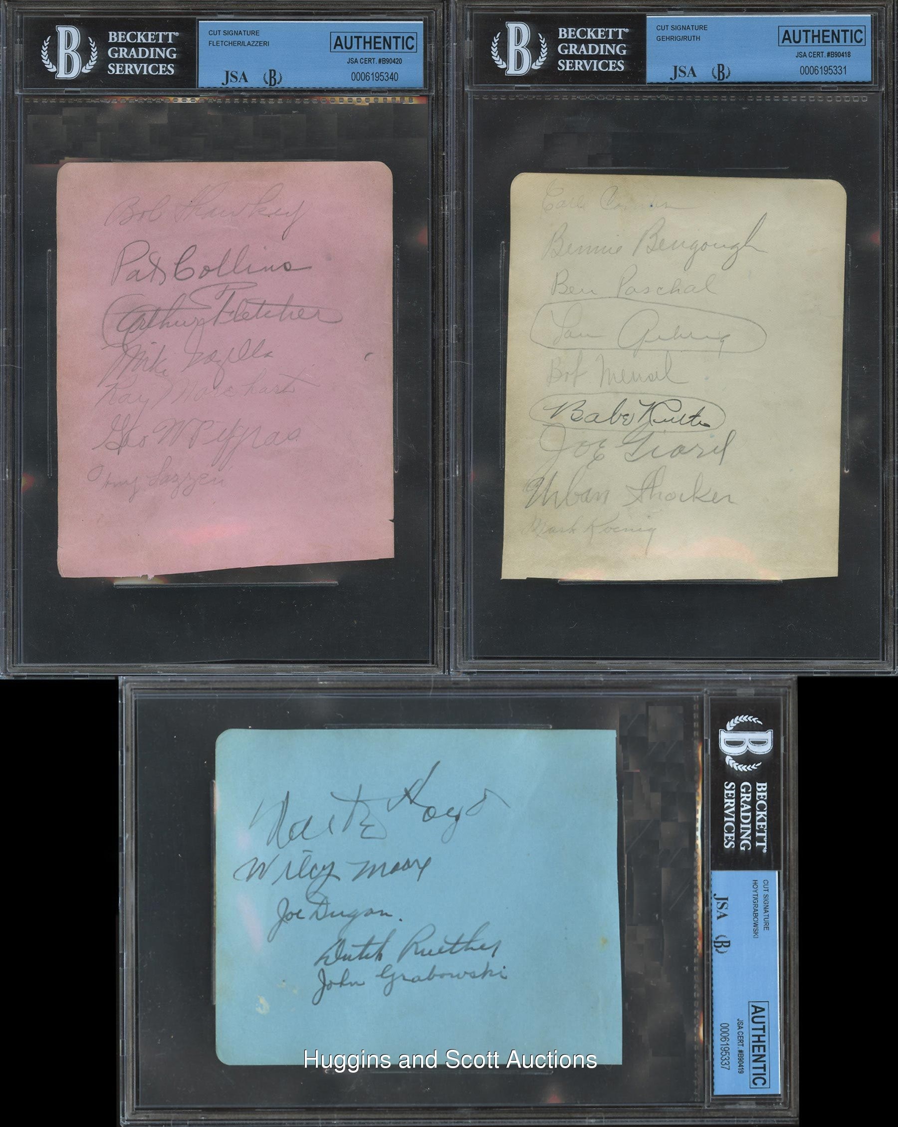 Baseball historians will always debate and differ on which is the grand old game’s greatest team, but one thing is for certain - the 1927 New York Yankees are always in the discussion. Loaded with Hall of Famers and stars, the 1927 Bronx Bombers boasted five starters that hit better than .308 and three 18-Game winners; Ruth and Gehrig combined for 107 homeruns, and there were seven members of Cooperstown. This line-up is featured in the offered three autographed album pages. Each of the (3) album pages has been authenticated by BGS/JSA and contain only the signatures of the 1927 NY Yankees with (21) in total. The three sheets are as follows: White Sheet: (9) signatures in pencil with the exception of Ruth (signed in steel-tip fountain ink) with Combs, Bengough, Paschal, Lou Gehrig (“8-9”), Meusel, Babe Ruth (“9”), Joe Giard (c.1956, “8-9”), Urban Shocker (d.1928, “8”), Koenig; Pink Sheet: (7) signatures in pencil with Shawkey, Collins, Fletcher, Gazella, Morehart, Pipgras and Lazzeri (“6-7”); Blue Sheet: (5) signatures in black fountain pen with Hoyt, Moore, Dugan, Ruether and Grabowski (d.1946, “9”). With (21) total signatures, (20) of which were players and one coach (Fletcher), the offered collection is one of the most extensive groupings offered and includes two of the TOUGHEST signatures from the 1927 New York Yankees in Giard and Shocker plus the monumental scripts of Babe Ruth and Lou Gehrig. Also included with the lot of three Beckett slabbed album pages is a copy of the original JSA auction house letter.