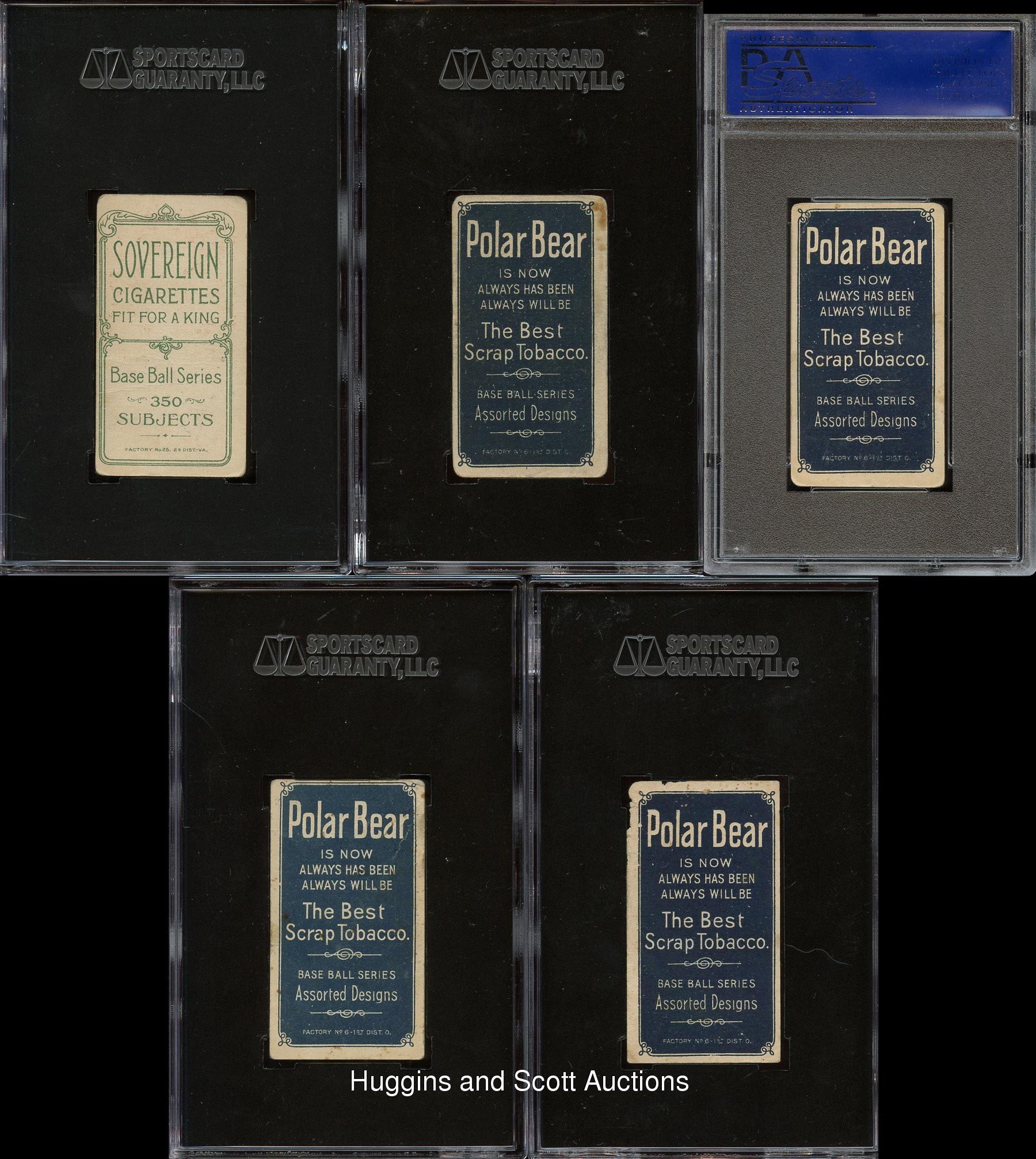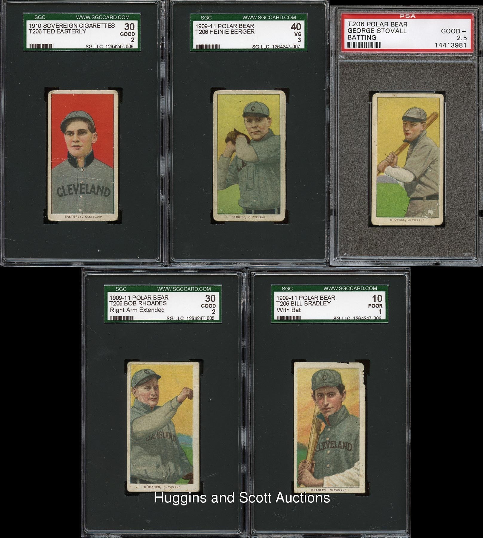 Assembled is a grouping of five 1909-1911 T206 graded cards, all of which are “low pop” front/back combinations. Included are PSA: (1 card) with Good + 2.5: Stovall (Polar Bear, Batting, population 1); SGC: (4 cards) with SGC 40: Berger (Polar Bear, population 2); SGC 30: Easterly (Sovereign 350, population 4), Rhoades (Polar Bear, Right Arm Extended, population 1) and SGC 10: Bradley (Polar Bear, with Bat, population 3).