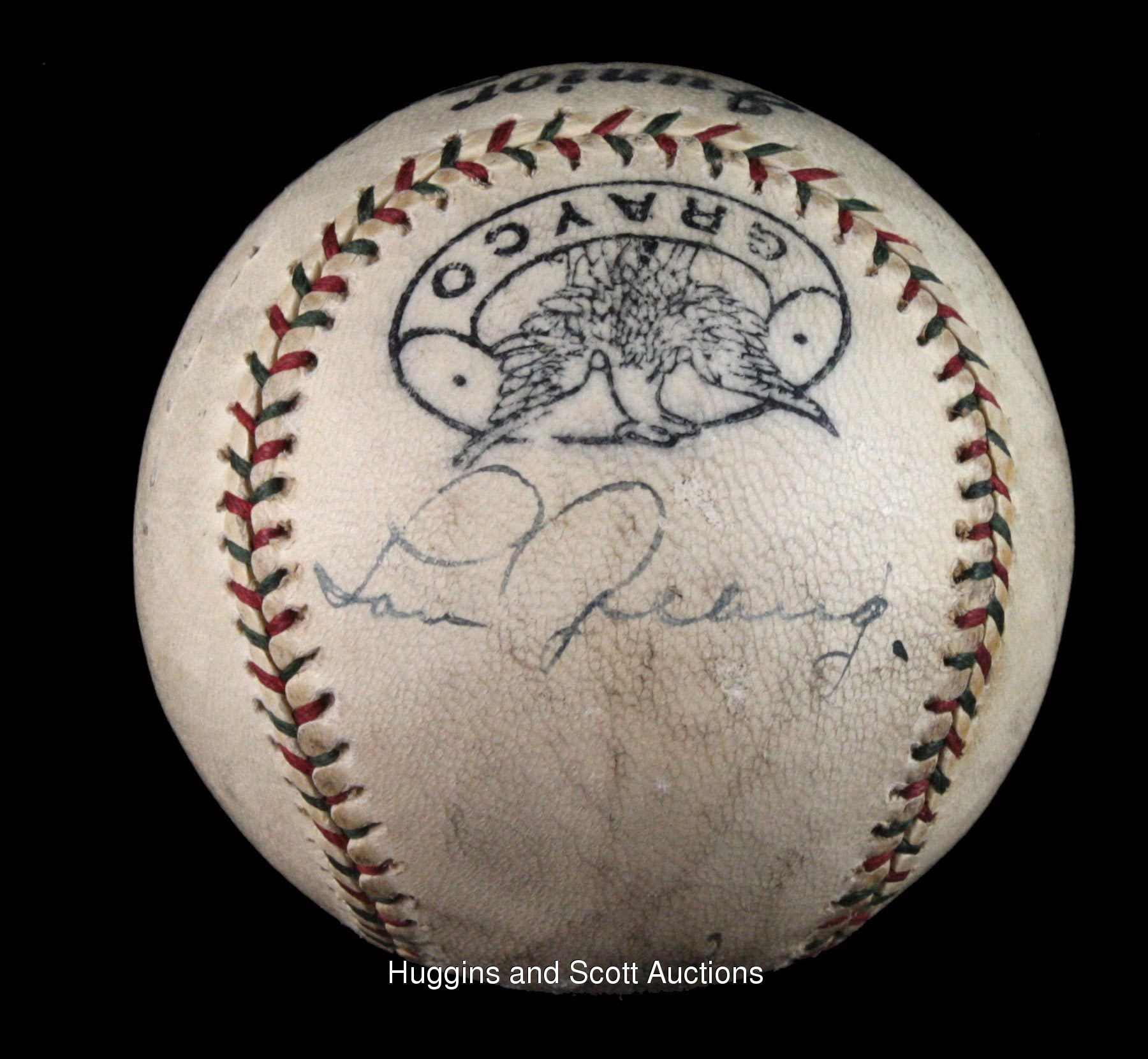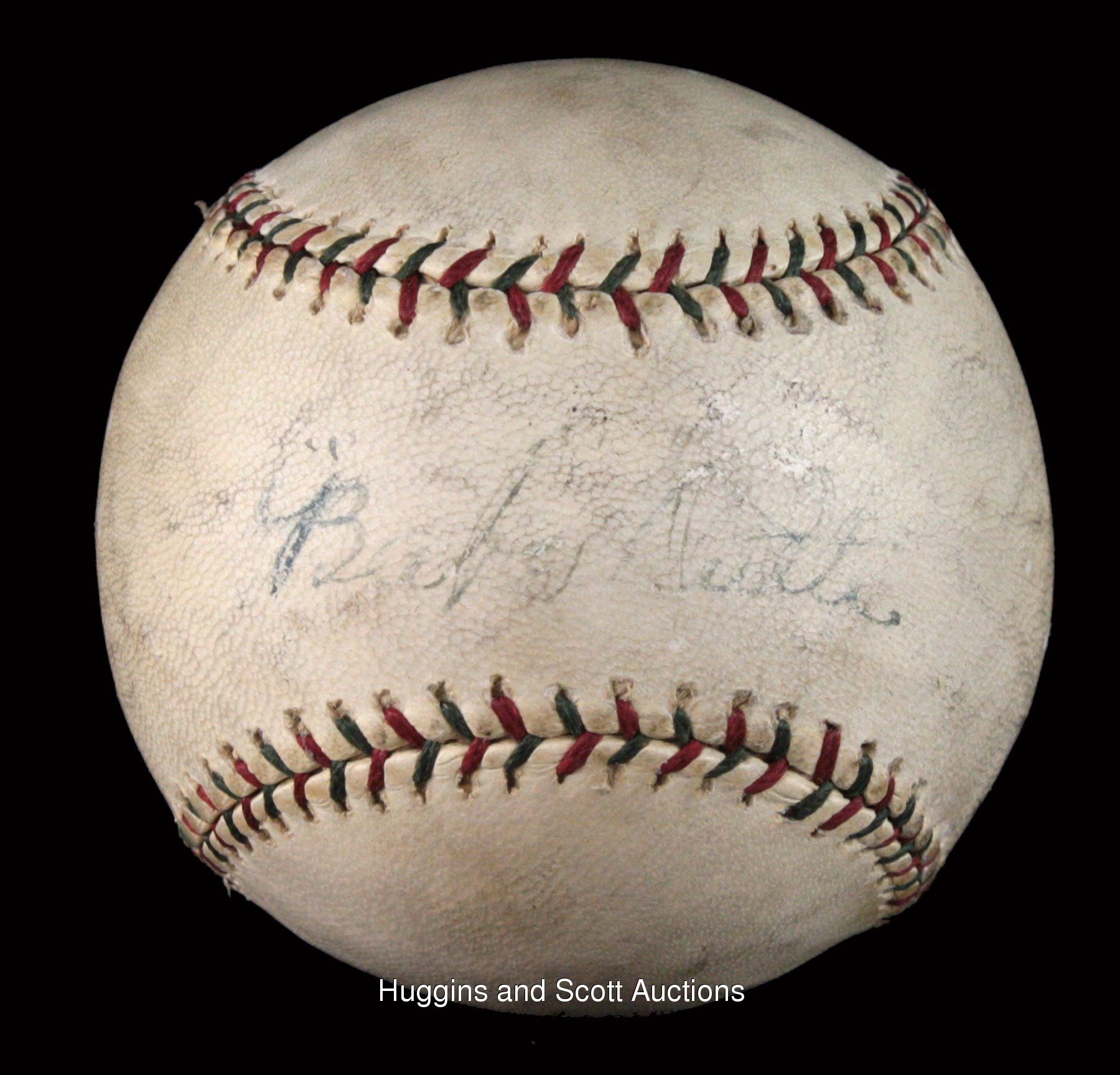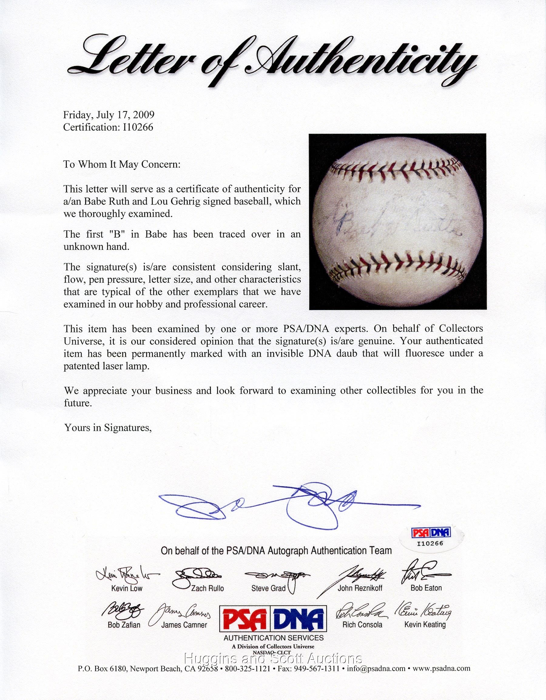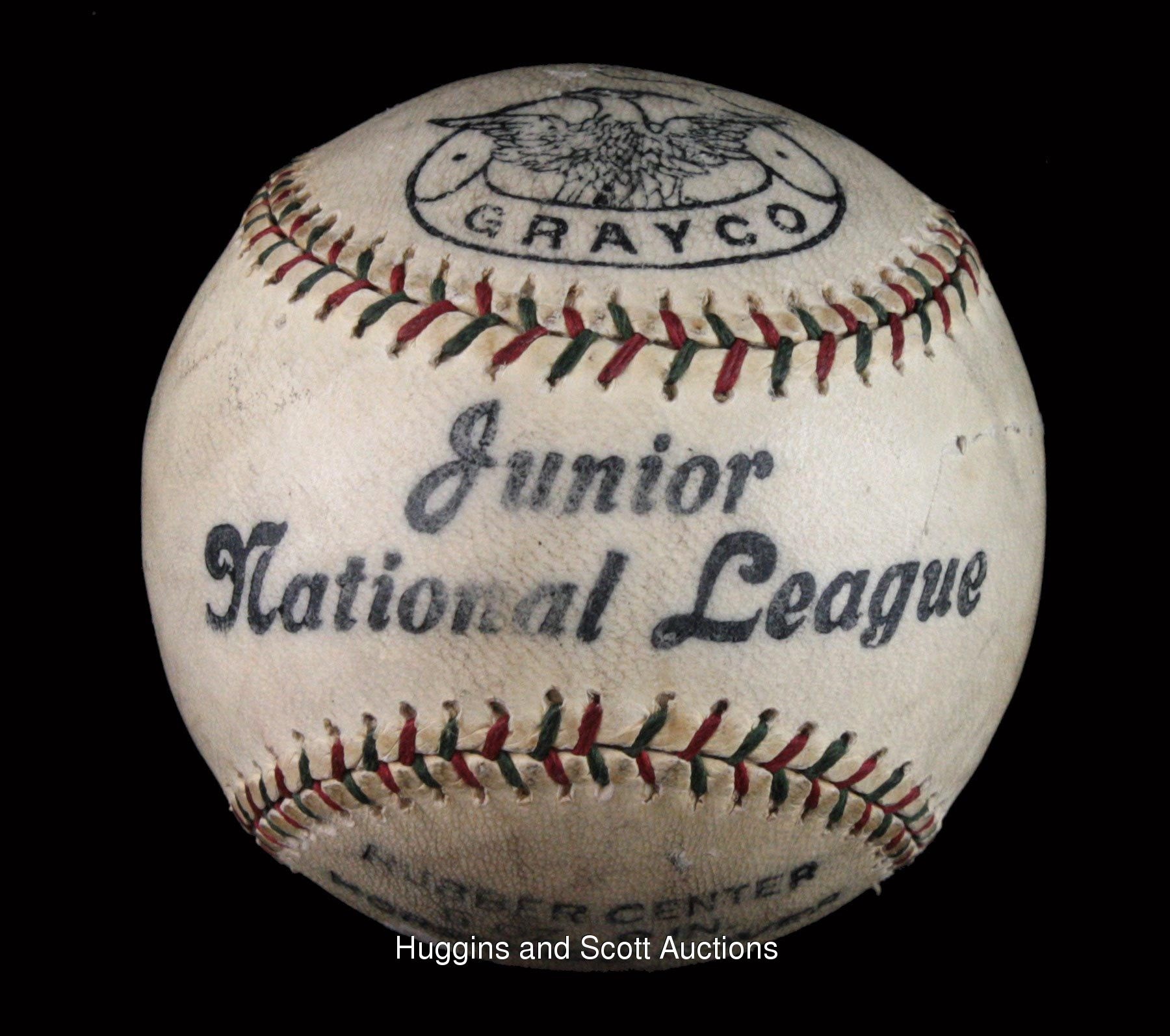 Throughout history, tandems in countless arenas have wrested our attention, providing entertainment and thrills to keep us coming back for more. In the sporting world, it's doubtful that any pairing is revered more than Ruth and Gehrig. The offered baseball is autographed by that heroic duo. The medium is an unofficial "Grayco - Junior National League" example with evidence of handling (grade "5-6"). In it's customary occupancy of the sweet spot, the signature of Babe Ruth is accented by quotation marks at both ends of "Babe," thus dating it to sometime before 1928. The "B" has been enhanced in an unknown hand and lesser strength at the beginning of the surname warrant's an overall assessment of ("3"). On the east panel, the curvaceous penning of Lou Gehrig resonates ("5-6") strength and clarity. Full photo LOA from PSA/DNA.