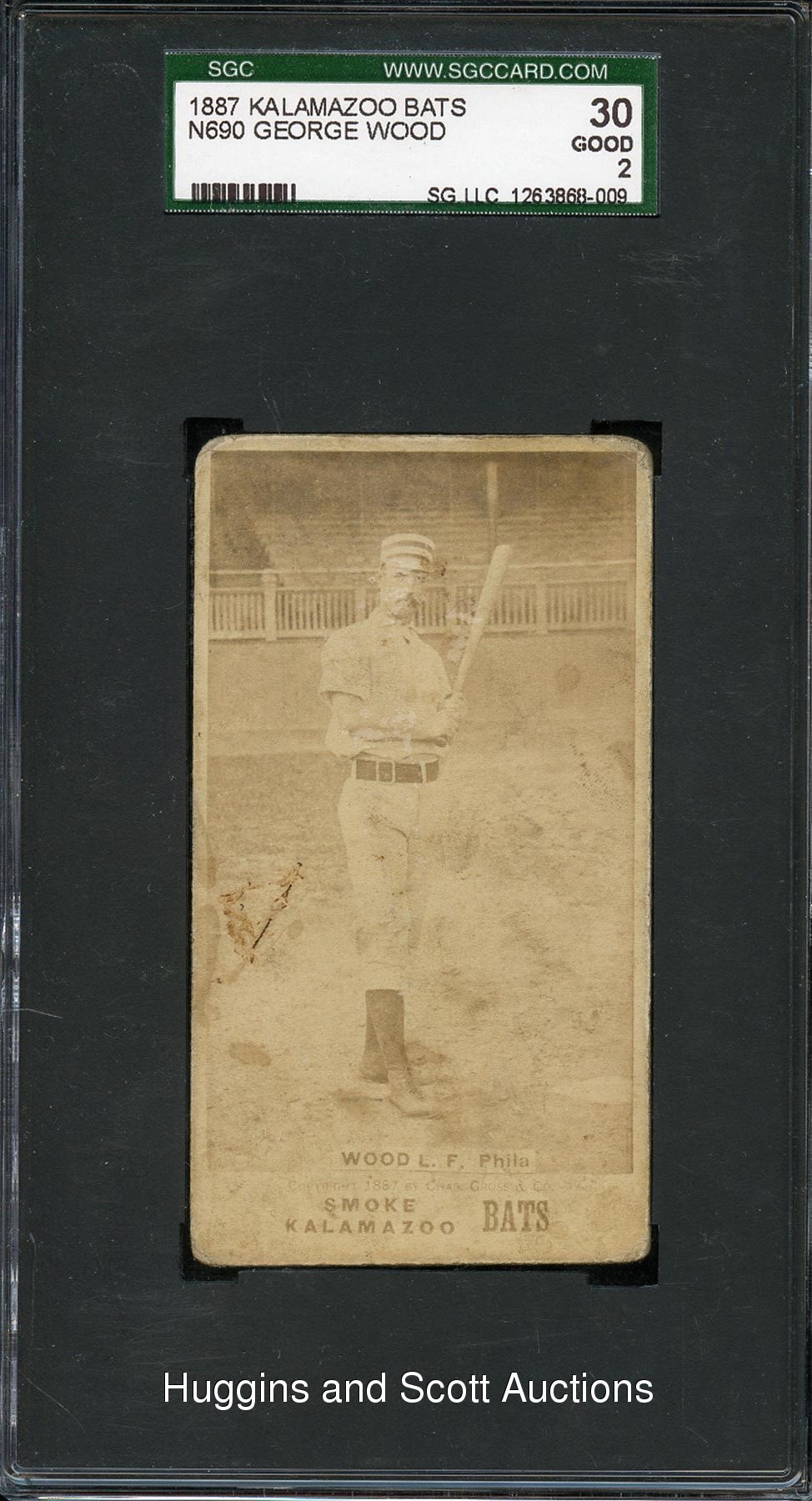 Featured is an impressive 1887 N690 Kalamazoo Bats George “Dandy” Wood. Graded 30 Good 2 by SGC, only eight similar examples have been judged by the grading service. The scarce representation of this Philadelphia outfielder displays a combination of wear, which accounts for its technical assessment. With bat in tow, the nineteenth-century batsman is ready to join any discerning pre-war gathering.