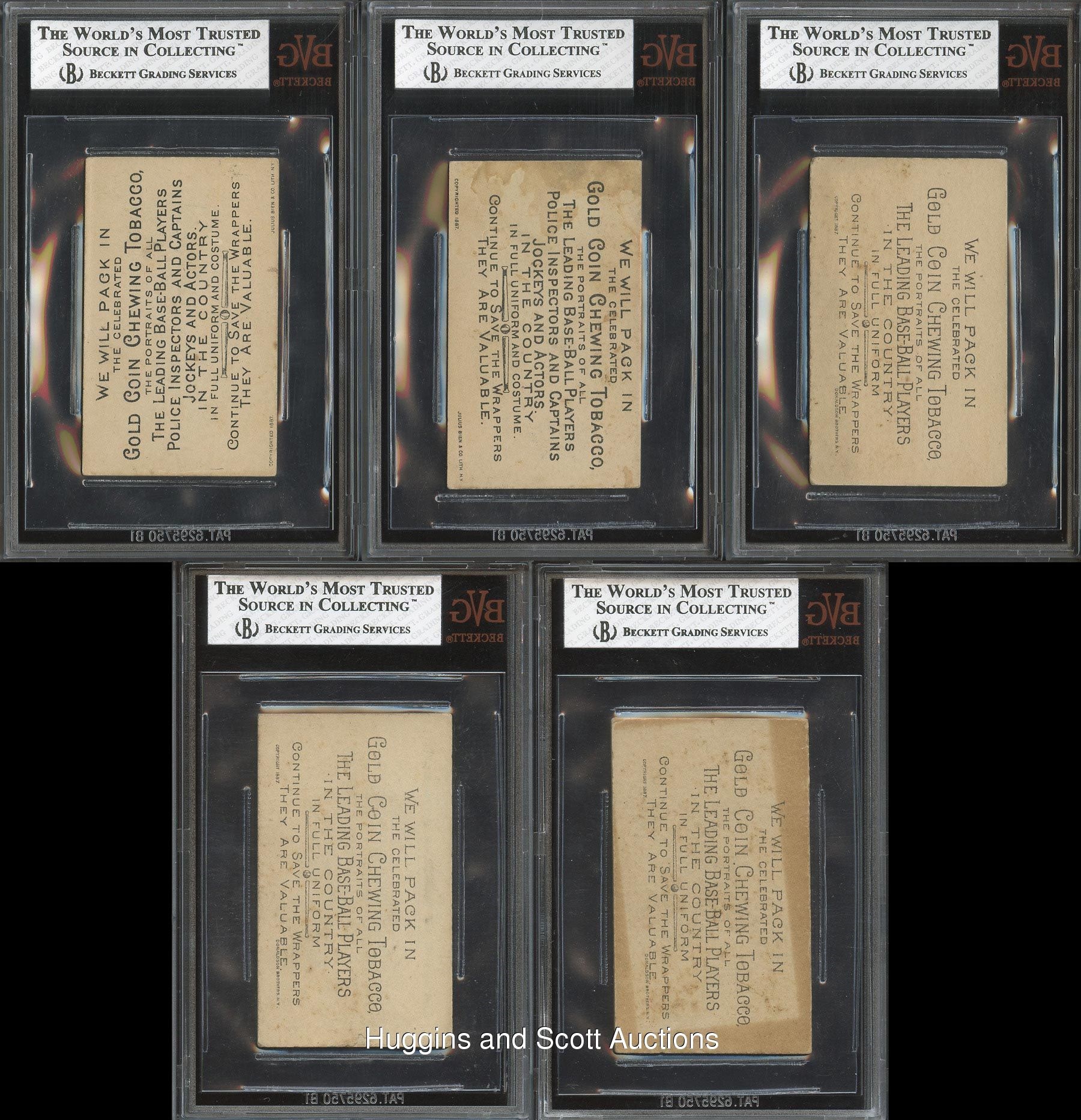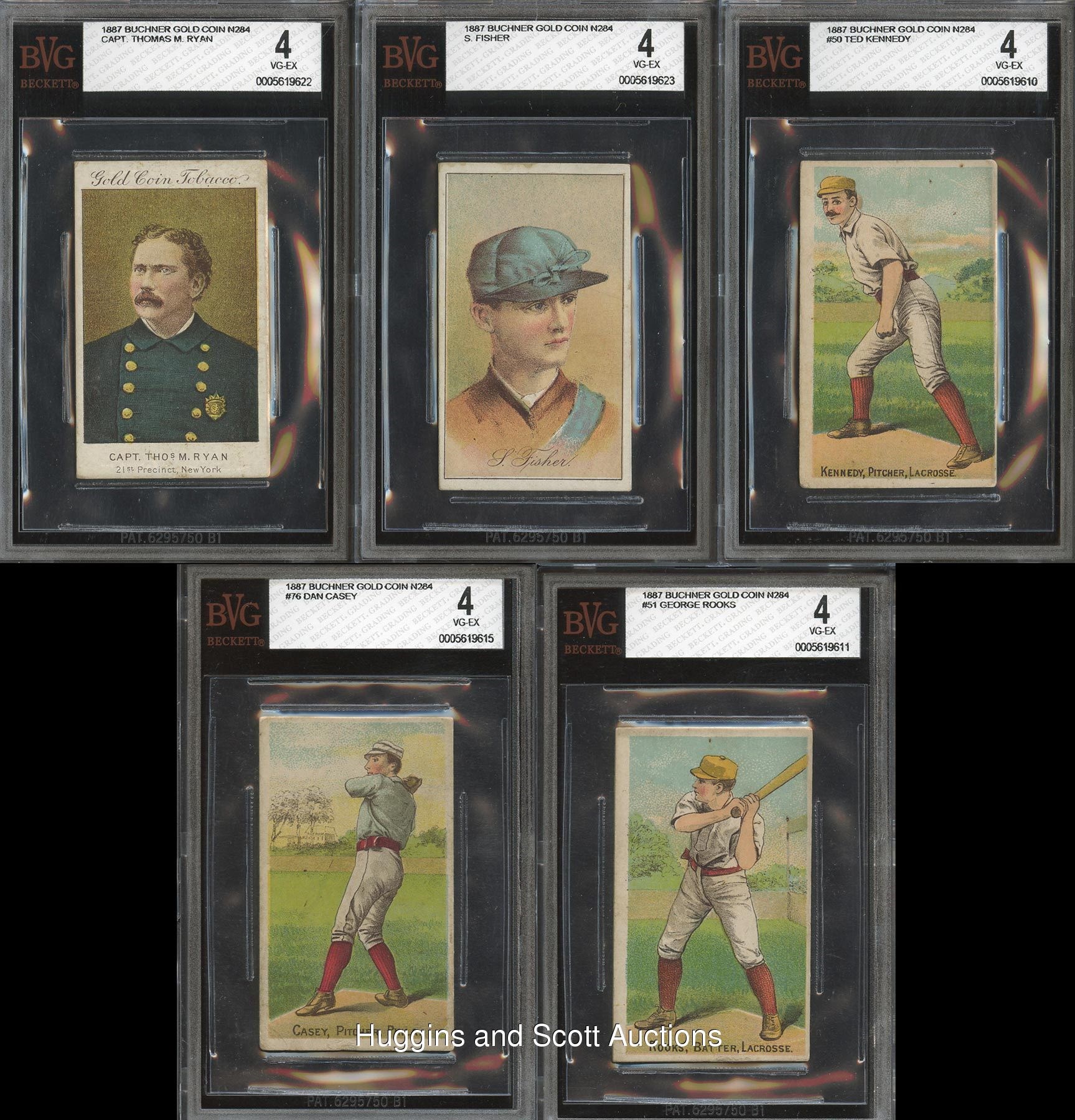 Each graded 4 VG-EX by BVG. Presented is a sampling of five 1887 N284 Buchner Gold Coin singles. Included are #50 Kennedy, #51 Rooks, #76 Casey, NNO Fisher (jockey) and NNO Ryan (police). These conservatively graded tobacco cards will add depth to the collection of the nineteenth century enthusiast.