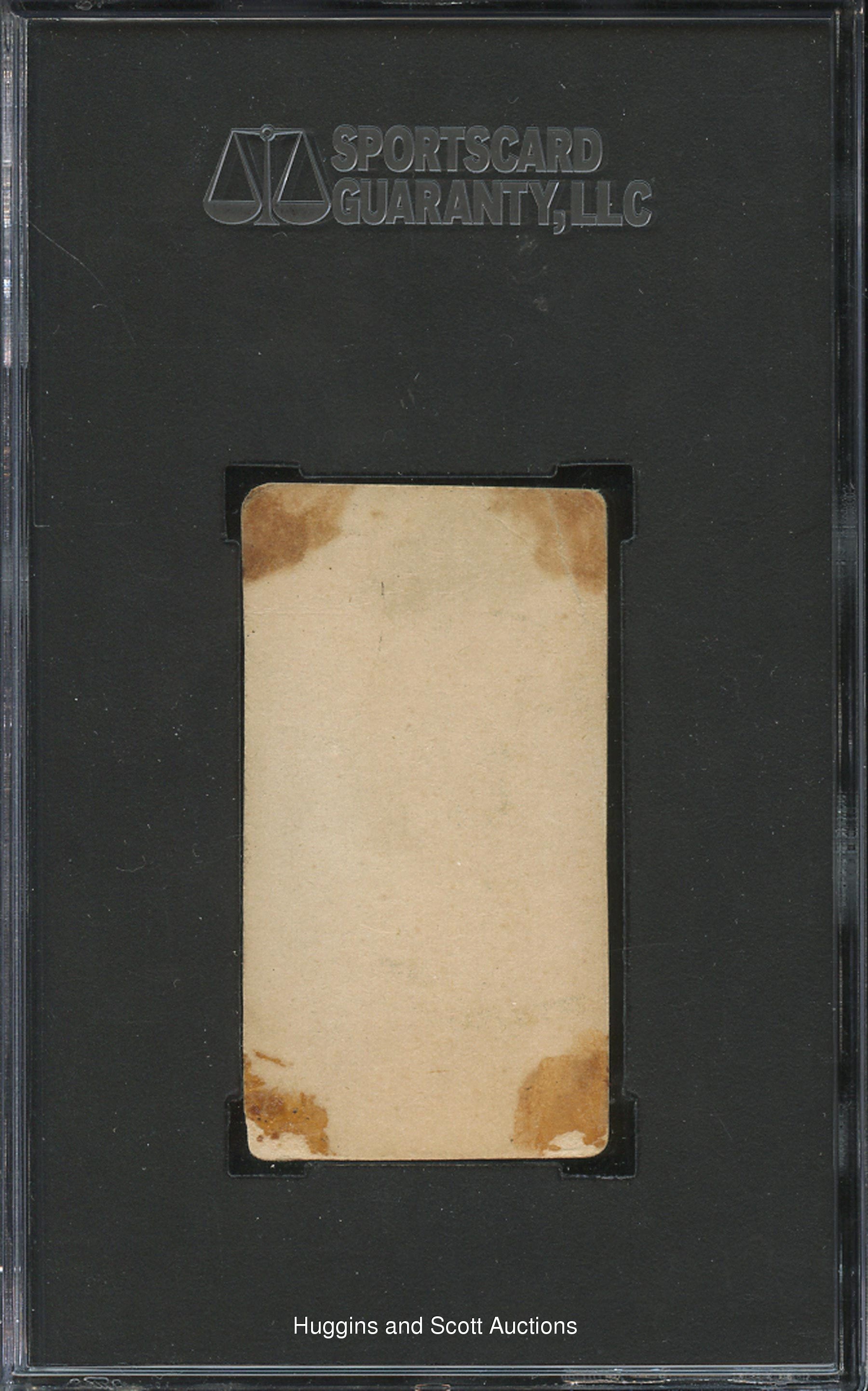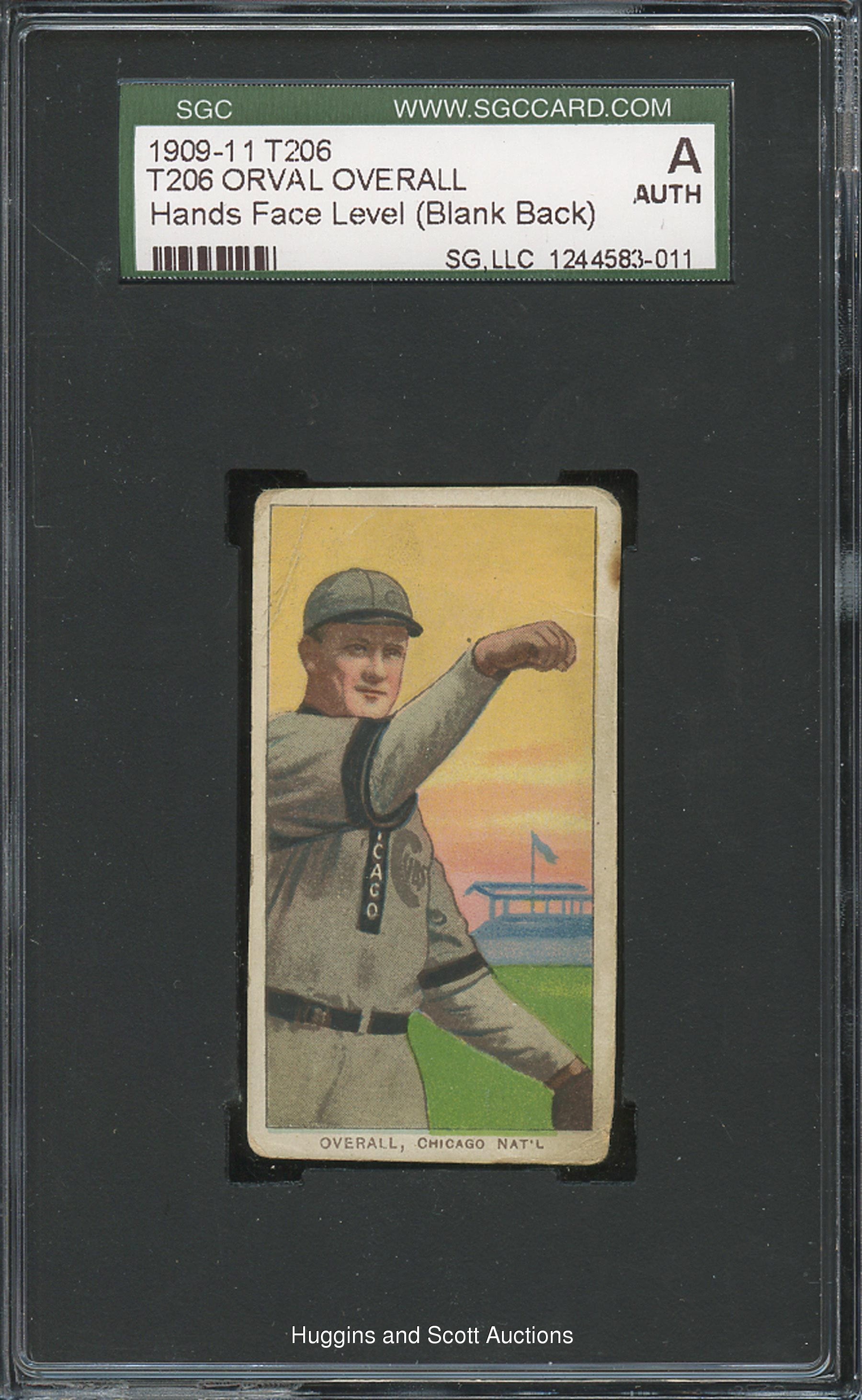 The 1909-11 T206 “printing freak” specialist will appreciate this Oral Overall (Hands Face Level) blank-backed specimen, graded Authentic by SGC. This slightly trimmed example displays moderate creasing throughout along with glue residue on each corner. Despite those technical flaws, this seldom-seen card is ideal for the type collector.