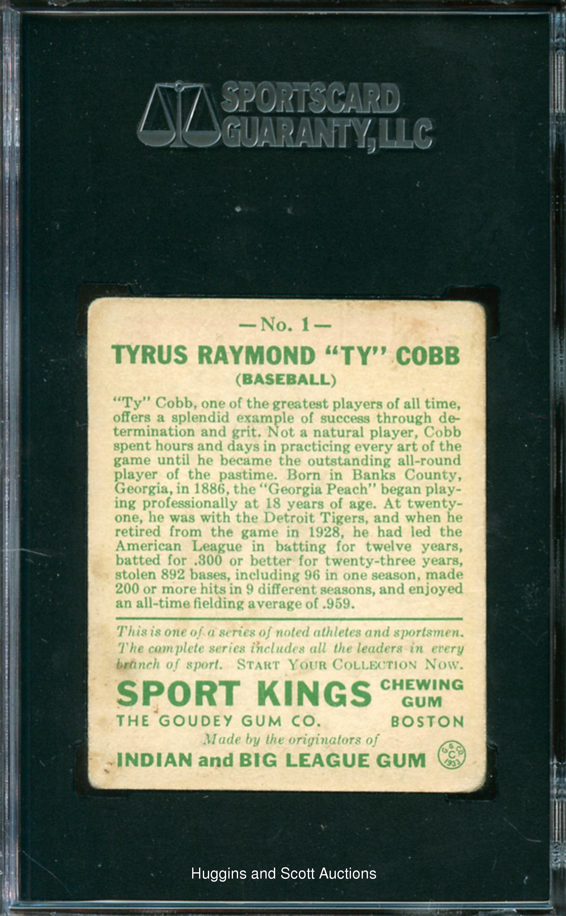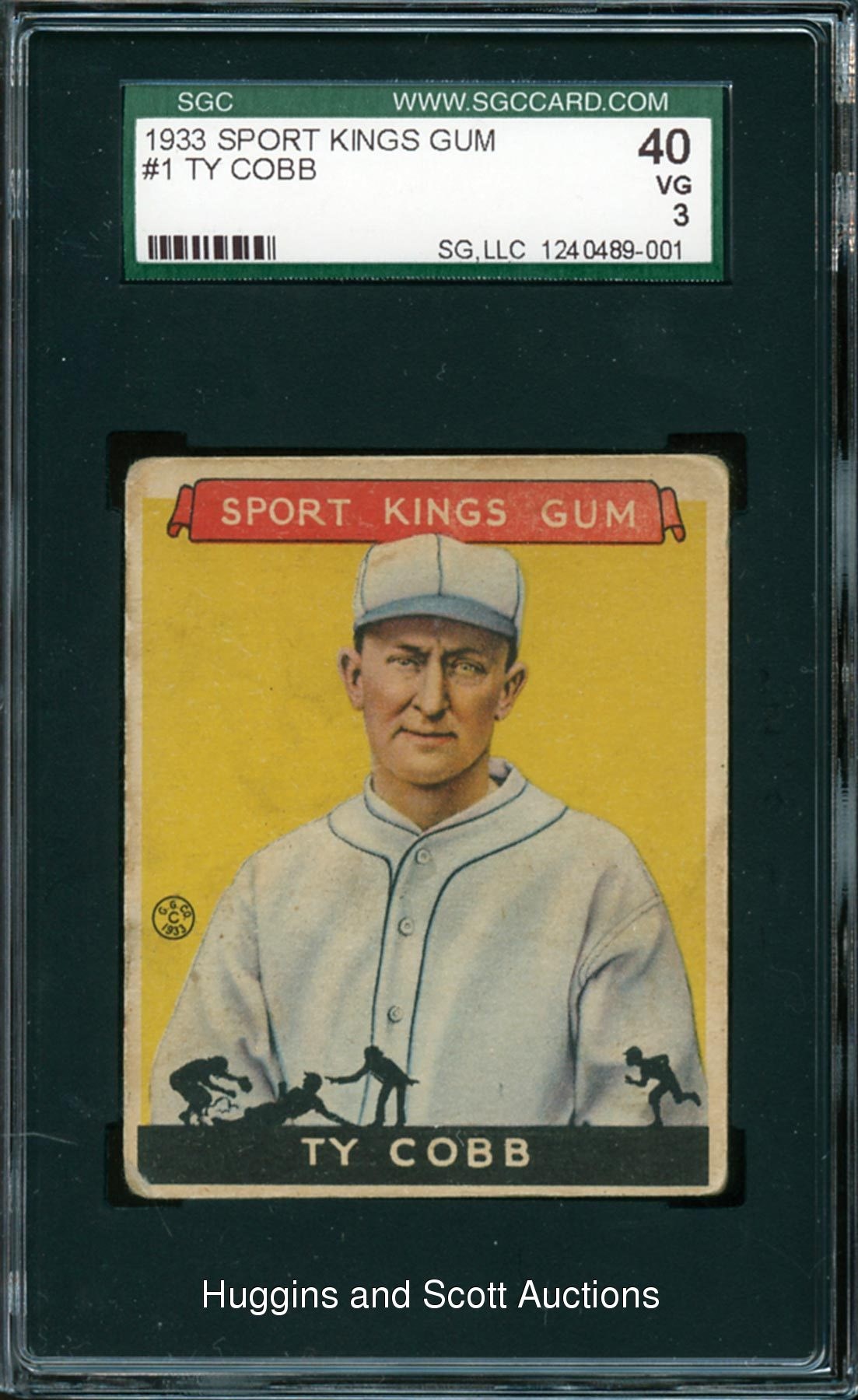 Graded 40 VG 3 by SGC. Lead off your 1933 Sport Kings Gum set with this stellar #1 Ty Cobb example. The obverse is crease-free with moderate, but even corner wear along with mild surface soling. The reverse is free of paper loss but concedes typical paper foxing and an upper edge crease that does not penetrate the surface.