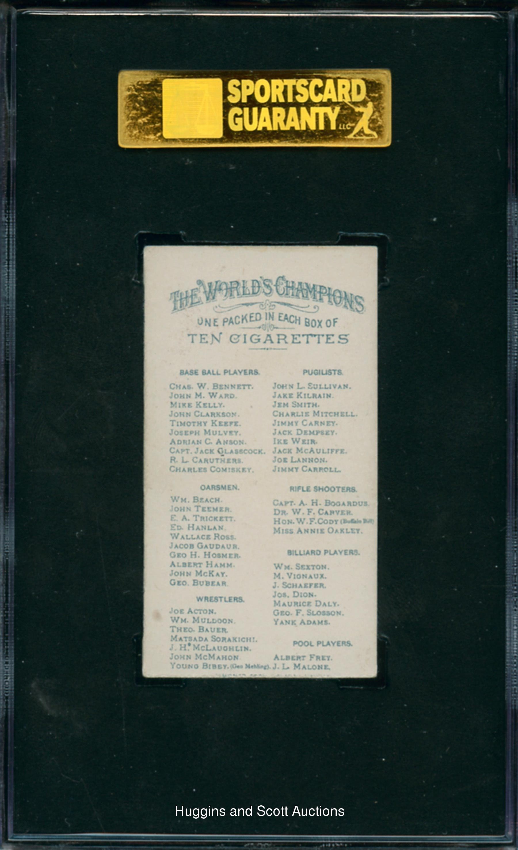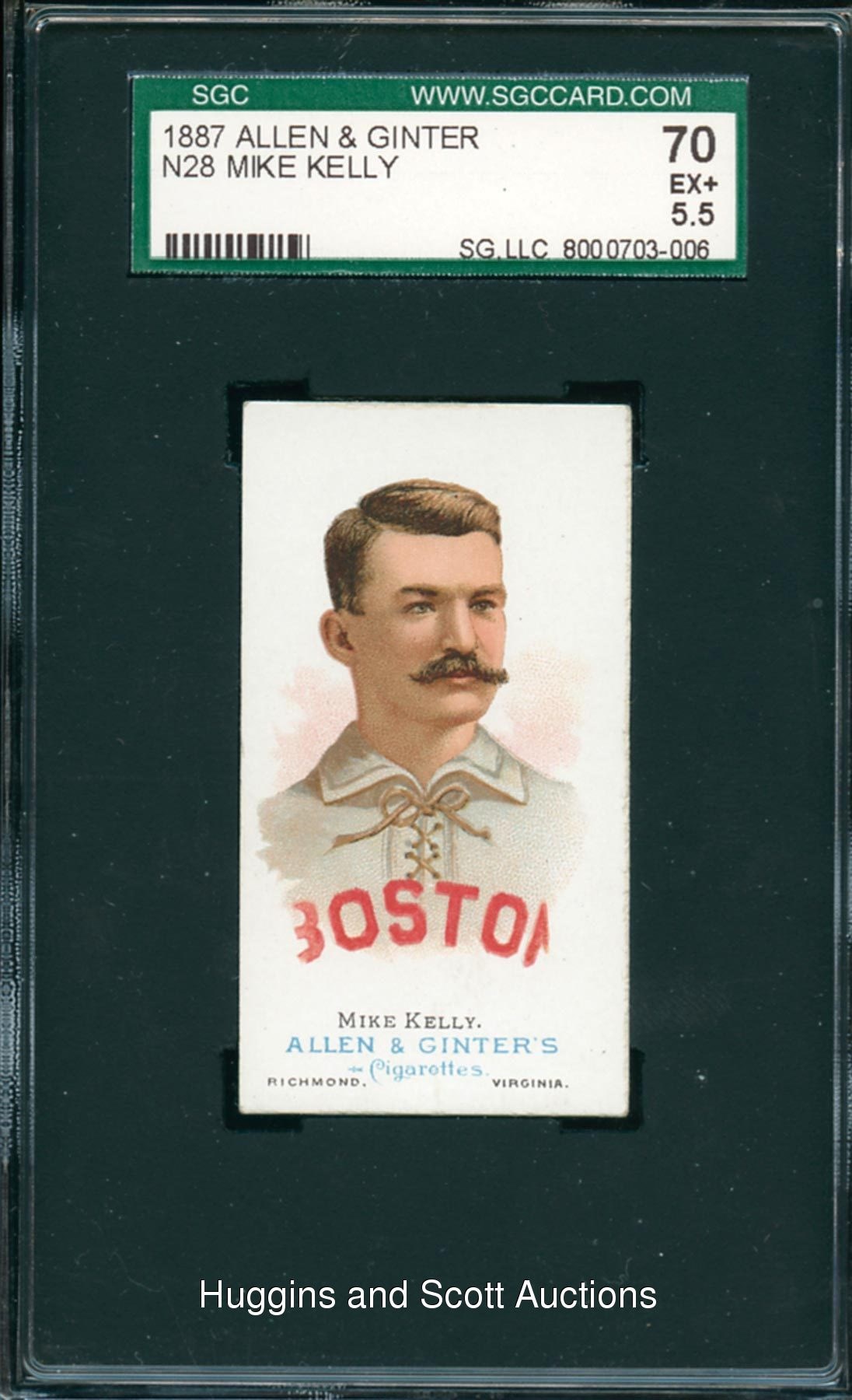 Graded 70 EX+ 5.5 by SGC. The dominating Mike “King” Kelly is the subject of this upper tier 1887 N28 Allen & Ginter tobacco card. The mustachioed Bostonian presents much better than the technical grade suggests. Well-constructed corners and edges along with a bright surface registration are eye-catching attributes of this 123-year-old cardboard. The back is clean, and the obverse crease-free. Inconsequential flaking along the right edge and superficial wear on the upper edge accounts for the seemingly harsh evaluation. Presides in the eightieth percentile of all similar Kelly cards to have been judged.
