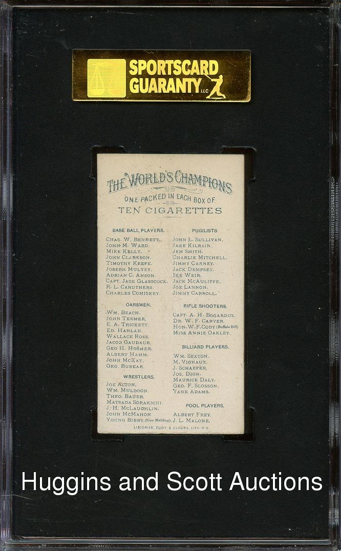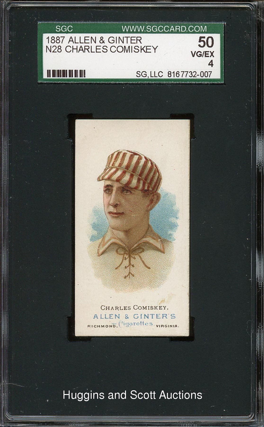 Graded 50 VG-EX 4 by SGC. Charles The Old Roman Comiskey is the subject of the offered 1887 N28 Allen & Ginter example. This keynote Hall of Famer displays light surface flaking along with strong peripheral bordering and a clean checklist reverse.