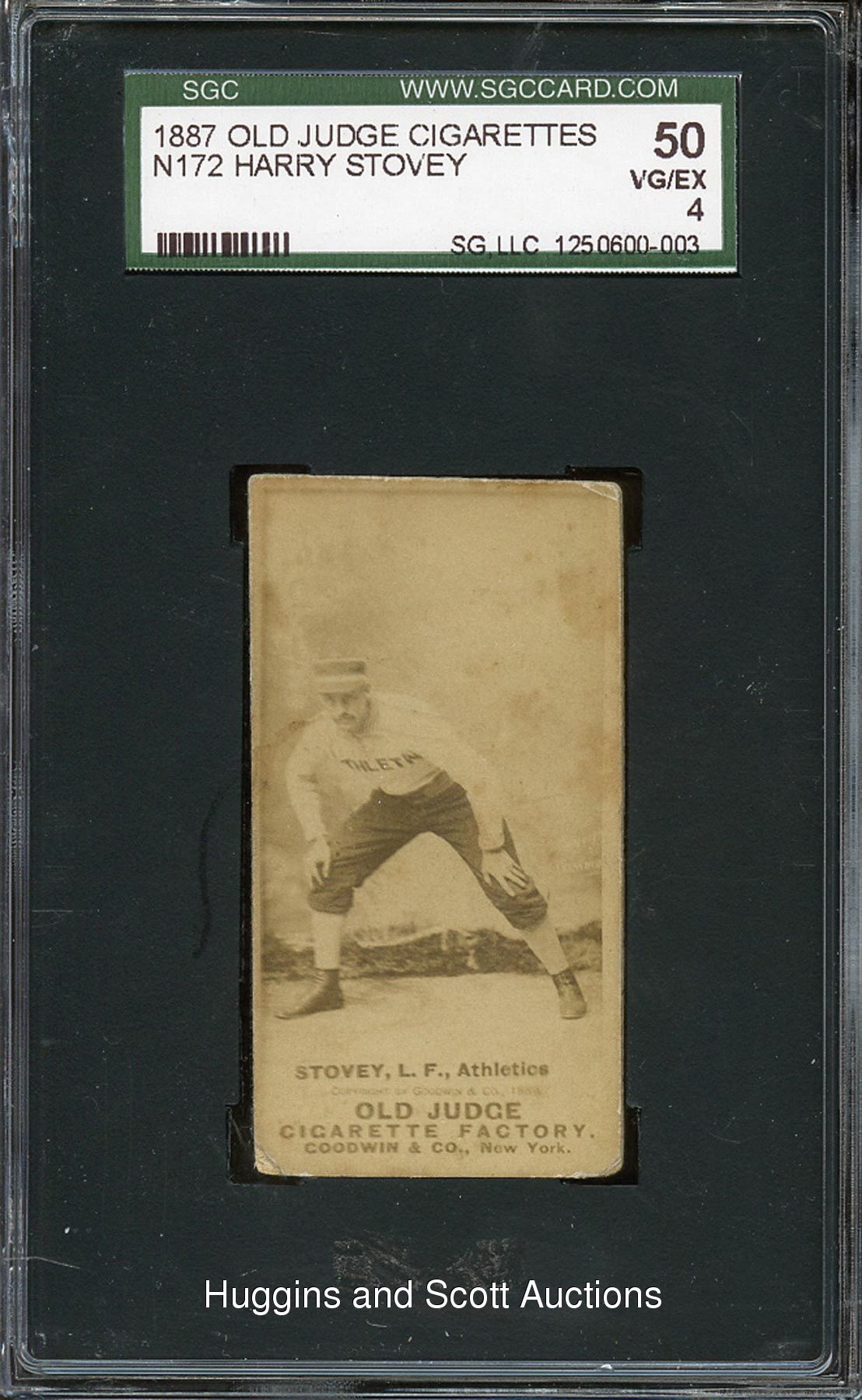 Graded 50 VG-EX 4 by SGC. Whether debuting for the Worcester Ruby Legs or culminating his career with the Brooklyn Grooms, Harry Stovey was a nineteenth century slugger who excelled wherever he played. The offered 1887 N172 Old Judge specimen depicts the Athletics outfielder at the height of his career. This crease-free specimen displays moderate peripheral wear consistent with its assigned technical grade.