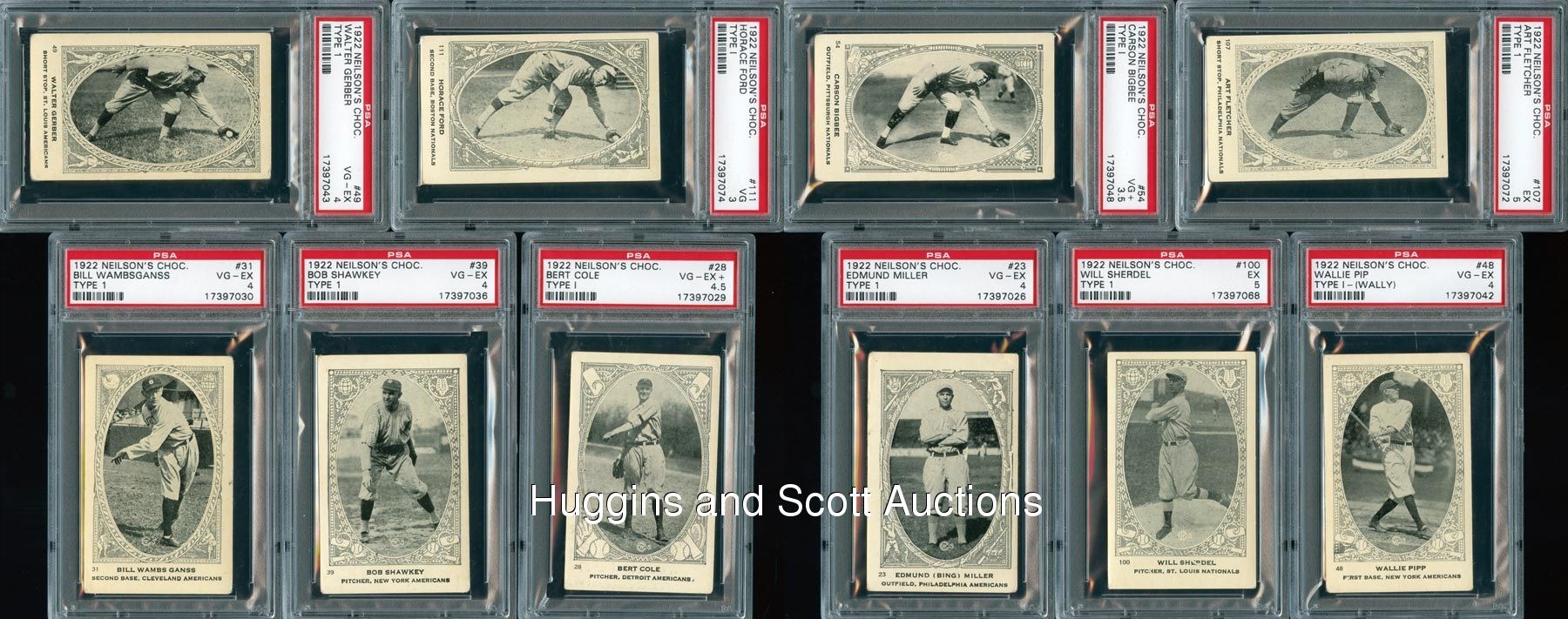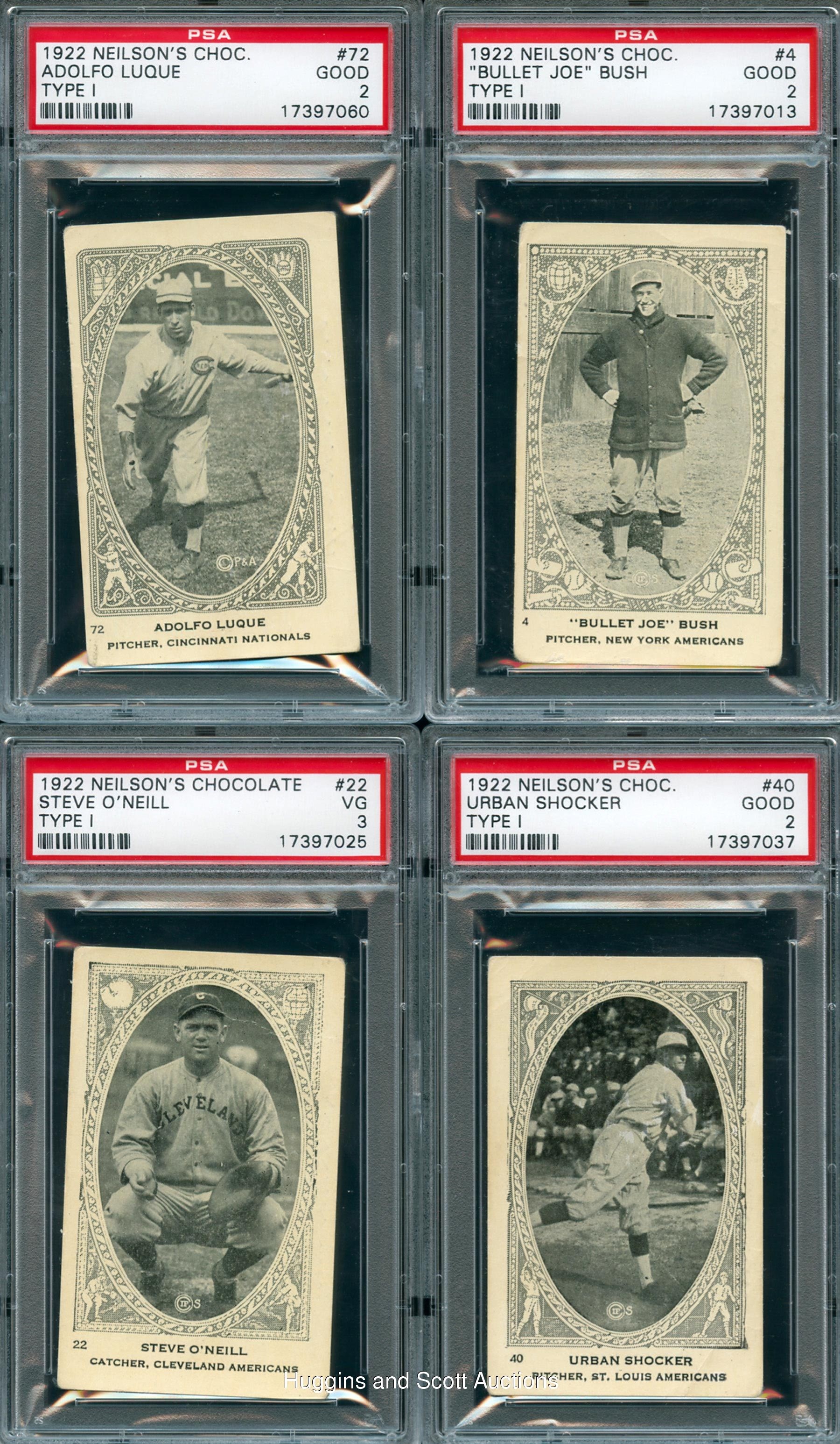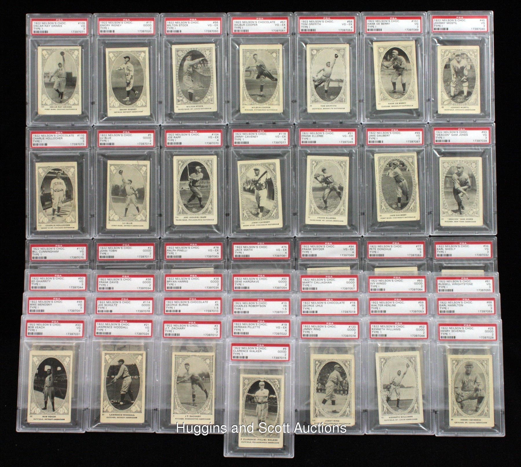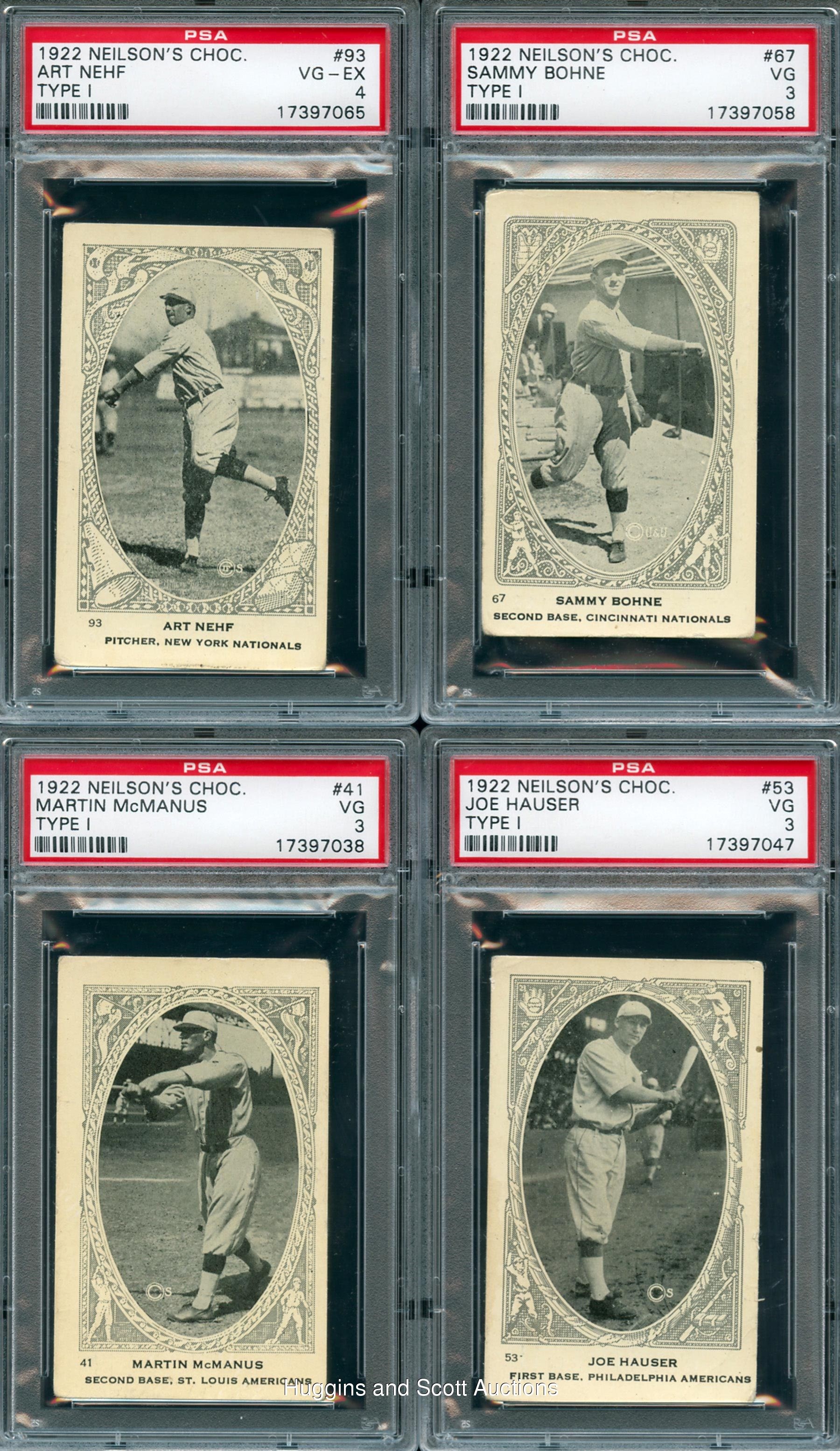 Constituting nearly 25% of all those graded by PSA, this 1922 V61-1 Neilson’s Chocolate partial set of (69/120) is a sight to behold. Issued in packages of “Big League Bars” in Canada, when found, these difficult samples typically display reverse damage, however, none of these contain any back damage. Additionally, the population report confirms single digit submissions for each card, many of which are the highest or only graded. Included are PSA 5: (2 cards, both only graded) with #100 Sherdel, #107 Fletcher; PSA 4.5: #28 Cole; PSA 4: (21 cards, all highest or only graded, unless noted) with #15 Falk, #19 Pillette, #20 Schang, #23 Miller, #24 S. Johnson (one better), #31 Wambsganss, #35 P. Collins, #39 Shawkey, #48 Pipp, #49 Gerber, #51 Ellerbe, #56 Stock, #57 Cooper, #58 Griffith, #65 Doak, #75 J. Smith (one better), #78 Pinelli, #93 Nehf (two better), #94 Snyder, #104 Rapp (one better), #116 Caveney; PSA 3.5: #54 Bigbee (highest graded); PSA 3: (23 cards) with #3 Zachary (highest graded), #21 Woodall (only graded), #33 Veach (none better), #46 Menosky (highest graded), #50 Gharrity (none better), #53 Hauser, #67 Bohne, #105 O. Grimes (only graded), #110 Hollocher (none better), #112 Cunningham (none better); PSA 2: (18 cards) with #4 Bush, #7 Mays, #17 Rigney, #25 Severeid (only graded), #40 Shocker (none better), #52 K. Williams (only graded), #72 Luque and #120 Ring (only graded). For a complete list of cards, please visit our website. PSA 5: (2 cards, both only graded) with #100 Sherdel, #107 Fletcher; PSA 4.5: #28 Cole; PSA 4: (21 cards, all highest or only graded, unless noted) with #15 Falk, #19 Pillette, #20 Schang, #23 Miller, #24 S. Johnson (one better), #31 Wambsganss, #35 P. Collins, #39 Shawkey, #48 Pipp, #49 Gerber, #51 Ellerbe, #56 Stock, #57 Cooper, #58 Griffith, #65 Doak, #75 J. Smith (one better), #78 Pinelli, #93 Nehf (two better), #94 Snyder, #104 Rapp (one better), #116 Caveney; PSA 3.5: #54 Bigbee (highest graded); PSA 3: (23 cards) with #3 Zachary (highest graded), #18 Dauss, #21 Woodall (only graded), #22 O’Neill, #33 Veach (none better), #34 Sheely, #41 McManus, #43 S. Jones, #45 Mostil, #46 Menosky (highest graded), #50 Gharrity (none better), #53 Hauser, #59 Henline, #61 Wrightstone, #67 Bohne, #68 Hamilton, #77 Donohue, #99 Daubert, #101 DeBerry, #105 O. Grimes (only graded), #110 Hollocher (none better), #111 Ford, #112 Cunningham (none better); PSA 2: (18 cards) with #2 Tobin, #4 Bush, #5 Blue, #6 Walker (only graded), #7 Mays, #17 Rigney, #25 Severeid (only graded), #36 F. Davis, #38 B. Harris, #40 Shocker (none better), #52 K. Williams (only graded), #55 E. Meusel, #60 Hargrave, #66 Callaghan, #72 Luque, #83 Wingo, #114 Schultz, #120 Ring (only graded); PSA 1.5: (2 cards) with #1 Burns, #10 Robertson; PSA 1: #16 Uhle
