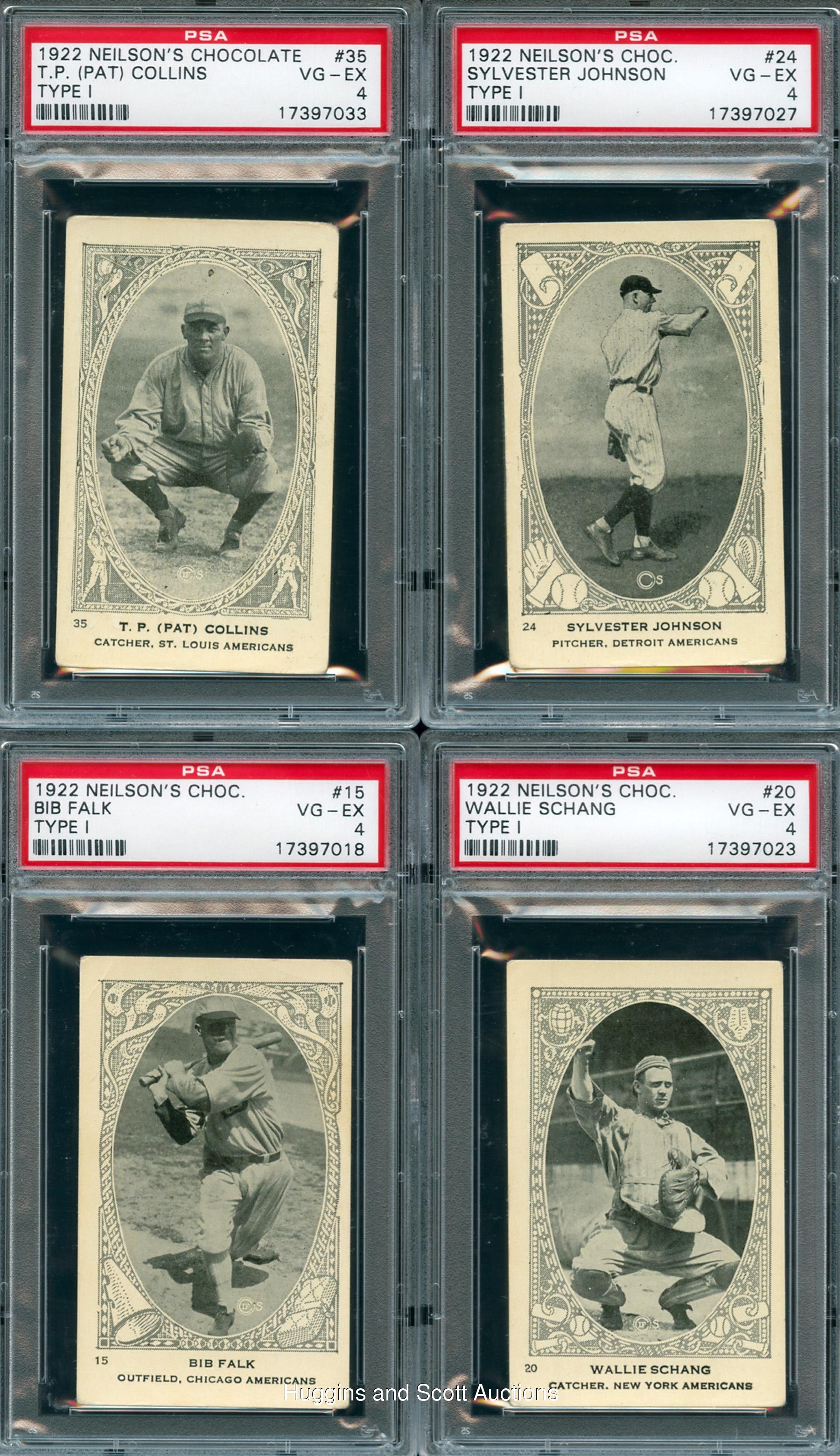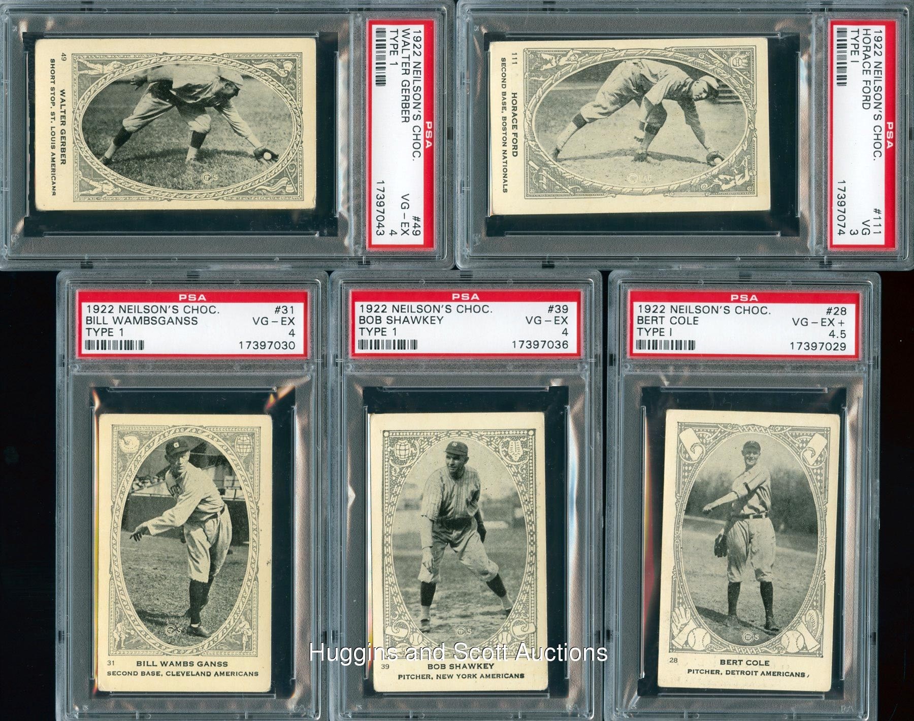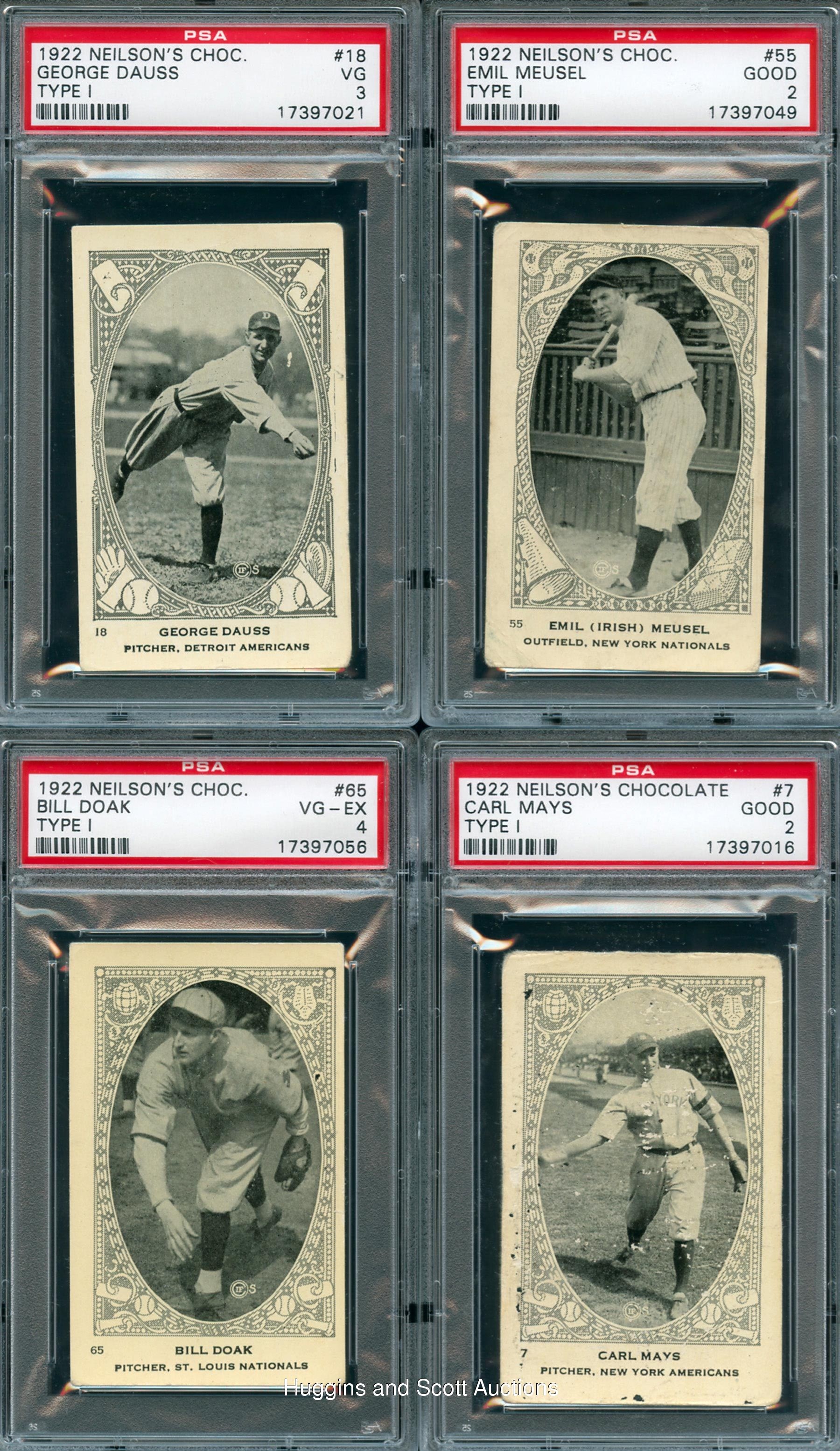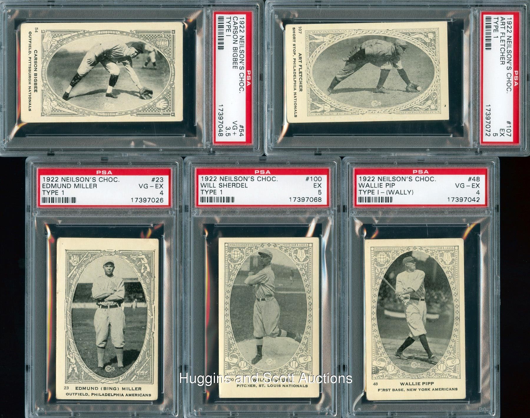 Constituting nearly 25% of all those graded by PSA, this 1922 V61-1 Neilson’s Chocolate partial set of (69/120) is a sight to behold. Issued in packages of “Big League Bars” in Canada, when found, these difficult samples typically display reverse damage, however, none of these contain any back damage. Additionally, the population report confirms single digit submissions for each card, many of which are the highest or only graded. Included are PSA 5: (2 cards, both only graded) with #100 Sherdel, #107 Fletcher; PSA 4.5: #28 Cole; PSA 4: (21 cards, all highest or only graded, unless noted) with #15 Falk, #19 Pillette, #20 Schang, #23 Miller, #24 S. Johnson (one better), #31 Wambsganss, #35 P. Collins, #39 Shawkey, #48 Pipp, #49 Gerber, #51 Ellerbe, #56 Stock, #57 Cooper, #58 Griffith, #65 Doak, #75 J. Smith (one better), #78 Pinelli, #93 Nehf (two better), #94 Snyder, #104 Rapp (one better), #116 Caveney; PSA 3.5: #54 Bigbee (highest graded); PSA 3: (23 cards) with #3 Zachary (highest graded), #21 Woodall (only graded), #33 Veach (none better), #46 Menosky (highest graded), #50 Gharrity (none better), #53 Hauser, #67 Bohne, #105 O. Grimes (only graded), #110 Hollocher (none better), #112 Cunningham (none better); PSA 2: (18 cards) with #4 Bush, #7 Mays, #17 Rigney, #25 Severeid (only graded), #40 Shocker (none better), #52 K. Williams (only graded), #72 Luque and #120 Ring (only graded). For a complete list of cards, please visit our website. PSA 5: (2 cards, both only graded) with #100 Sherdel, #107 Fletcher; PSA 4.5: #28 Cole; PSA 4: (21 cards, all highest or only graded, unless noted) with #15 Falk, #19 Pillette, #20 Schang, #23 Miller, #24 S. Johnson (one better), #31 Wambsganss, #35 P. Collins, #39 Shawkey, #48 Pipp, #49 Gerber, #51 Ellerbe, #56 Stock, #57 Cooper, #58 Griffith, #65 Doak, #75 J. Smith (one better), #78 Pinelli, #93 Nehf (two better), #94 Snyder, #104 Rapp (one better), #116 Caveney; PSA 3.5: #54 Bigbee (highest graded); PSA 3: (23 cards) with #3 Zachary (highest graded), #18 Dauss, #21 Woodall (only graded), #22 O’Neill, #33 Veach (none better), #34 Sheely, #41 McManus, #43 S. Jones, #45 Mostil, #46 Menosky (highest graded), #50 Gharrity (none better), #53 Hauser, #59 Henline, #61 Wrightstone, #67 Bohne, #68 Hamilton, #77 Donohue, #99 Daubert, #101 DeBerry, #105 O. Grimes (only graded), #110 Hollocher (none better), #111 Ford, #112 Cunningham (none better); PSA 2: (18 cards) with #2 Tobin, #4 Bush, #5 Blue, #6 Walker (only graded), #7 Mays, #17 Rigney, #25 Severeid (only graded), #36 F. Davis, #38 B. Harris, #40 Shocker (none better), #52 K. Williams (only graded), #55 E. Meusel, #60 Hargrave, #66 Callaghan, #72 Luque, #83 Wingo, #114 Schultz, #120 Ring (only graded); PSA 1.5: (2 cards) with #1 Burns, #10 Robertson; PSA 1: #16 Uhle