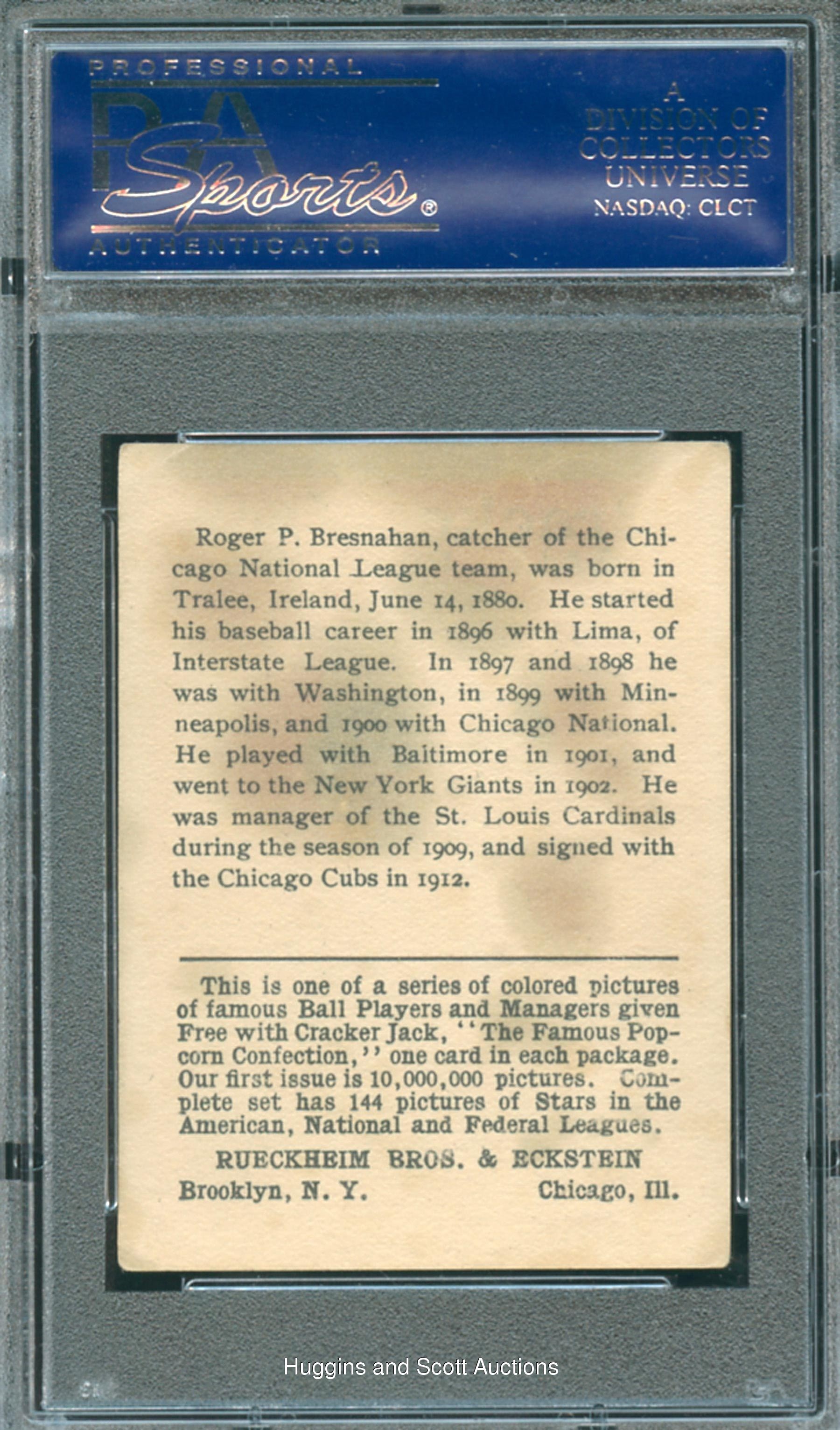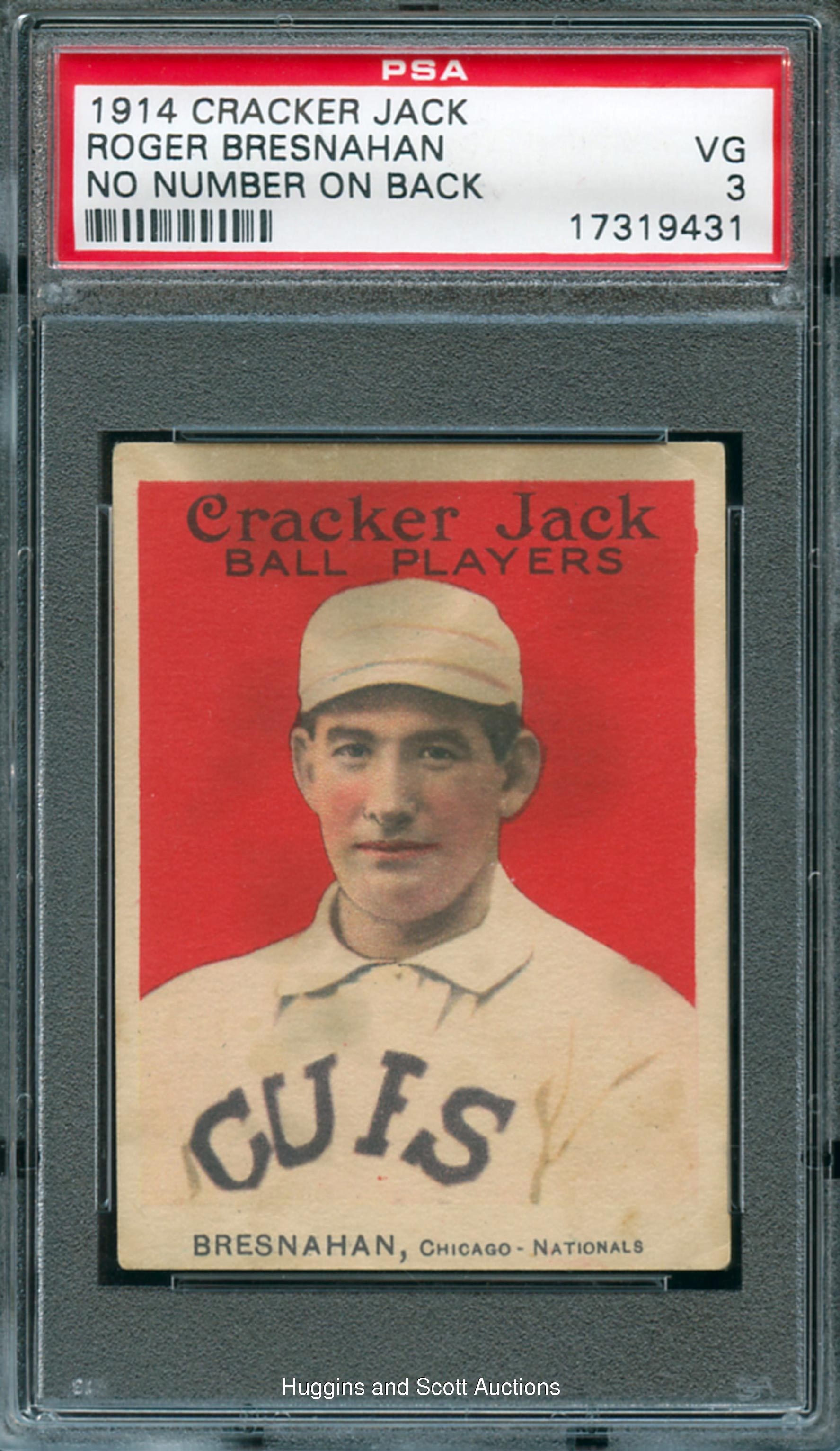 Graded VG 3 by PSA. Presented is a gorgeous 1914 Cracker Jack Roger Bresnahan (no number) variation. As one of the “first issue of 10,000,000 pictures,” only seventeen similar copies have been registered with the third-party service. This portrait of the Hall of Fame backstop emerges from a radiant red backdrop. This crease-free sample with evenly worn corners has extensive caramel discoloration common to the issue. One of two examples at the grading tier with only six better.