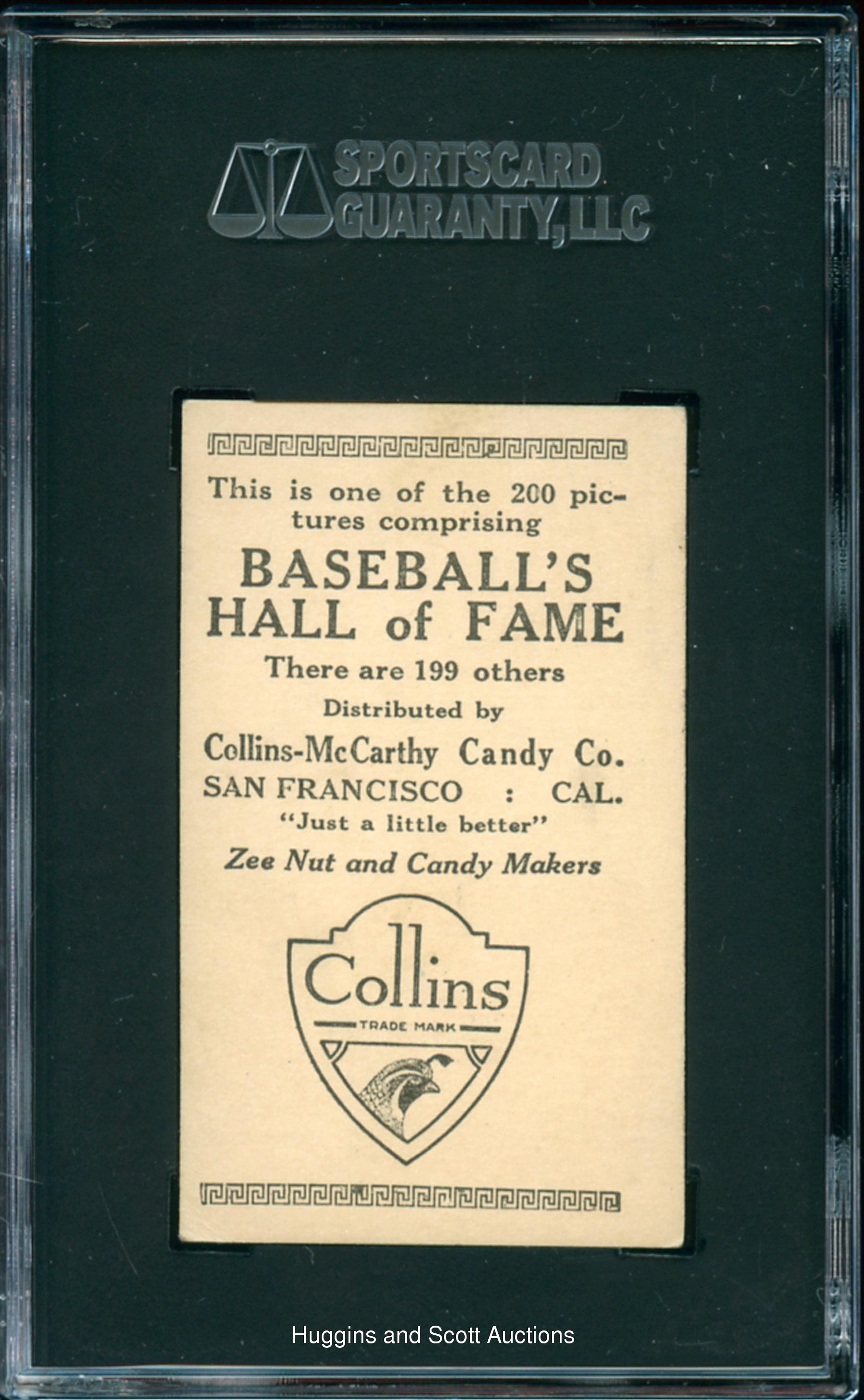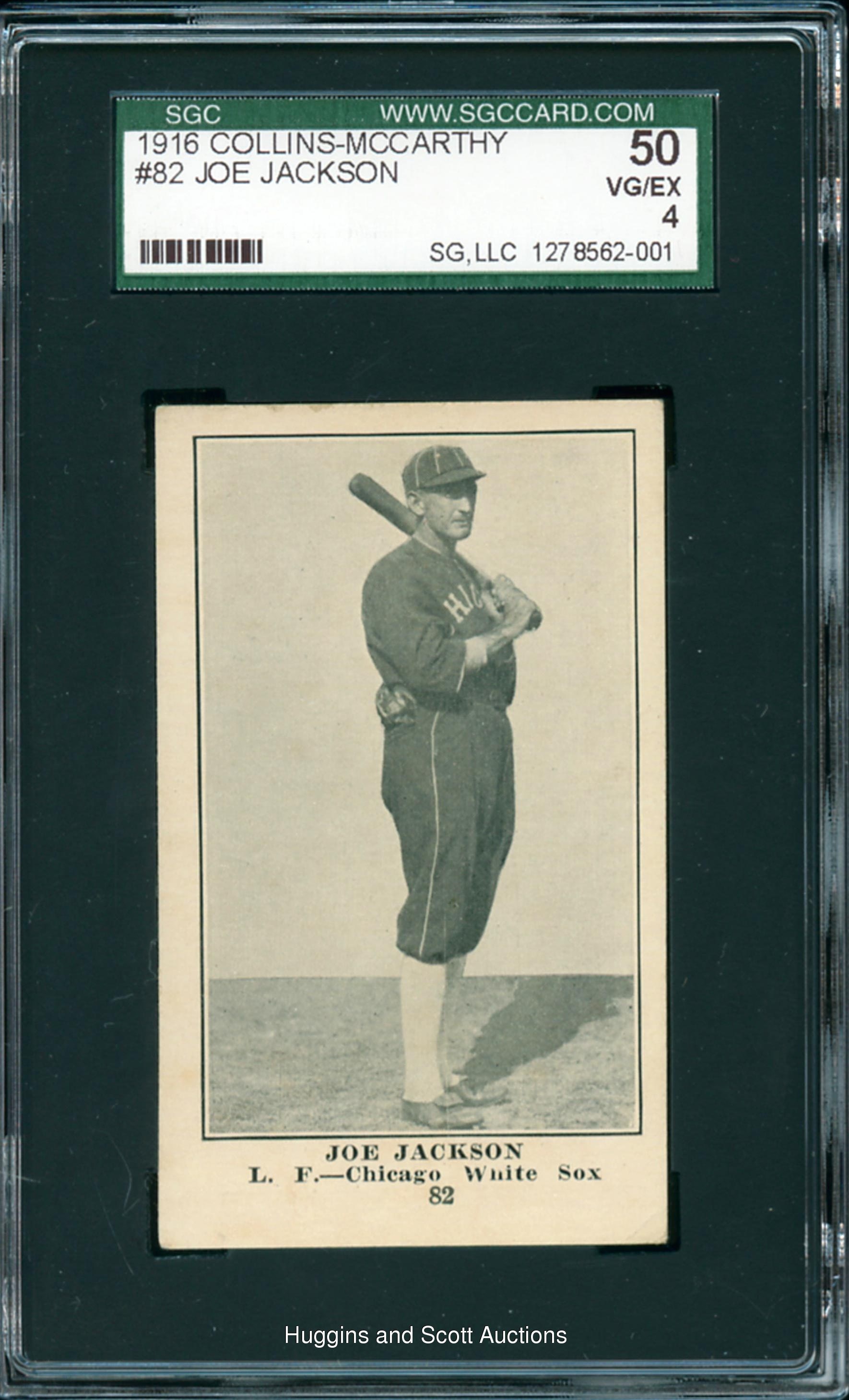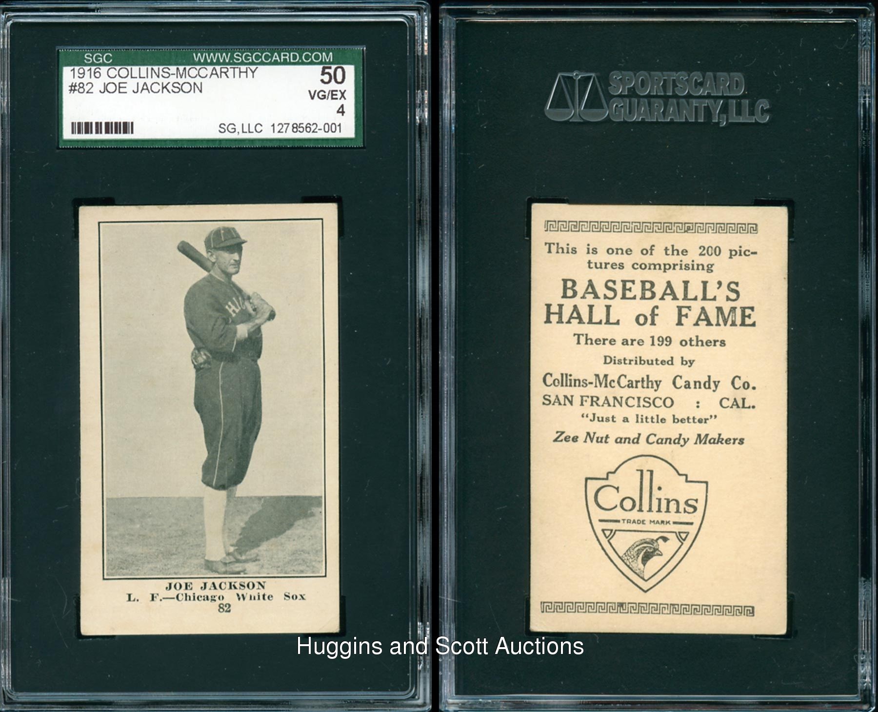 While uncertainties, apocryphal accounts and resultant arguments will forever loom regarding "Shoeless" Joe Jackson's role in the 1919 Black Sox disgrace, the fallen hero's astonishing numbers and the offered 1916 Collins-McCarthy #82 card are not subject to debate. Encapsulated and graded 50 VG-EX 4 by SGC, this Candy Co. specimen is one of two at its plateau with none graded higher by the esteemed service. Crisp imagery and a clean reverse are alluring attributes of this Deadball Era treasure, while a tiny crease in the lower right corner and very minor flaking along the top border account for the technical assessment.
